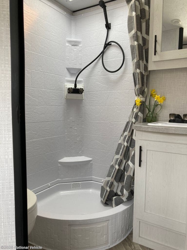 At the rear of the trailer, the spacious full bathroom features a shower, toilet, and vanity with sink, offering the privacy and convenience of home while on the road.