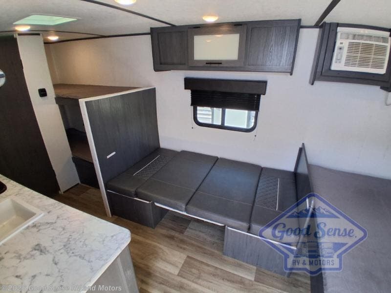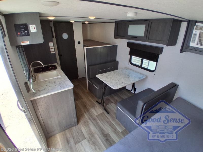 A perfect trailer for your family of three to five featuring a set of bunk beds for the kids or guests, a queen bed up front for you, and the booth dinette can be converted to sleep one or two more depending on size. This unit is cozy and convenient providing you just what you need to enjoy a little adventure away from home. For meals, there is a two burner cooktop and sink, plus a 3.3 cu. ft. 12V refrigerator for your perishables. You will all appreciate the convenience of having your own private bath so that you don't need to use the campground facilities at night. You will also enjoy spending time outside with an 8' power awning to provide even more living space outdoors!