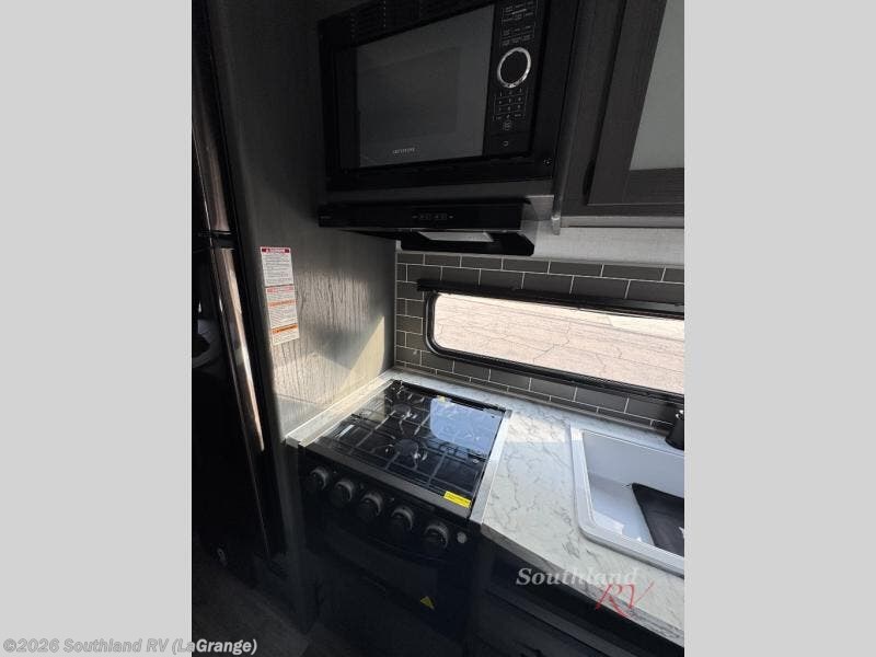 Load up for a fun weekend or long vacation with this trailer in tow! Whether you camp close or far away, you will have eight to nine sleeping spaces thanks to the residential queen bed in the semi-private bedroom, the double-size bunks near the rear corner bathroom, and the furniture in the middle. Everyone can take turns getting dressed in either the full bathroom, or front bedroom once the privacy curtain is closed. There is plenty of storage found throughout in the closets, overhead cabinets, and along the exterior in the pass-through compartment for those longer items. And the 14' power awning with LED lights gives you an outdoor living space protected from the elements, so just add your own camping chairs and such.