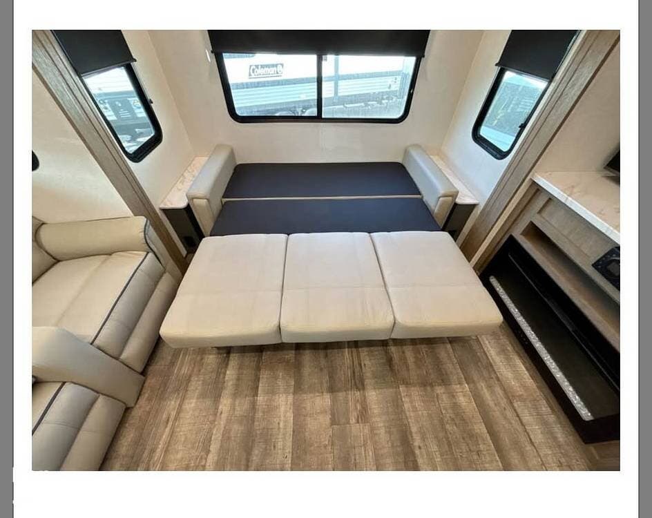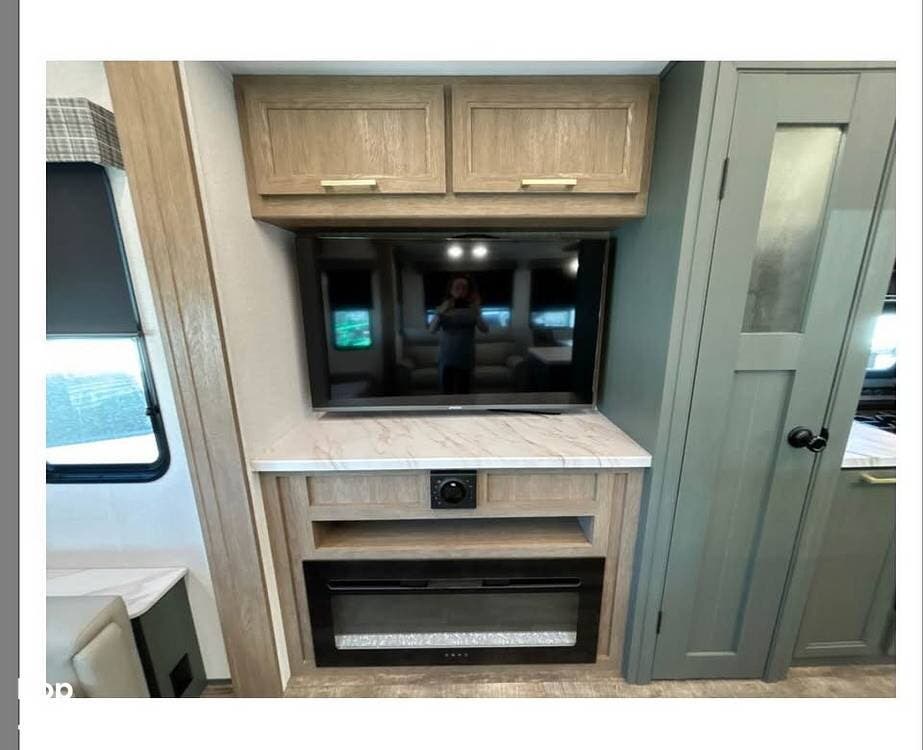 Inside, the layout is designed for easy socializing and relaxation. With three slide-outs, the living area opens to reveal designer furnishings, a cozy electric fireplace, and an entertainment center perfect for unwinding after a day outdoors.