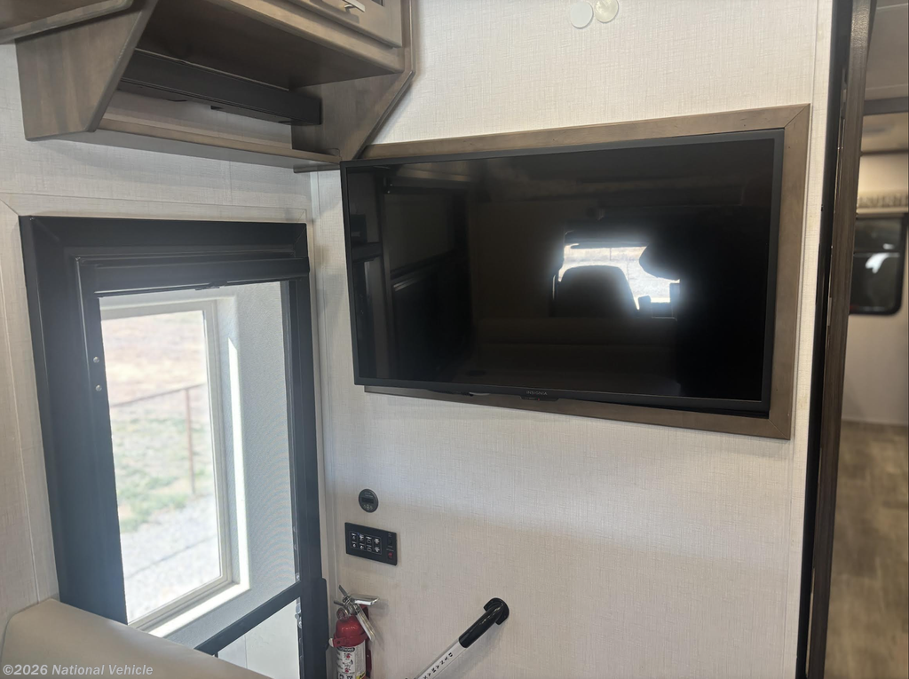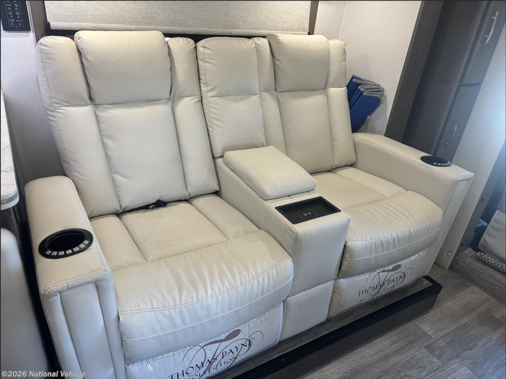Inside, the Europa offers a modern residential feel with premium finishes and a smart floorplan. The living area features theatre seating with heat and massage, a dinette that converts into a bed, and a large TV for relaxing evenings. A second TV is located in the bedroom, plus an outdoor TV for entertainment under the awning.