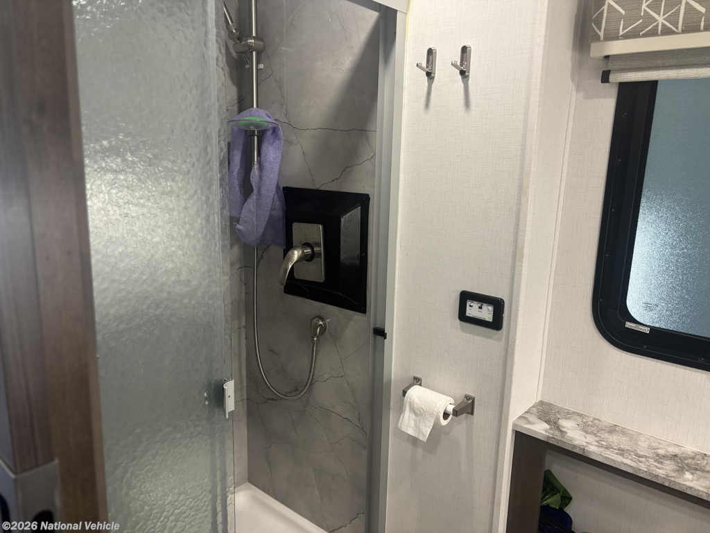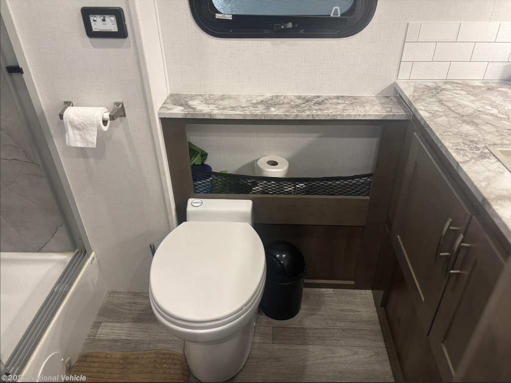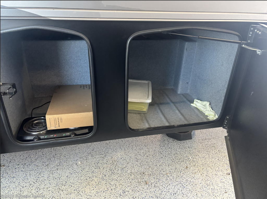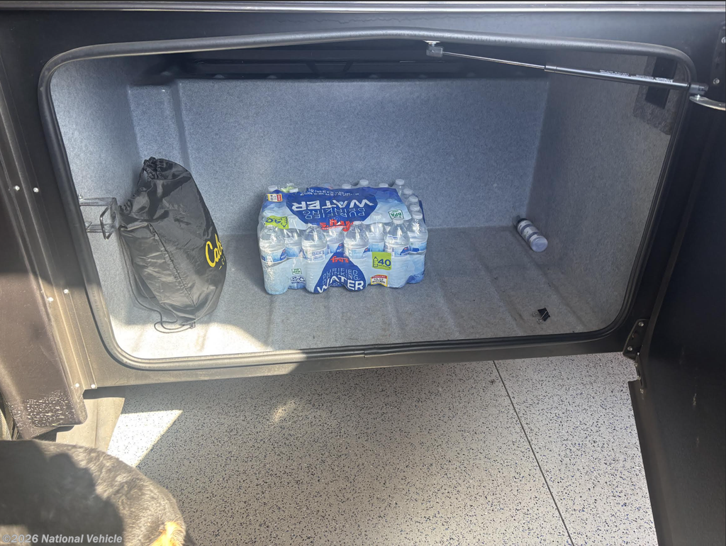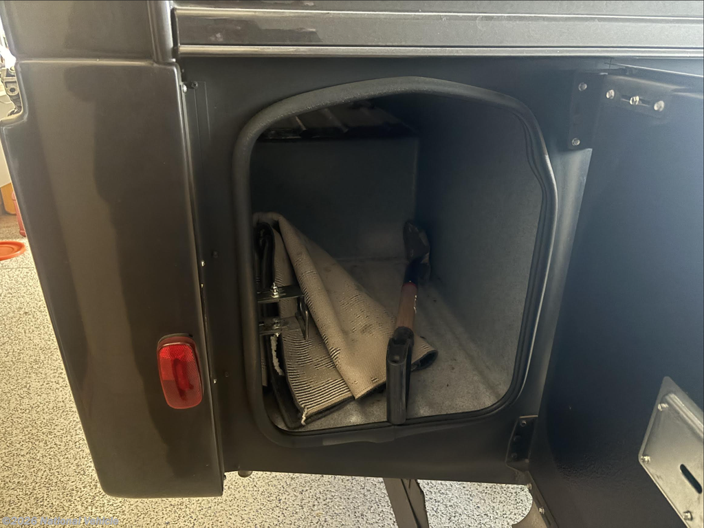 The exterior features custom full body paint protected with Diamond Shield, dark tinted frameless windows, and a rear rock guard. Setup at camp is effortless thanks to automatic 4-point hydraulic leveling, power entry steps, and an armless patio awning with LED lighting and motion-activated retraction.
