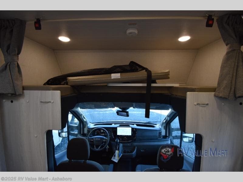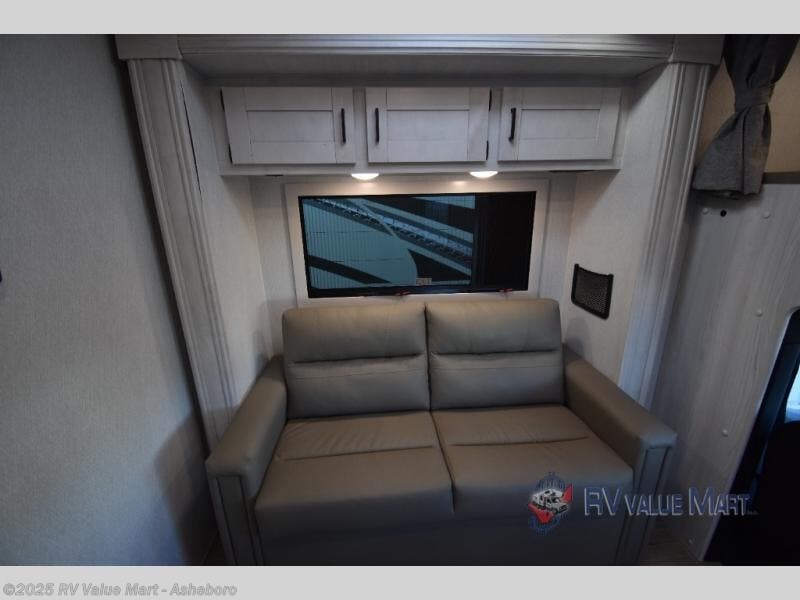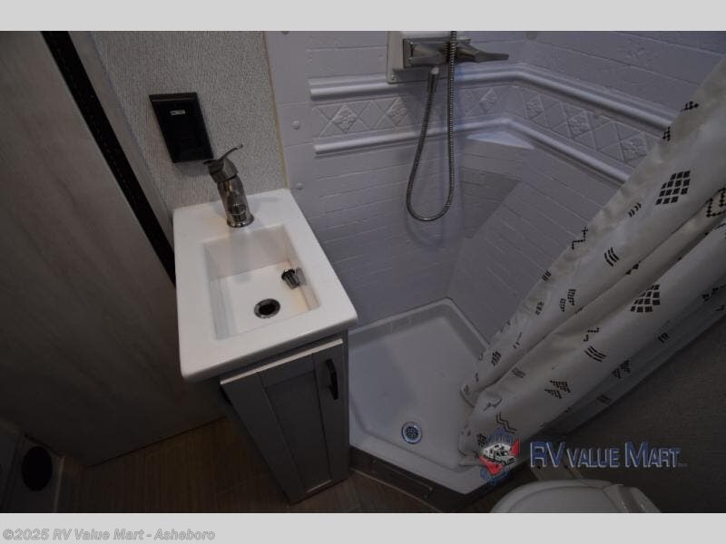 Whether you are traveling to your favorite campground or across the country, you are going to love this motorhome. You will have versatility in this coach to travel with a friend or your sweetheart with two twin beds that can easily convert to a king bed if you like. Each bed is 36" x 73" with a nightstand between and overhead storage along both sides and across the rear of the unit providing plenty of space for your things. There is also a wardrobe off the foot of the twin that is on the curbside. For relaxing and dining a slide out sofa with removeable table, and more overhead storage here. The kitchen is opposite the slide on the door side and features a round hidden sink with solid surface cover for added prep space, a 12-volt refrigerator for your perishables, and a microwave oven and induction cooktop for easy meals as you travel. When you want to get cleaned up, a bath with an angled shower, toilet, and lav sink, plus medicine cabinet for your toothbrush and razor. The doors both open out so you can actually create a more open space when in the bathroom making it the width of the unit.