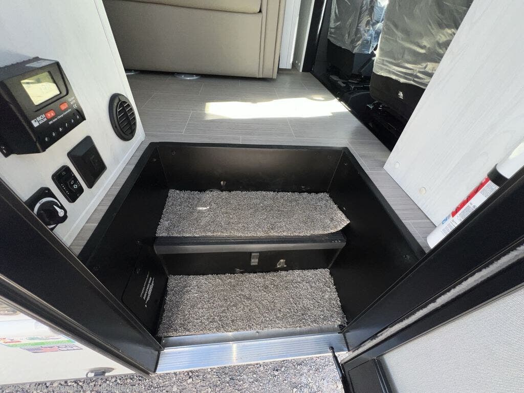 Whether you are traveling to your favorite campground or across the country, you are going to love this motorhome. You will have versatility in this coach to travel with a friend or your sweetheart with two twin beds that can easily convert to a king bed if you like. Each bed is 36" x 73" with a nightstand between and overhead storage along both sides and across the rear of the unit providing plenty of space for your things. There is also a wardrobe off the foot of the twin that is on the curbside. For relaxing and dining a slide out sofa with removeable table, and more overhead storage here. The kitchen is opposite the slide on the door side and features a round hidden sink with solid surface cover for added prep space, a 12-volt 6 cu. ft. refrigerator for your perishables, and a microwave oven and induction cooktop for easy meals as you travel. When you want to get cleaned up, a bath with an angled shower, toilet, and sink, plus medicine cabinet for your toothbrush and razor. The doors both open out so you can actually create a more open space when in the bathroom making it the width of the unit.