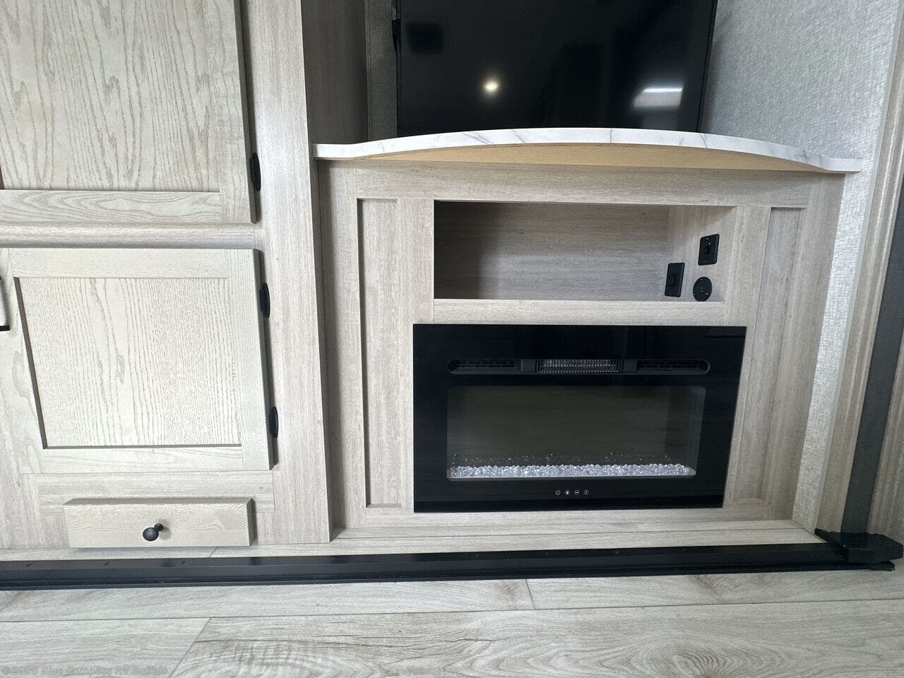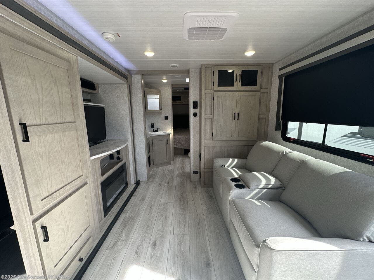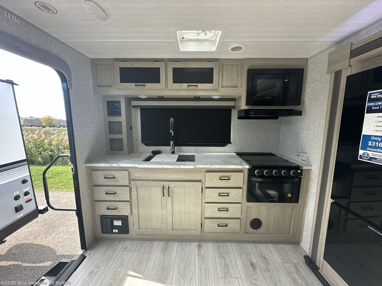 You're going to love this rear kitchen travel trailer with dual entry doors and a king bed in the front bedroom! The tri-fold sofa can be replaced by optional theater seats, plus there is a telescoping 40" TV with a fireplace for a more at-home feel. The walk-through bath will be easy for everyone to access, and there is a shower skylight here to let more natural light in. This model is also pet-friendly thanks to the pet dish under the refrigerator and the outside spray port to hose them off after a day in the river!