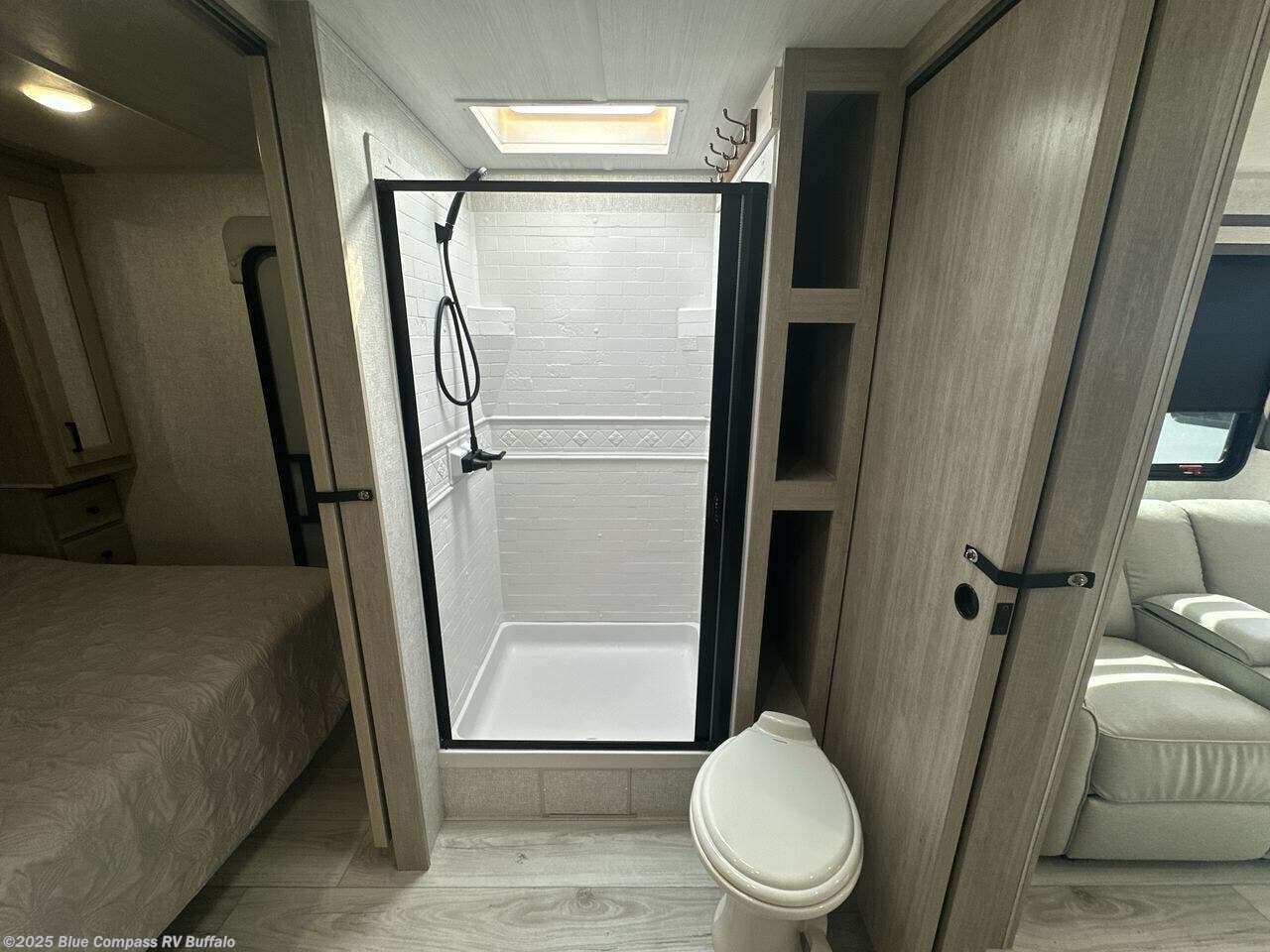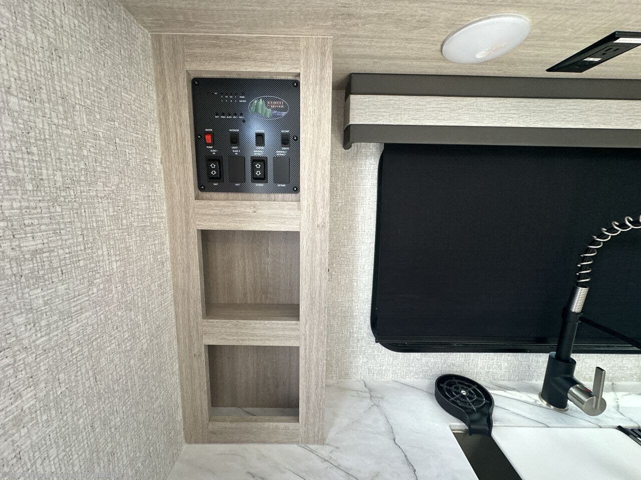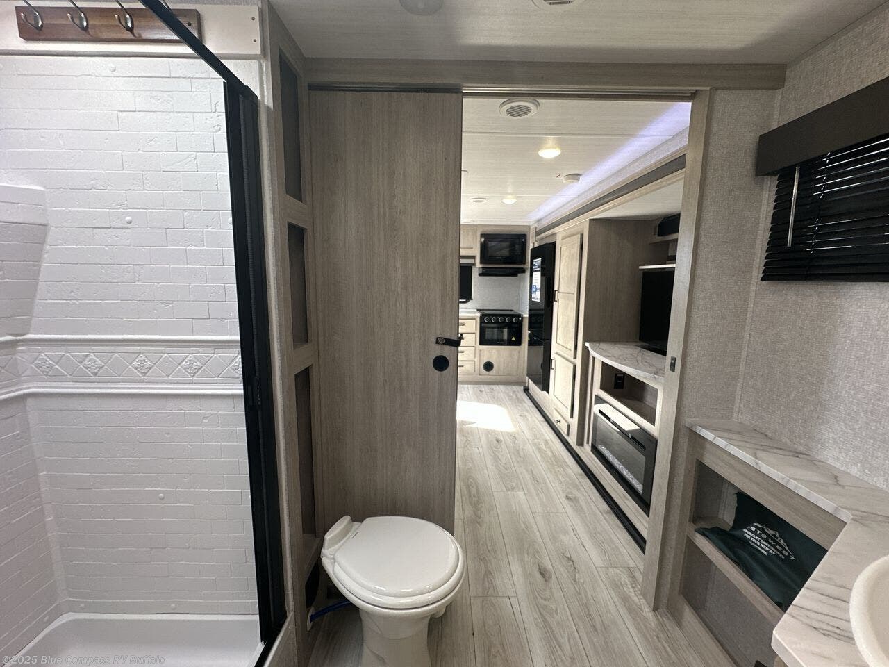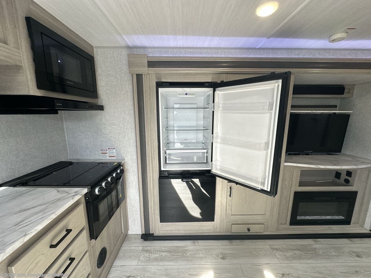 You're going to love this rear kitchen travel trailer with dual entry doors and a king bed in the front bedroom! The tri-fold sofa can be replaced by optional theater seats, plus there is a telescoping 40" TV with a fireplace for a more at-home feel. The walk-through bath will be easy for everyone to access, and there is a shower skylight here to let more natural light in. This model is also pet-friendly thanks to the pet dish under the refrigerator and the outside spray port to hose them off after a day in the river!