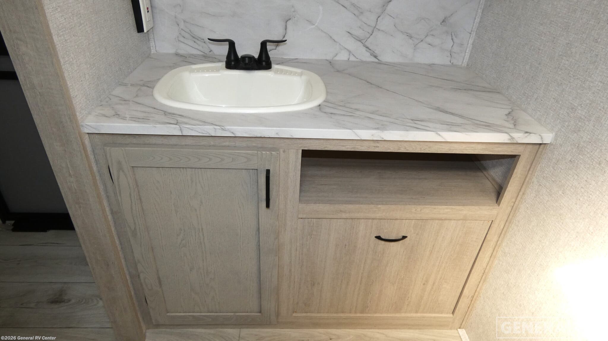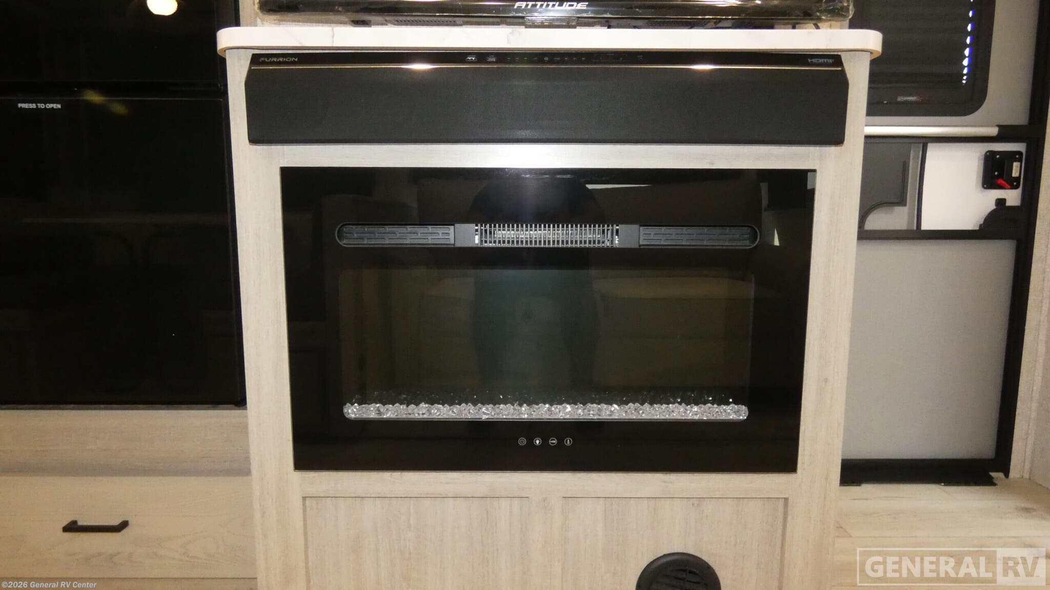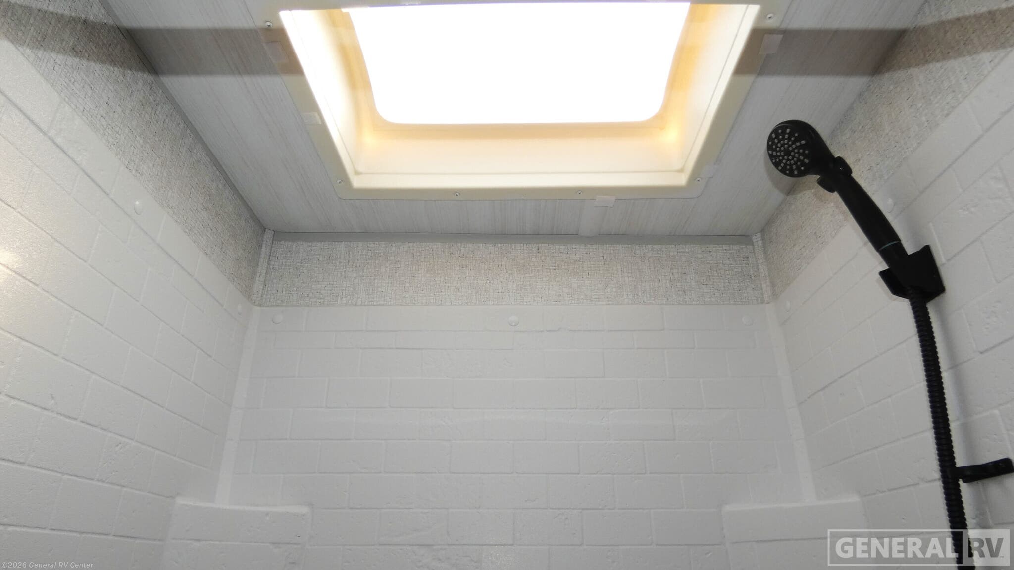 Wow! Check out the spacious full rear bath in this travel trailer for five! You'll appreciate a linen closet here and a shower skylight to let natural light in. Your crew can get comfortable on the tri-fold sofa that sits directly across from the fireplace for a more cozy feel. There is also a booth dinette here with storage space underneath for board games. Head to the kitchen to prepare dinner on the three burner cooktop, and use the countertop extension to cut fresh fruits and vegetables. A front private bedroom with a king bed and dual wardrobes will have you feeling right at home. Start camping today! Each Alta travel trailer or toy hauler by EAST TO WEST is constructed with a 5" vacuum bonded roof, an enclosed and heated underbelly, and diamond plate front rock guard for added protection. Outside, you'll find marine-grade exterior speakers, a universal docking station, and back-up camera prep that can be added to make maneuvering in and out of campgrounds easier than ever. Inside, there are 4k interior LED lights, solid pressed membrane countertops, black roller shades, and many more interior comforts you are sure to love.