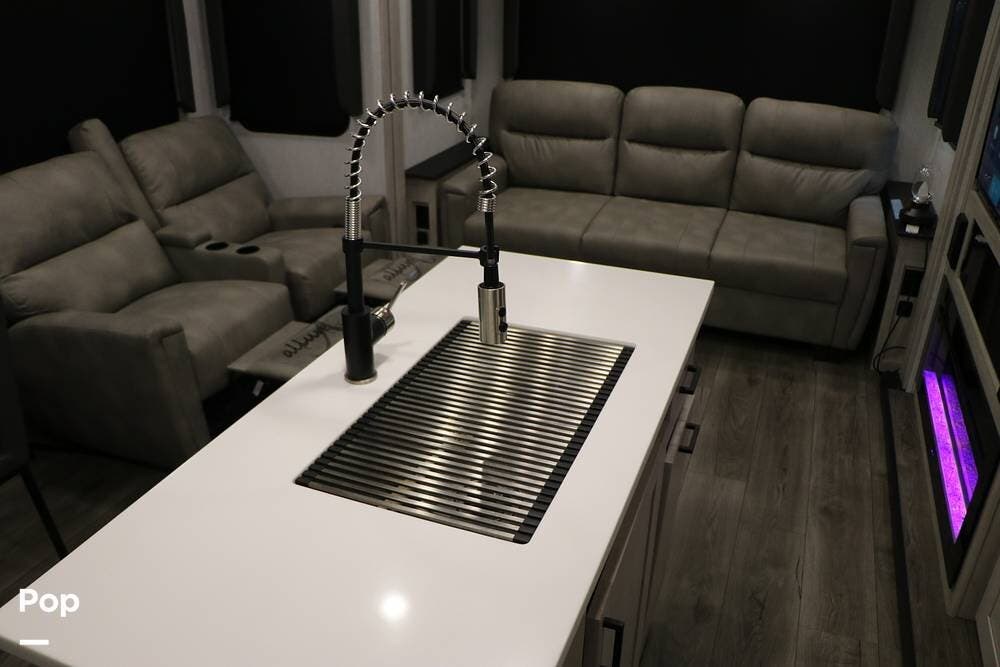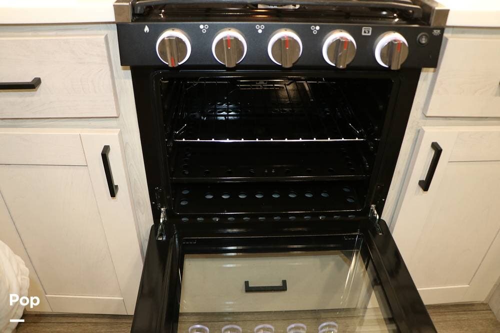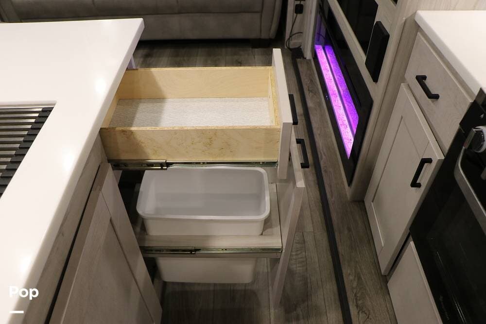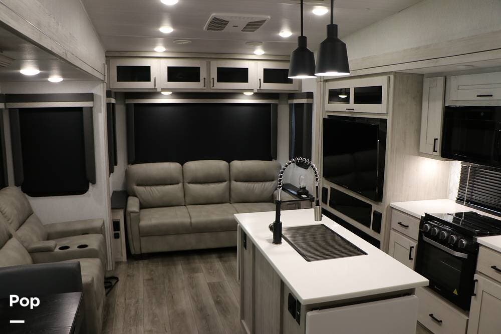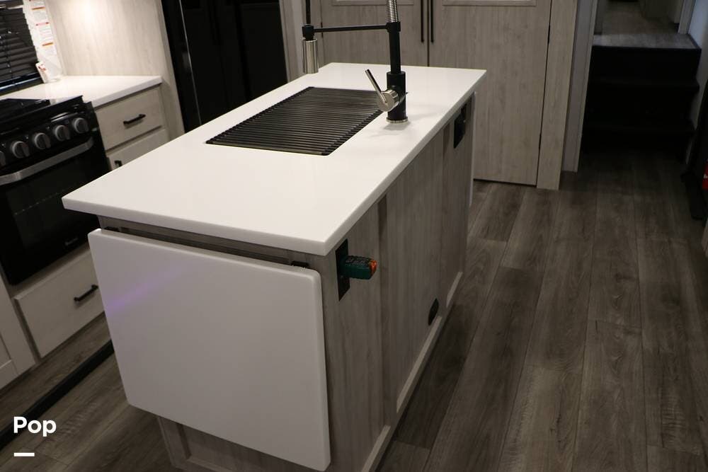 The floorplan is family-friendly, featuring a spacious living and galley area upon entry, with lovely decor in Antique White and Country Sheik Gray, and Solid Surface countertops throughout the RV.