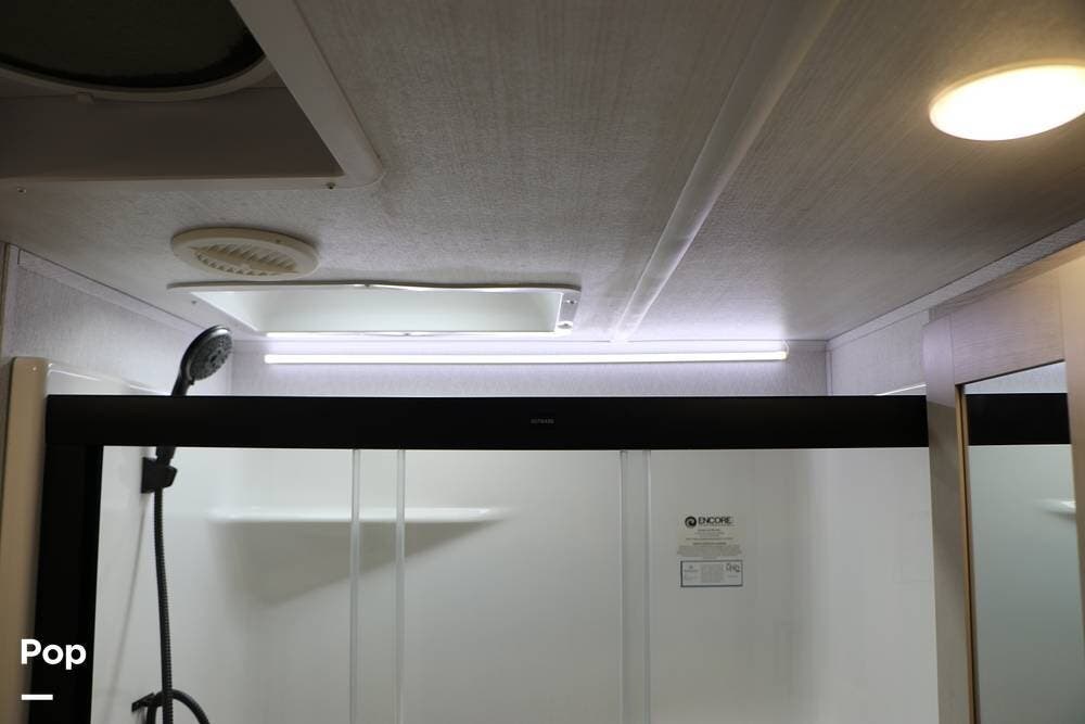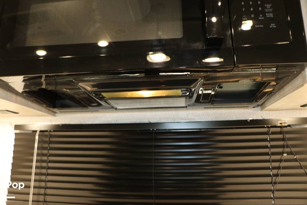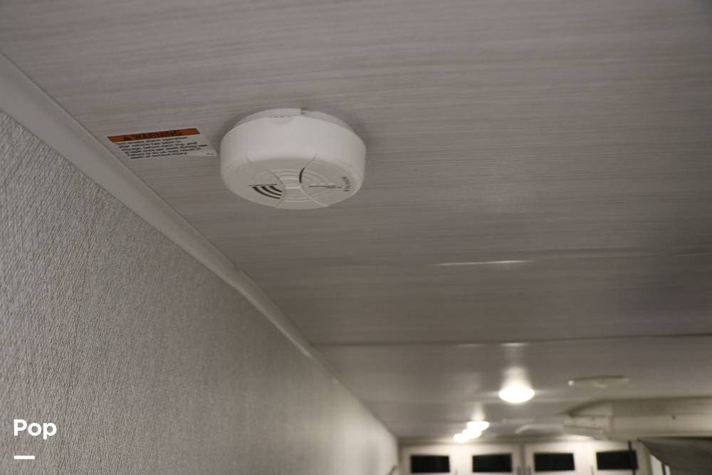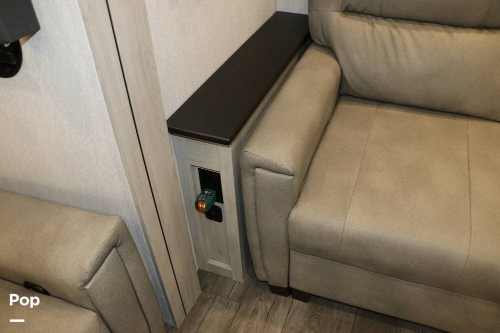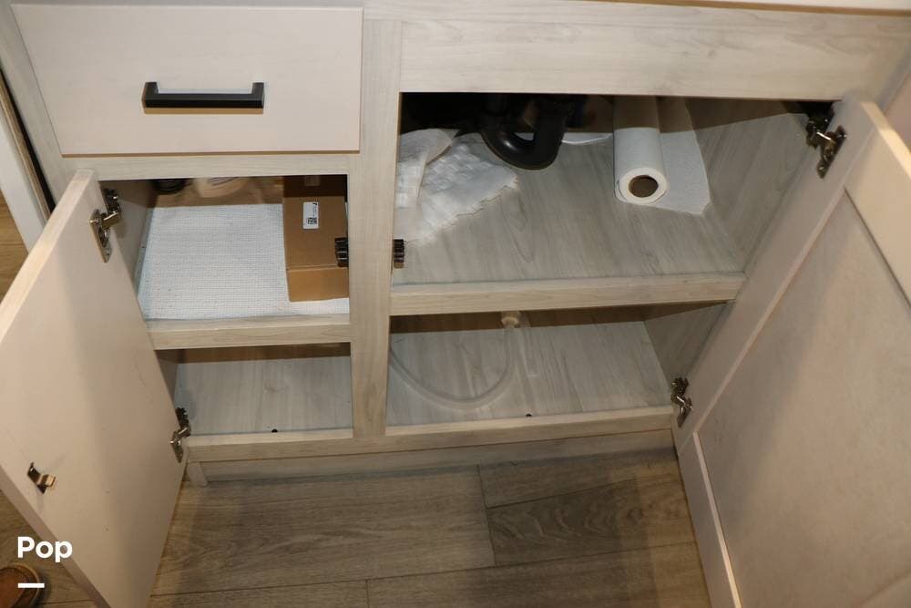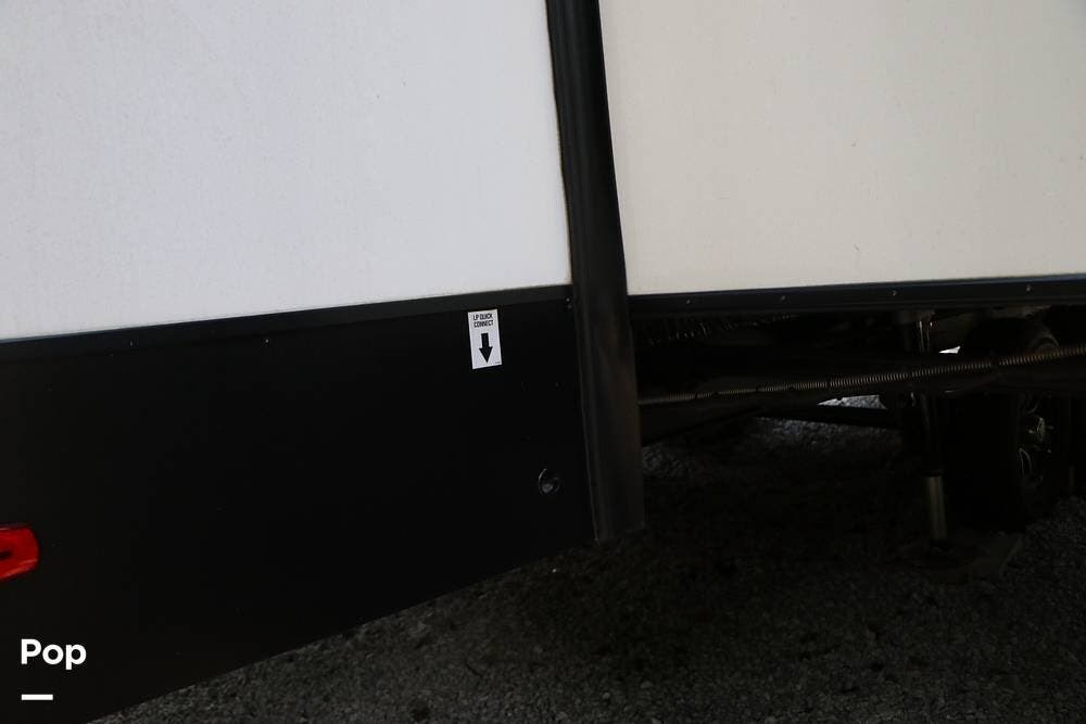 The floorplan is family-friendly, featuring a spacious living and galley area upon entry, with lovely decor in Antique White and Country Sheik Gray, and Solid Surface countertops throughout the RV.