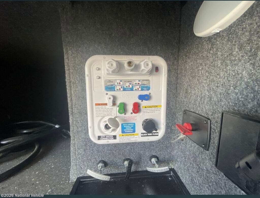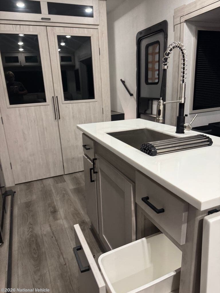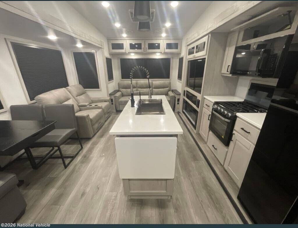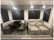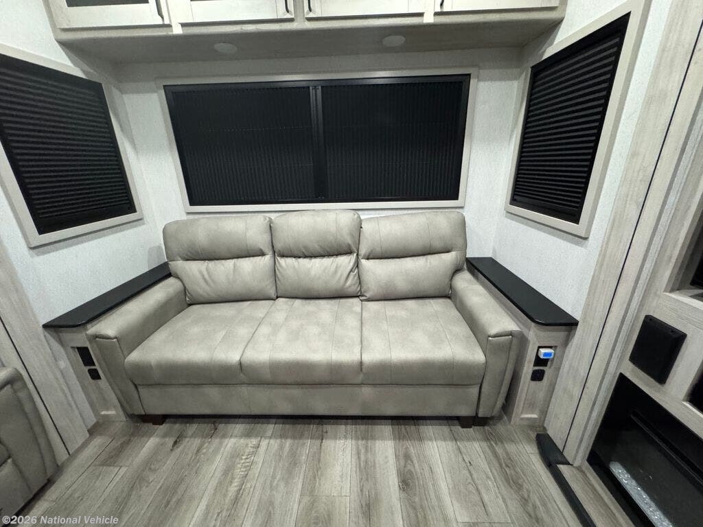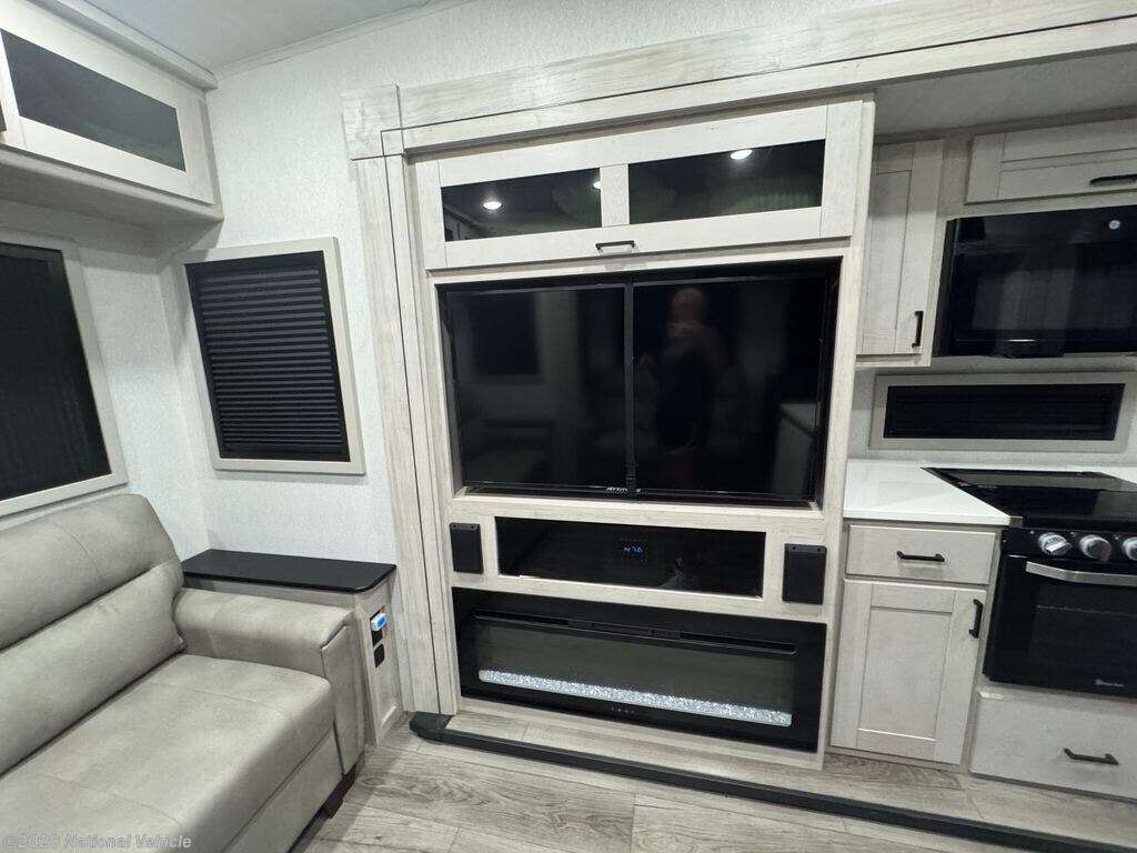 Step inside to discover a bright and welcoming interior highlighted by residential-style cabinetry, energy-efficient LED lighting, and panoramic windows that create a spacious and airy feel. The rear living area features theater seating, a tri-fold sofa, and an entertainment center with a fireplace, providing a cozy retreat for relaxing evenings.