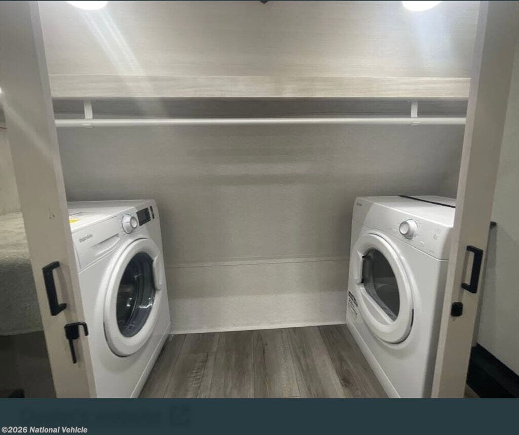 The fully equipped kitchen boasts solid-surface countertops, a residential refrigerator, four-burner cooktop with oven, microwave, and abundant storage, ensuring you can prepare meals with ease. The elegant front master suite offers a comfortable king-size bed, generous wardrobe storage, and washer/dryer, while the full bathroom includes a large shower with glass enclosure, vanity, and linen storage for a touch of at-home convenience.