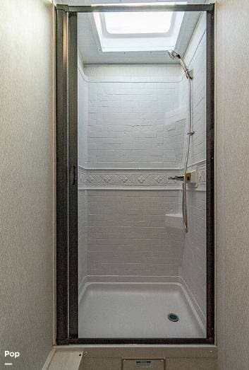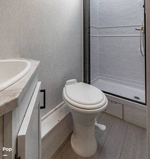 The bathroom provides an enclosed shower, toilet, and sink with a vanity.