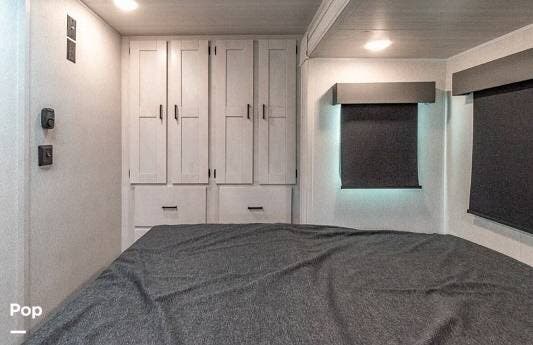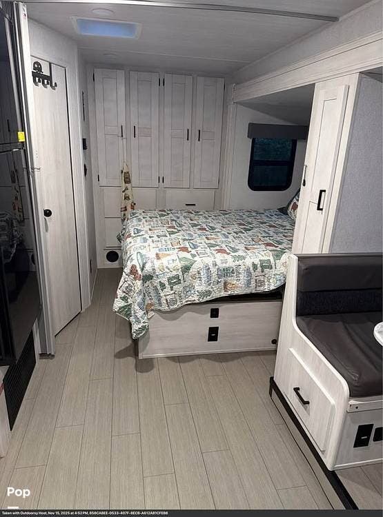 The bedroom has a walk-around queen bed with a large wardrobe closet and dresser storage below.