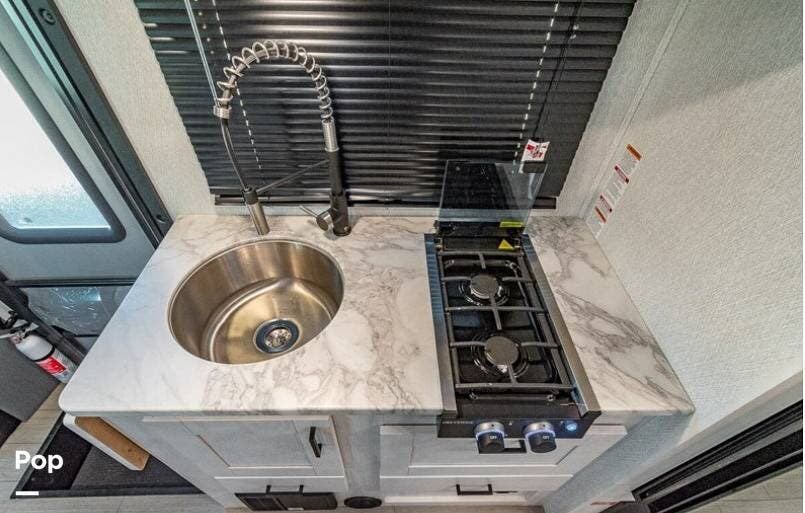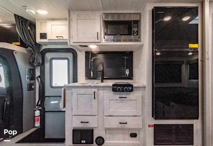 The fully equipped kitchen includes a sink with a flip-up counter on one side for more prep space. There is a Convection Microwave, a two-burner stove, and a large refrigerator. Across is pantry storage.