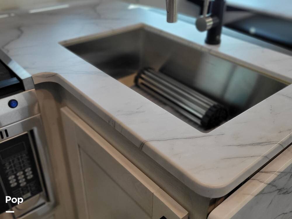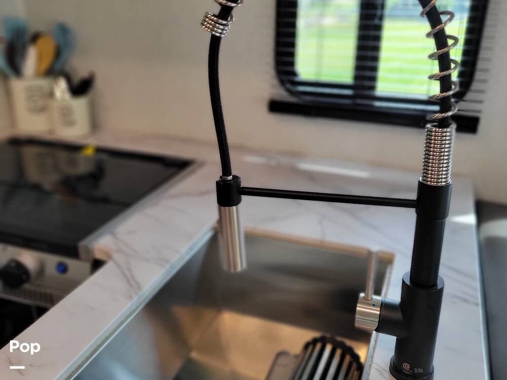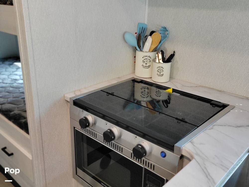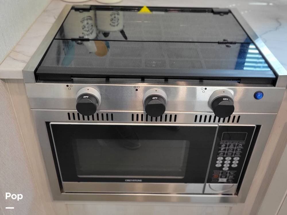 The galley is fully equipped with a three-burner cooktop, a microwave, a deep stainless-steel sink, and a large refrigerator/freezer. A flip-up counter extension adds valuable prep space, and there's plenty of cupboard space for your cooking essentials.