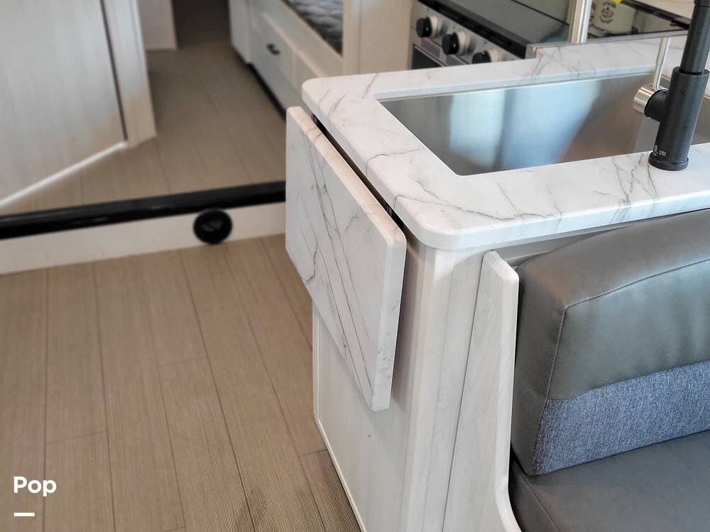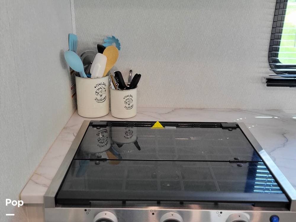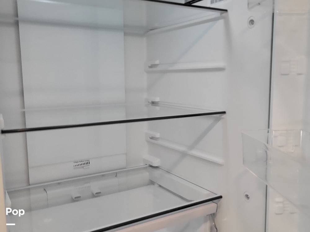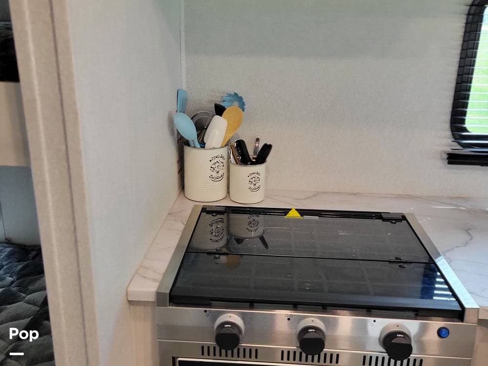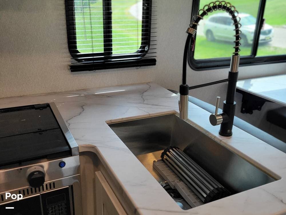 The galley is fully equipped with a three-burner cooktop, a microwave, a deep stainless-steel sink, and a large refrigerator/freezer. A flip-up counter extension adds valuable prep space, and there's plenty of cupboard space for your cooking essentials.