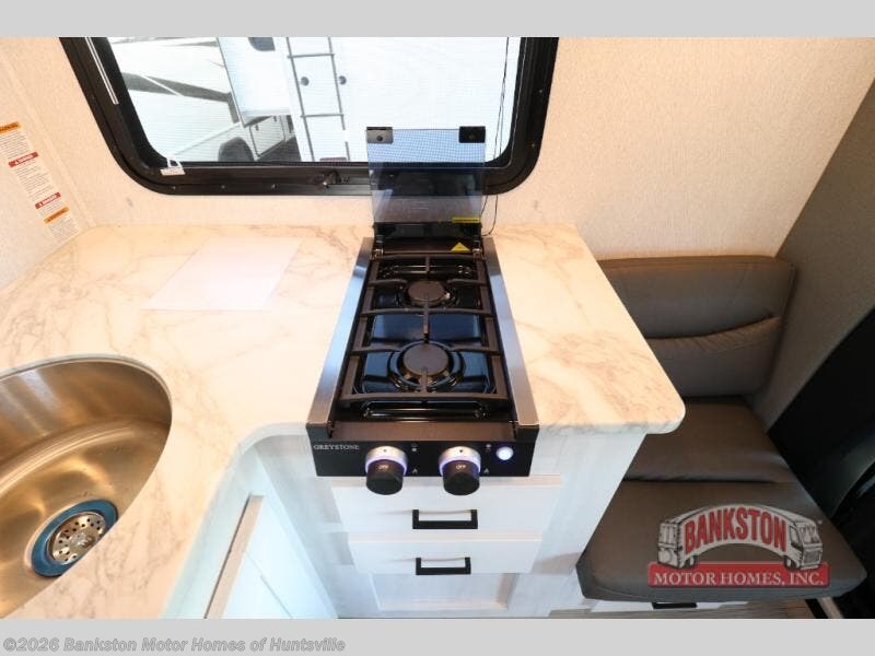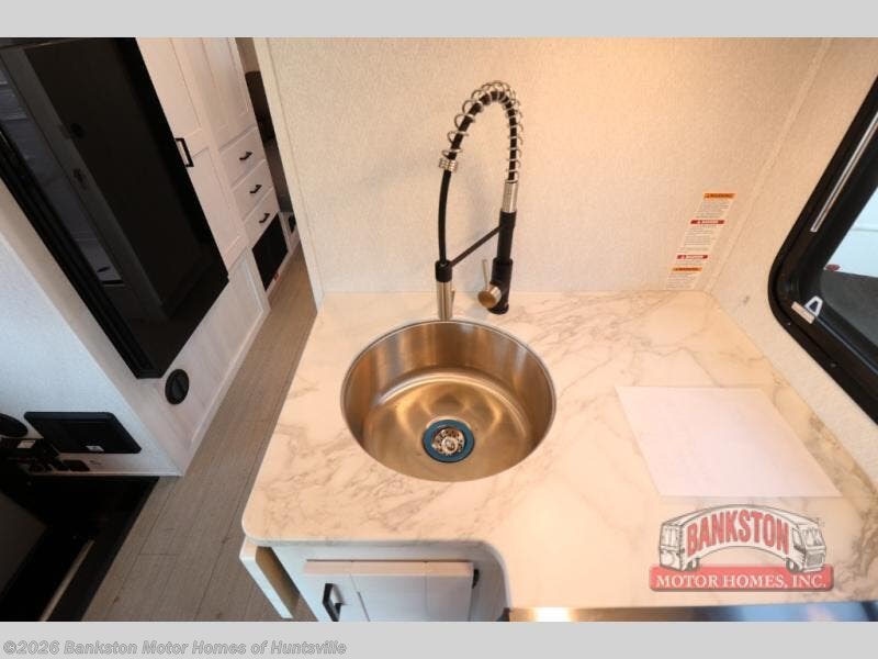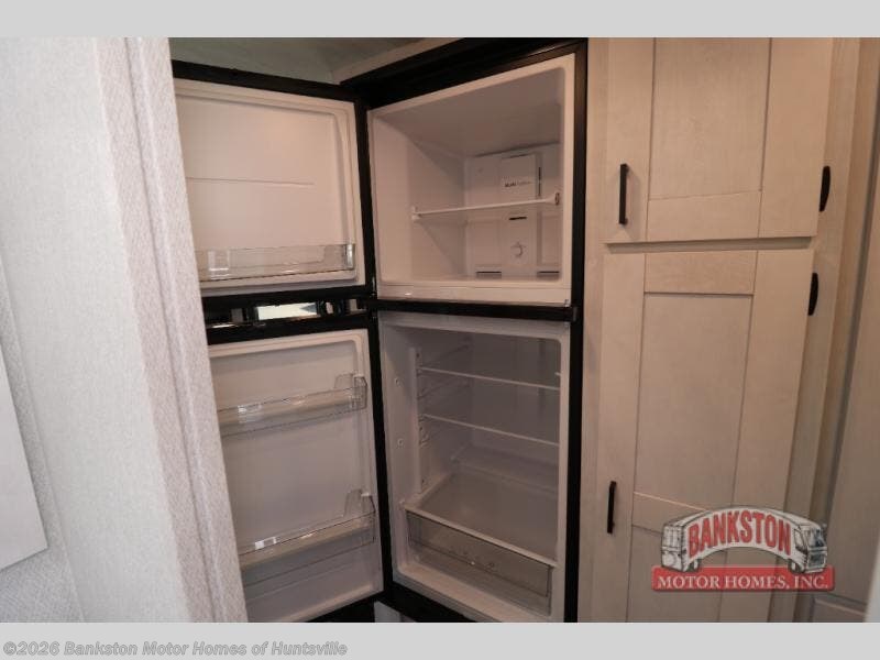 This coach is ultra versatile with its rear L-shaped sofa lounge that will double as your sleeping space at night. There is also a 40" swing arm TV here to watch a movie in bed and a privacy curtain you can close at night if you have guests sleeping on cab-over bunk or 36" sofa. The full bath includes a 24" x 32" shower, a medicine cabinet, plus a 22" slider door to easily get in and out. You'll find a convection microwave in the kitchen area, along with a two burner cooktop, plus a 10.7 cu. ft. 12V refrigerator and a pantry for food storage. There is even TV prep for a 20" TV in this area if your guests want to watch their own shows at night!