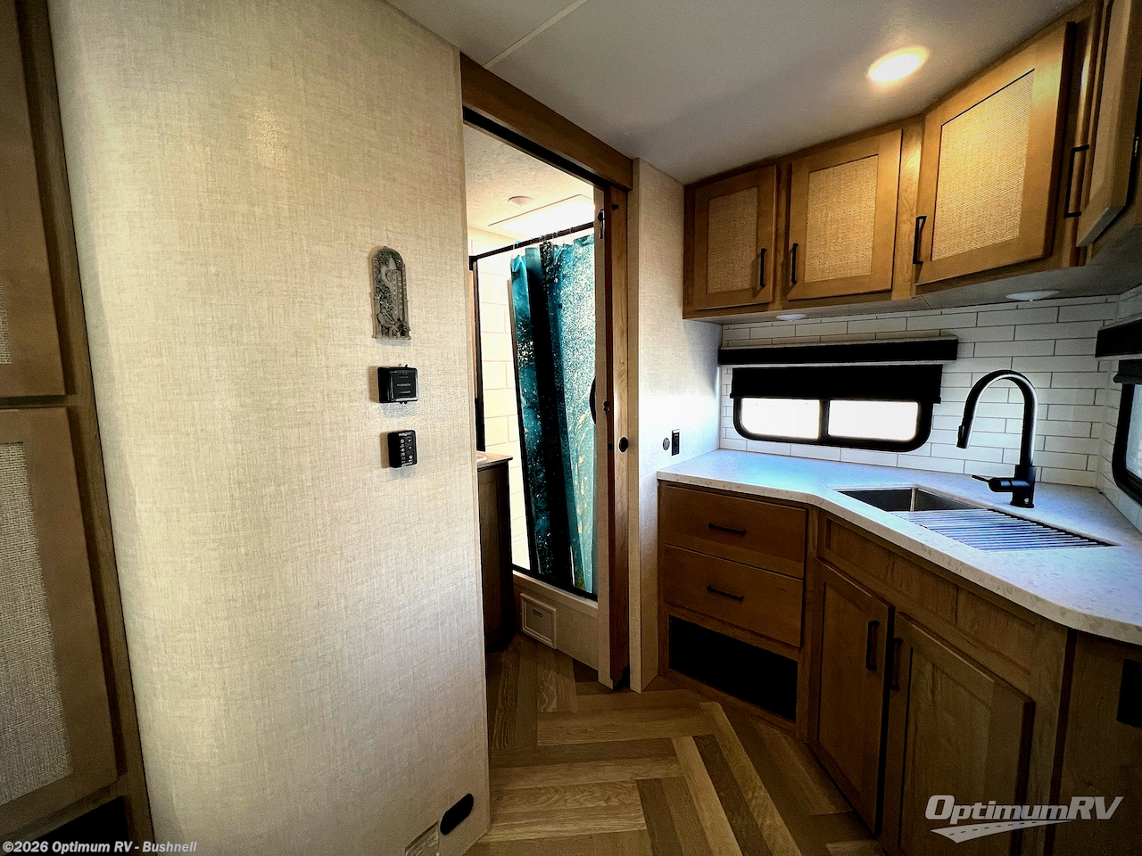 Camping trips just got a whole lot better in this tandem axle, single slide travel trailer! Once you arrive at the campground, you can put out the 18' power awning, grab your camp chairs from the pass-through storage, and relax! When you're getting hungry, head to the rear corner kitchen that includes ample counter space, a two burner cooktop, plus a 10 cu. ft. 12V refrigerator. There is also a pantry to store snacks and paper goods! You can get cozy after dinner on the theater seating that sits directly across from the HDTV for easy viewing, and there is a legless dinette if game night is in order. When you're ready for bed, the queen bed up front will provide a great night's rest, and there is a privacy curtain if you have a guest staying over on the dinette. And don't worry about storage space; this model has you covered with dual bedroom wardrobes, overhead cabinets, and convenient shoe storage!
