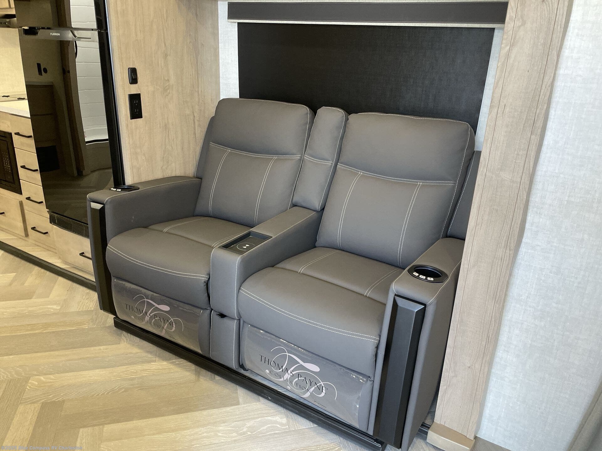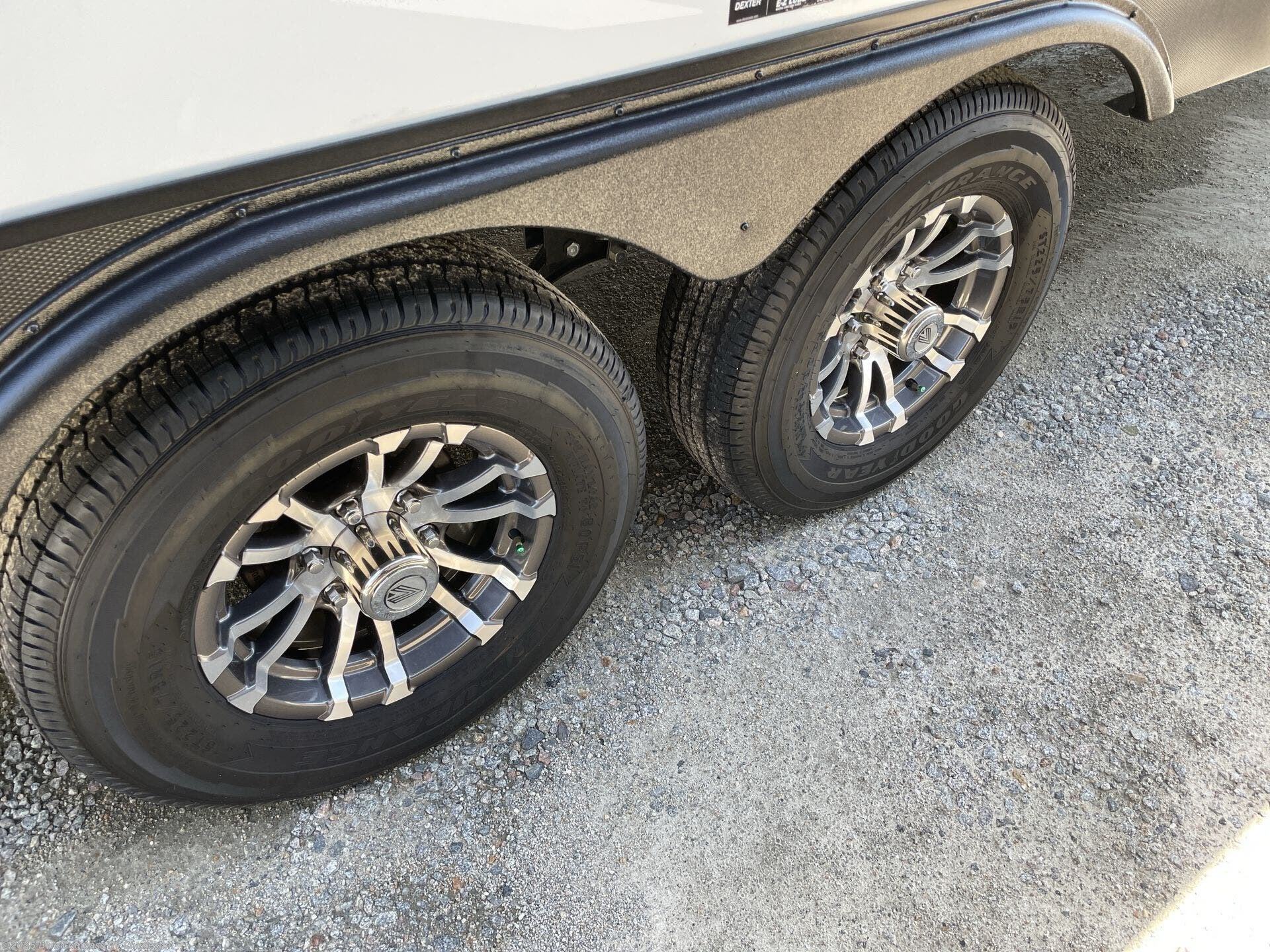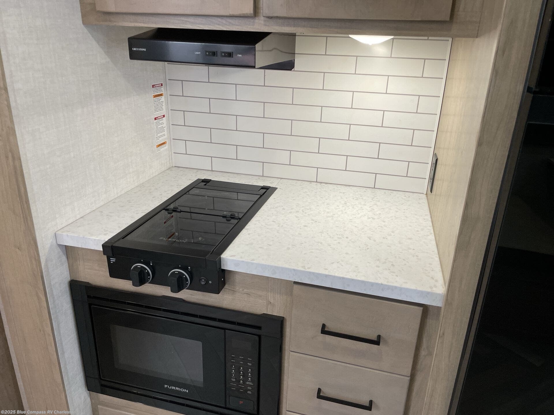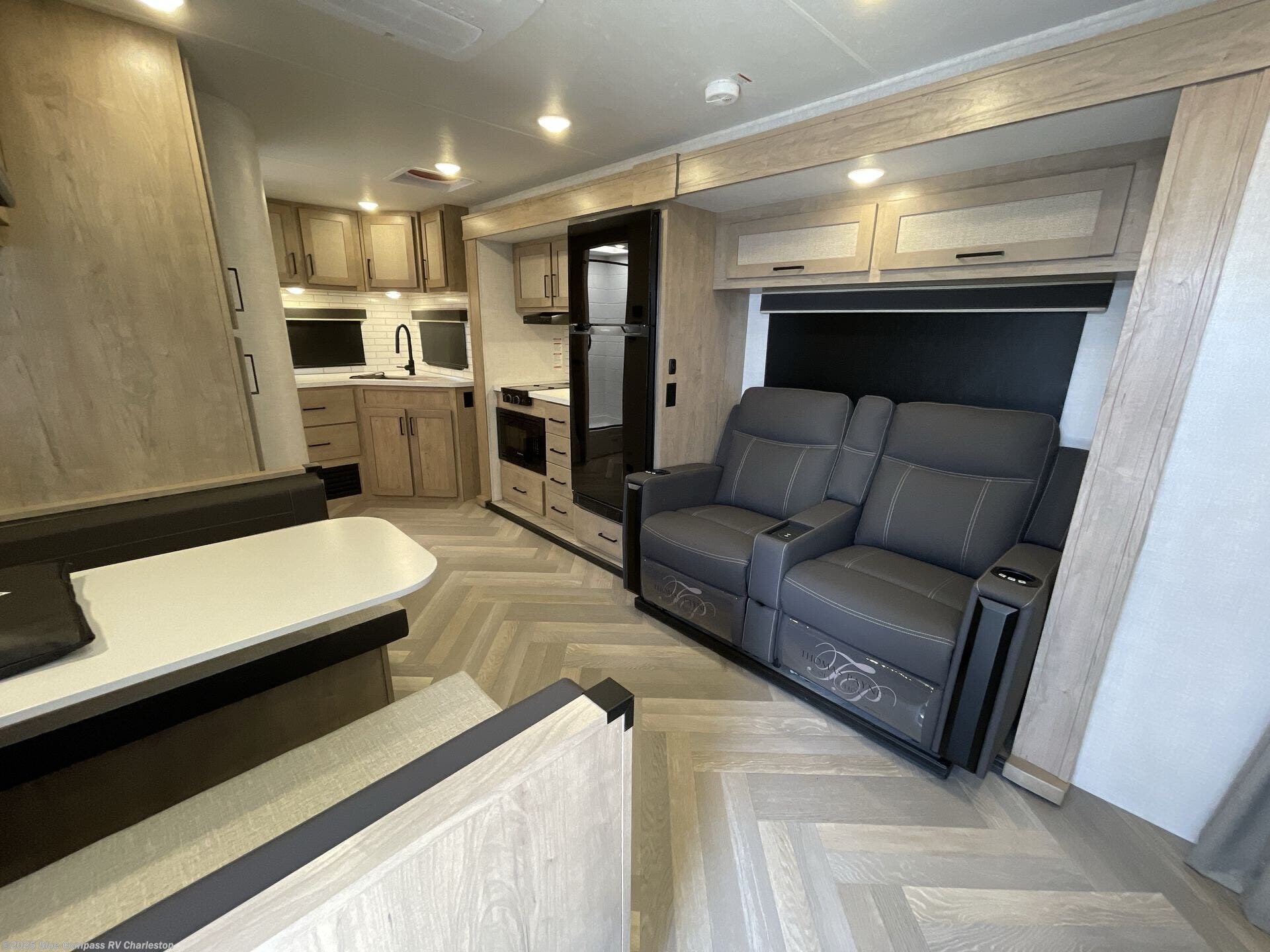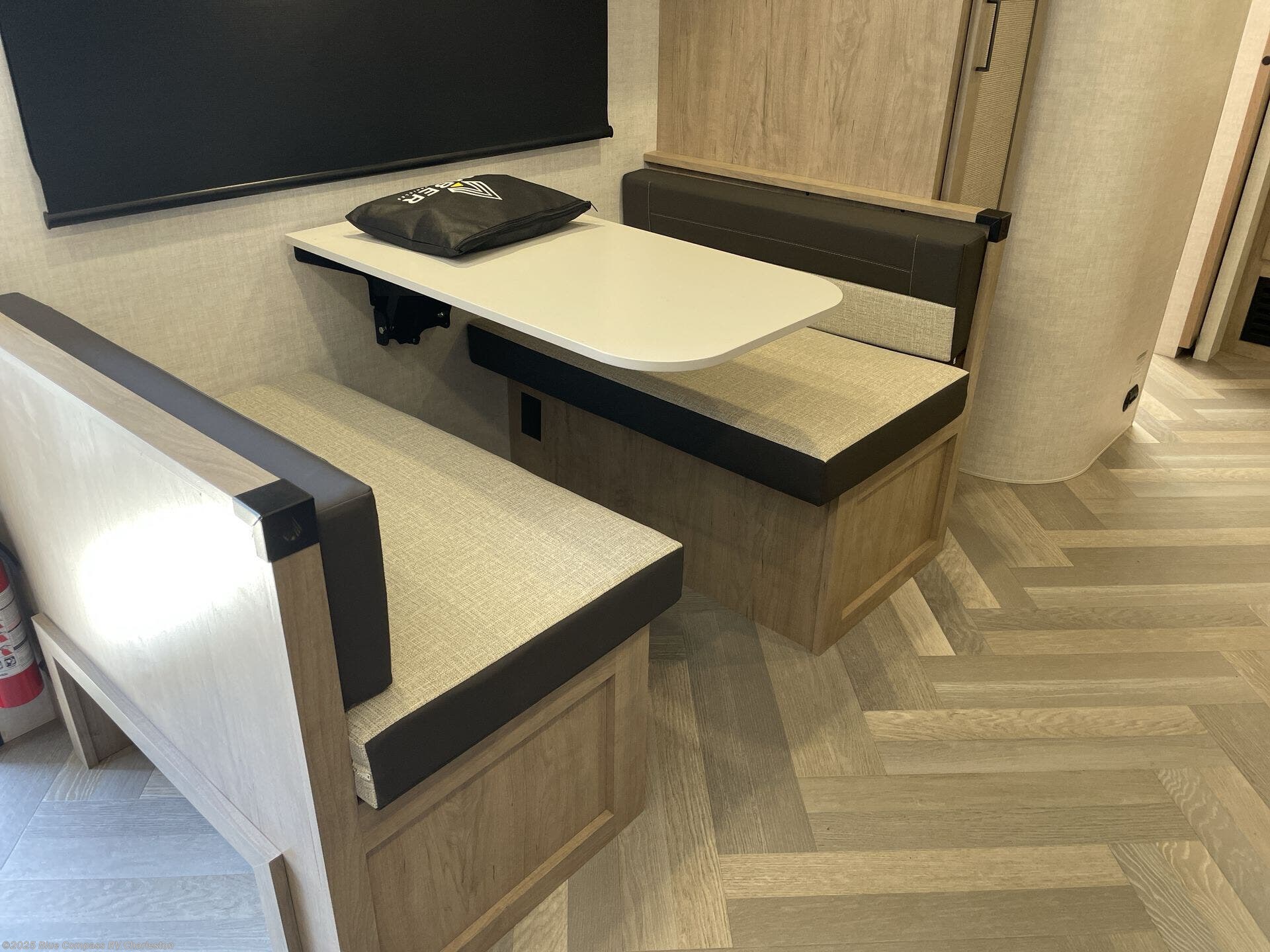 Camping trips just got a whole lot better in this tandem axle, single slide travel trailer! Once you arrive at the campground, you can put out the 18' power awning, grab your camp chairs from the pass-through storage, and relax! When you're getting hungry, head to the rear corner kitchen that includes ample counter space, a two burner cooktop, plus a 10 cu. ft. 12V refrigerator. There is also a pantry to store snacks and paper goods! You can get cozy after dinner on the theater seating that sits directly across from the HDTV for easy viewing, and there is a legless dinette if game night is in order. When you're ready for bed, the queen bed up front will provide a great night's rest, and there is a privacy curtain if you have a guest staying over on the dinette. And don't worry about storage space; this model has you covered with dual bedroom wardrobes, overhead cabinets, and convenient shoe storage!