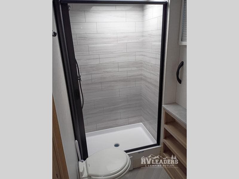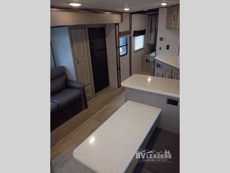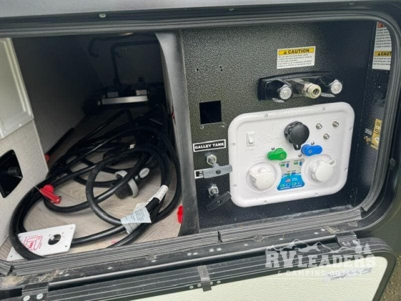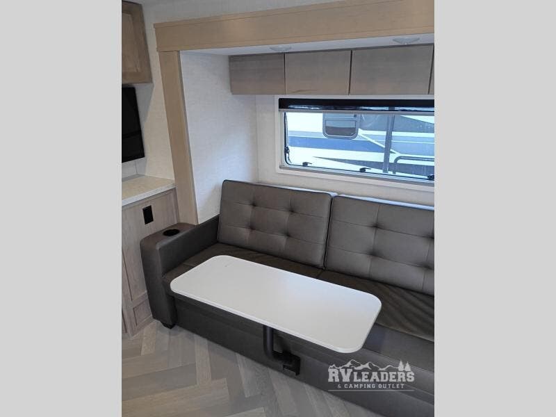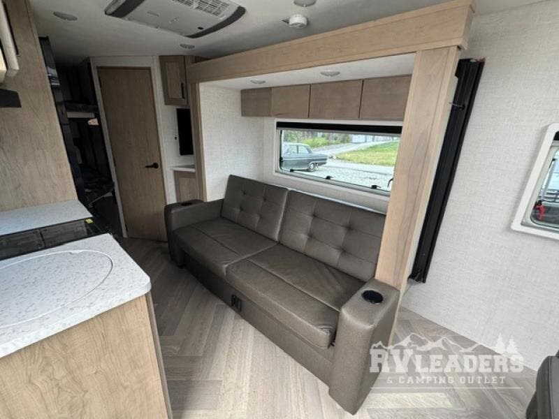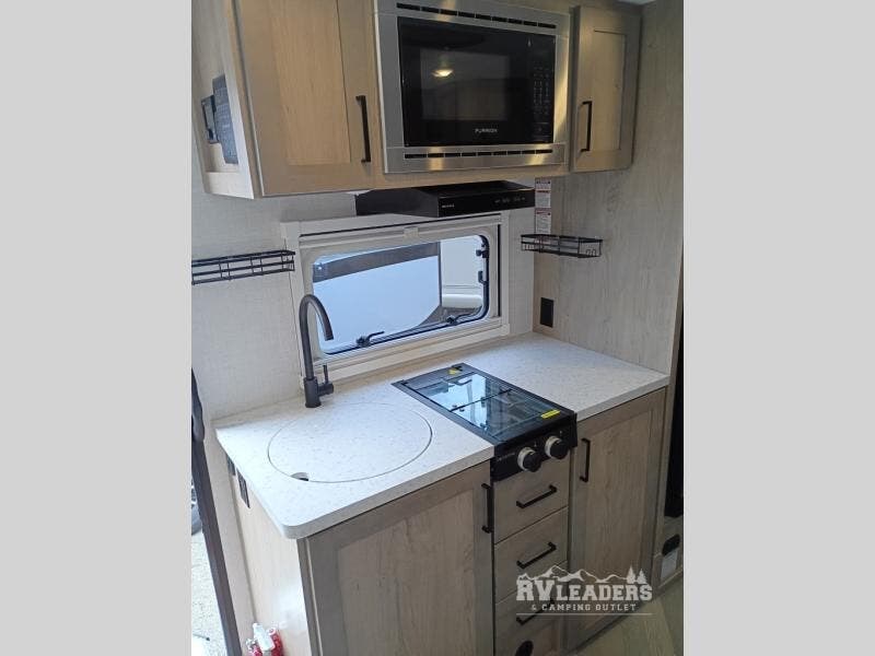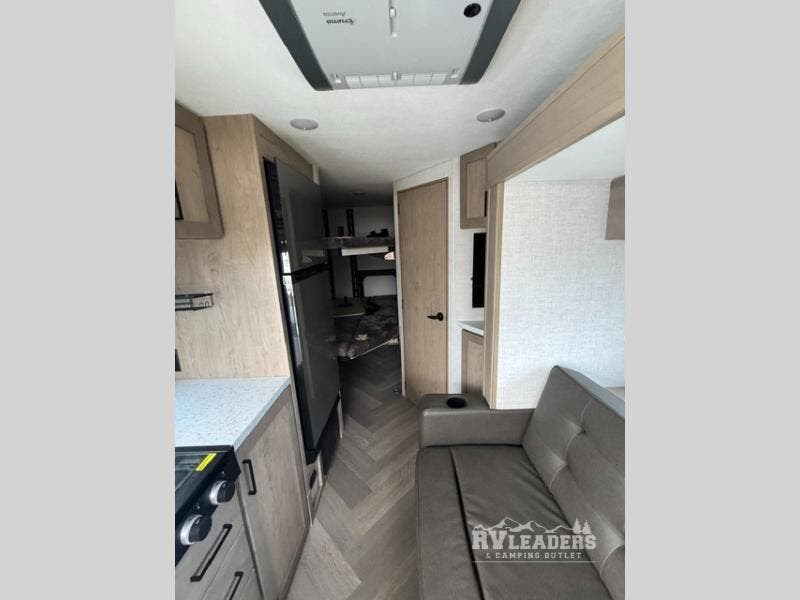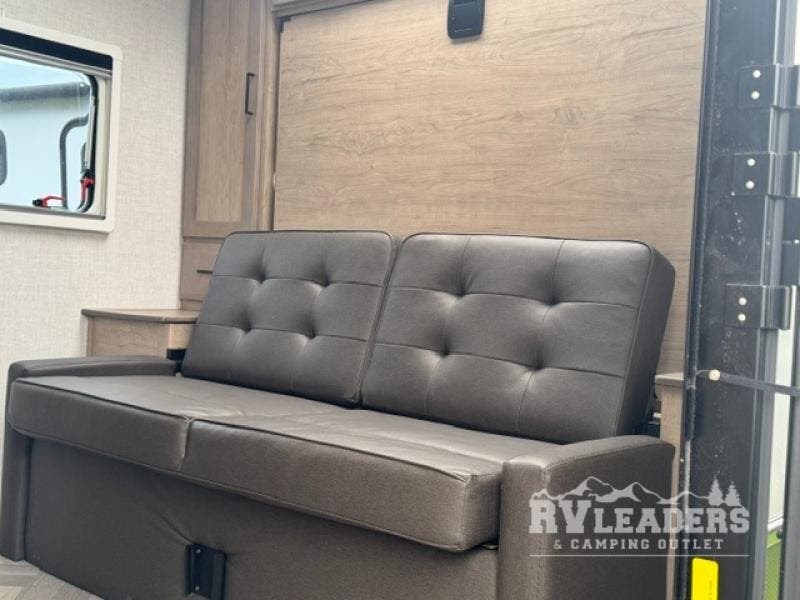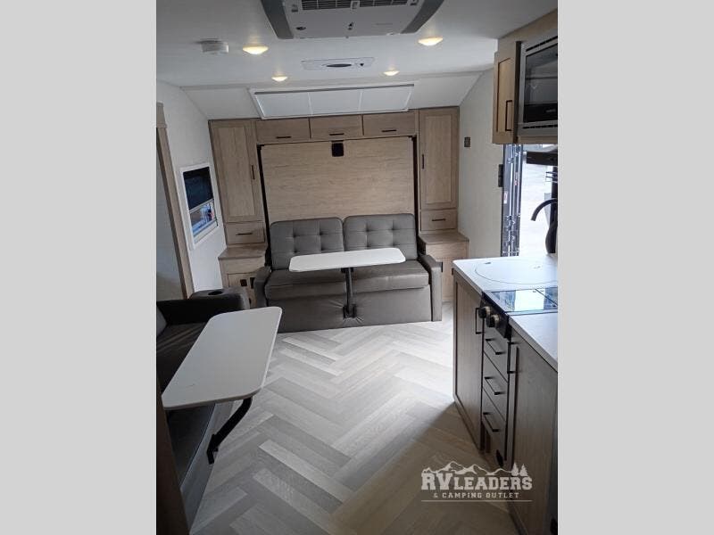 You're going to love everything about this travel trailer that can comfortably sleep three to six people each night, depending on your bunk configurations. There is a spacious storage locker that can be used for hiking gear, plus a kayak/bike storage door for quick and easy packing. The Embertrack system lets you convert the benches to twin bunks, double-size bunks, a desk, or remove them altogether for more storage space. You will enjoy the queen-size Murphy bed up front, along with the "stargazer" skylight for nighttime views, along with dual nightstands and dual wardrobes to keep your clothes tidy. And in the morning you can relax on the jack-knife sofa with a removable table once the bed is put away. This trailer also includes a full kitchen with a 12V refrigerator, an air fryer convection microwave oven, a dual burner cooktop, and a stainless steel sink for easy clean-up.