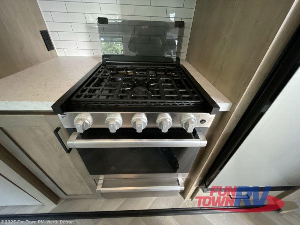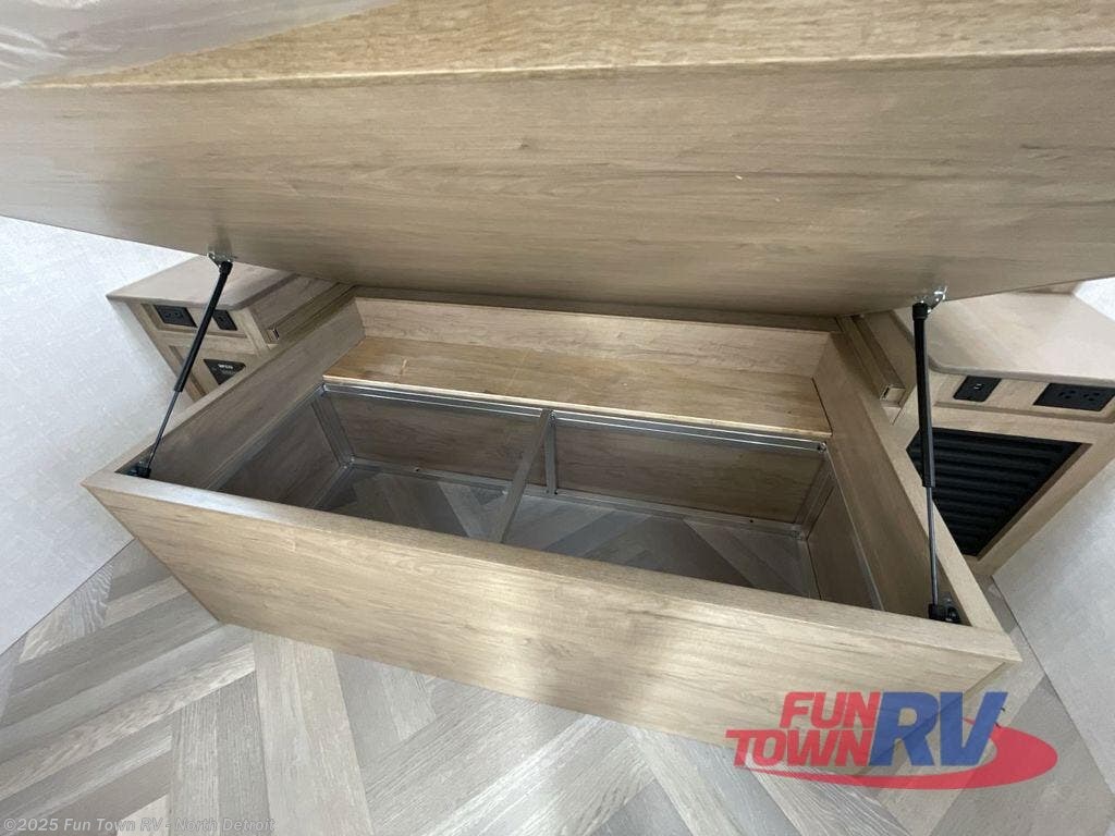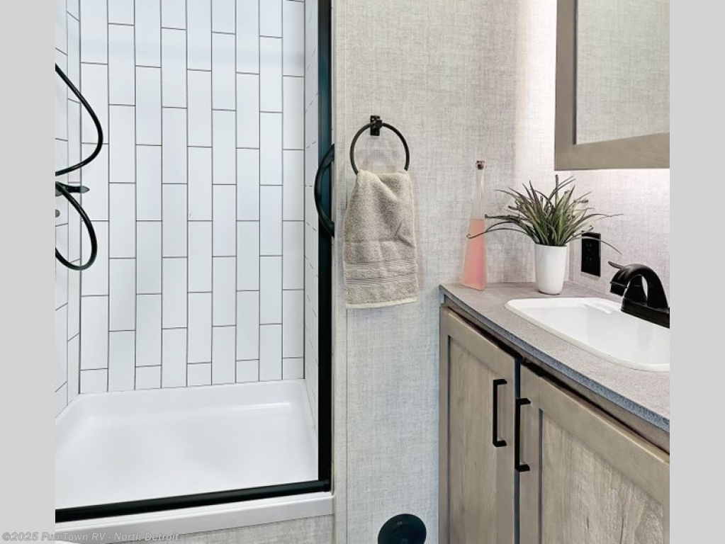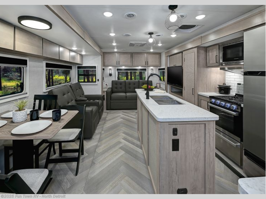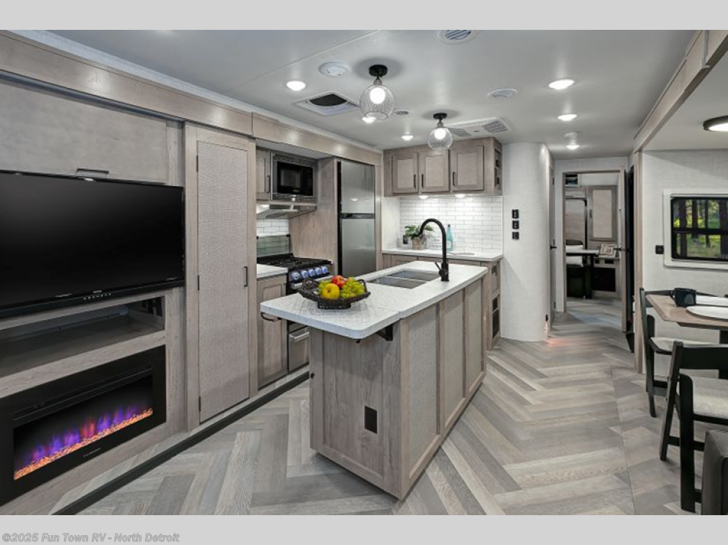 You're going to love the amount of space you have in this travel trailer with dual opposing slides in the main living area. You'll also find theater seating across from the 12V HDTV and fireplace, a free-standing table and chairs, and a hide-a-bed sofa where guests can sleep. The chef of your group will have a kitchen island with a flip-up countertop for ample space to prep food, plus a convection microwave/air fryer that is sure to be a hit! You'll find plenty of counter space in the full bath, along with a medicine cabinet and a 30" x 36" shower with a Showermiser fresh water saver system. The front private bedroom will provide you with your own space at night, and here you'll enjoy a queen bed, dual wardrobes and nightstands, a dresser, plus TV prep. This model also includes a wardrobe/linen closet with washer/dryer prep that will make full-time RV living easier than ever!
