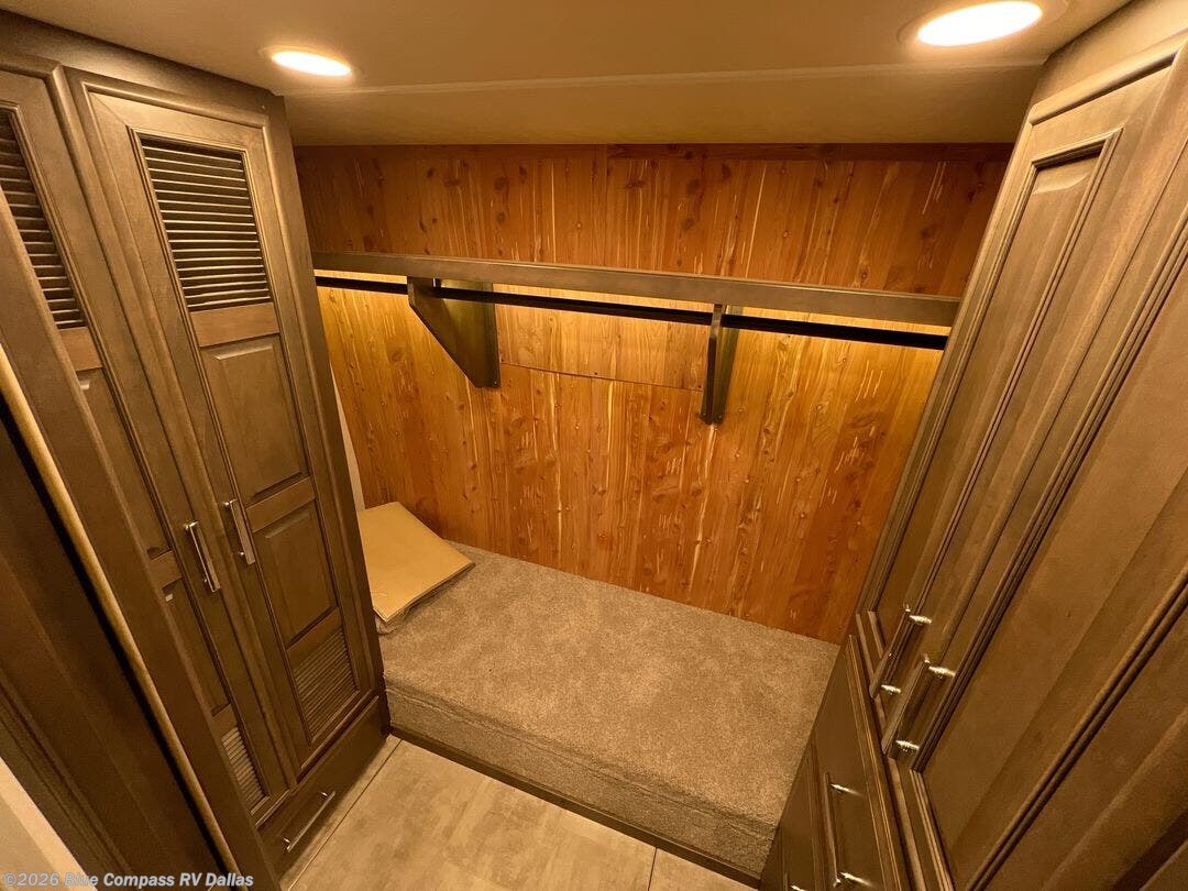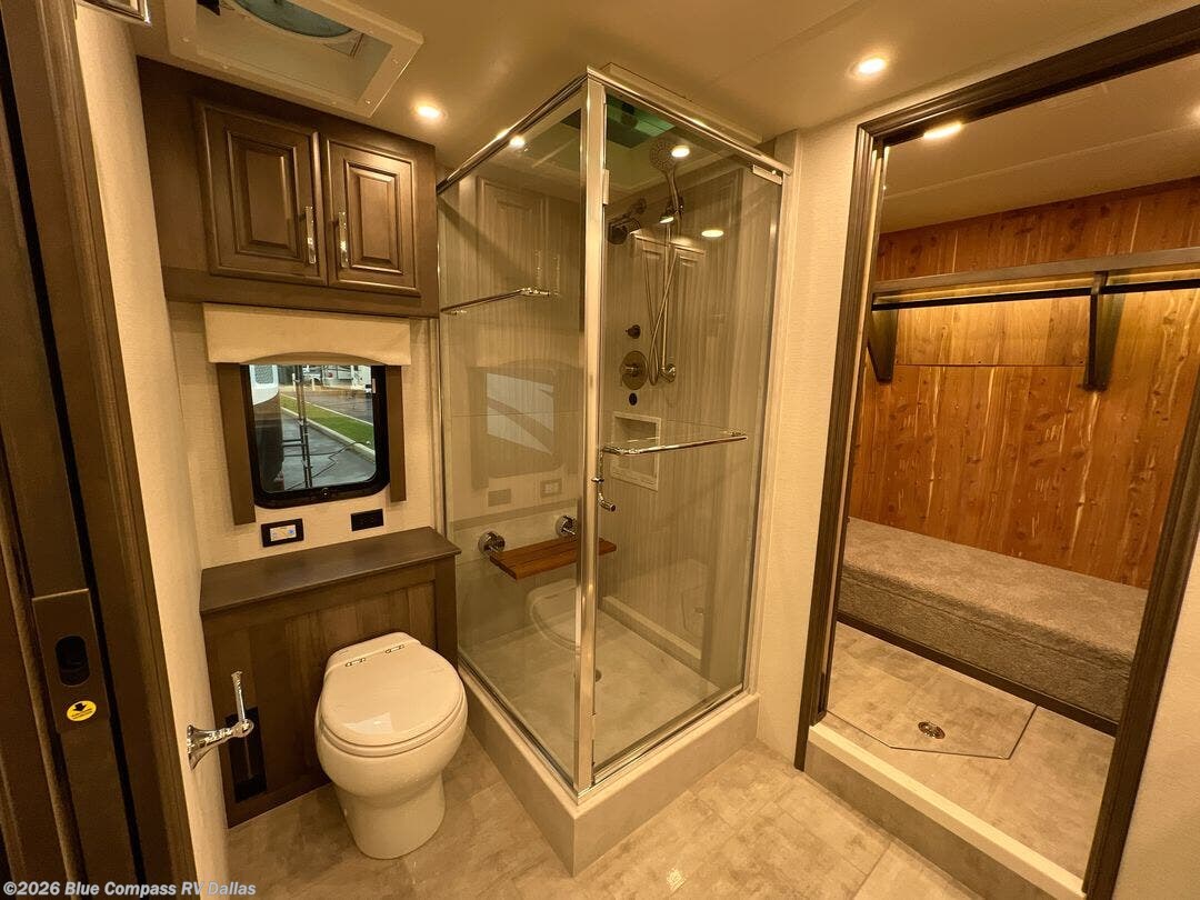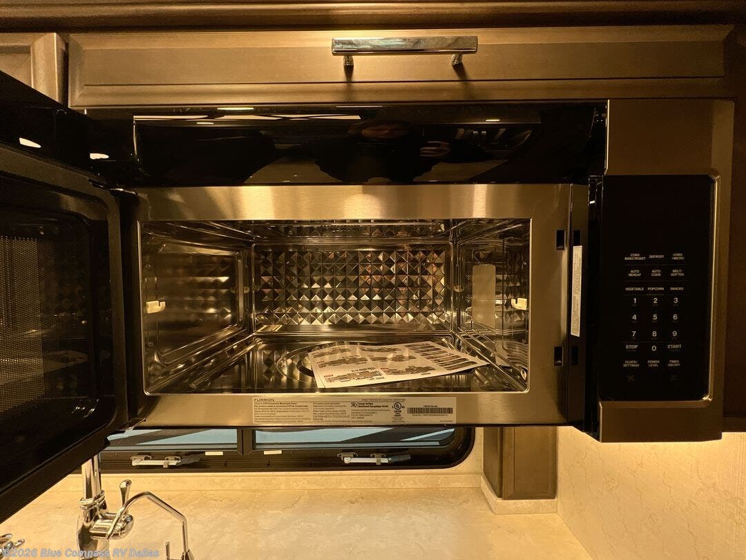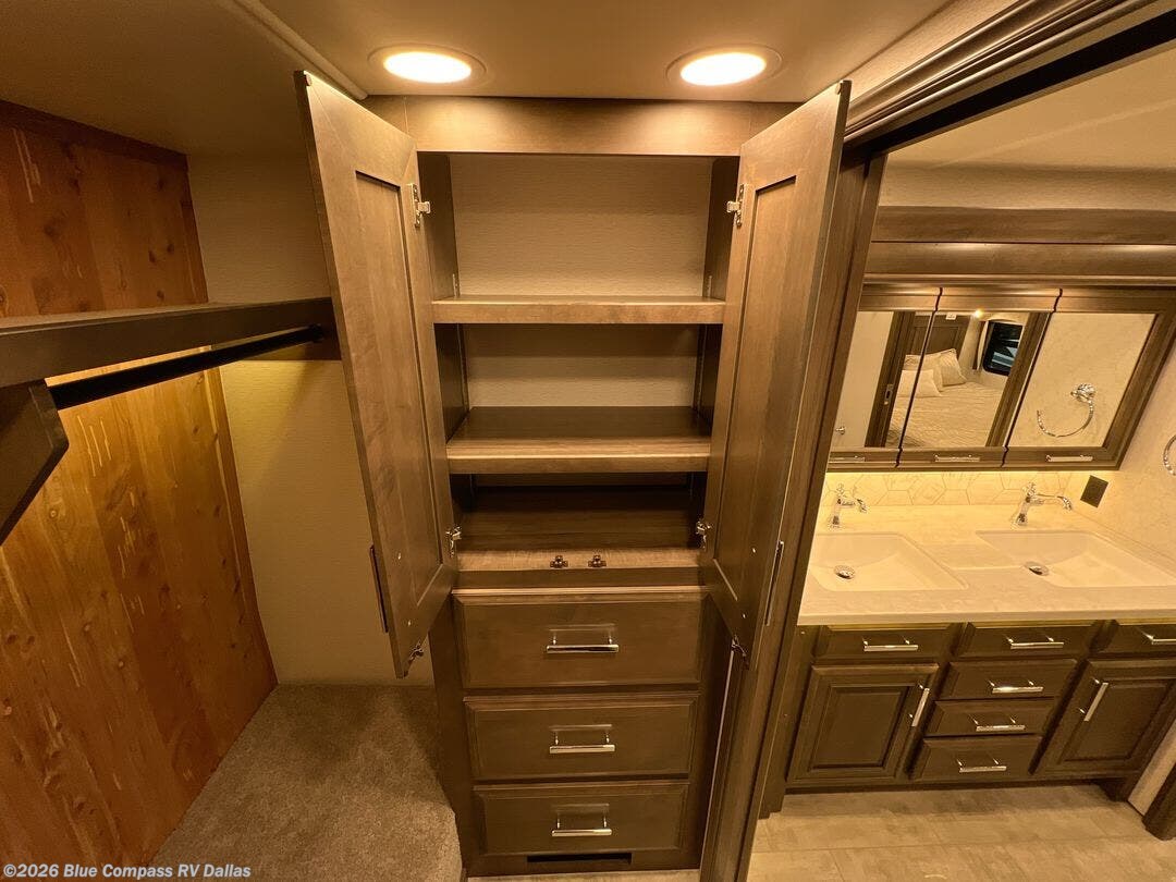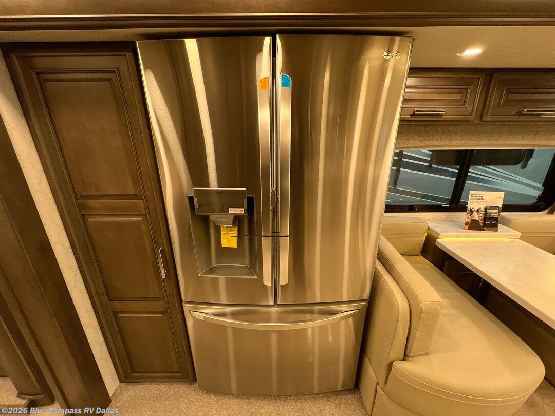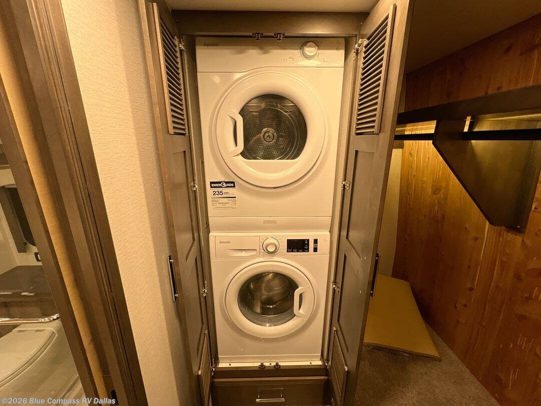Comfortable traveling and living can be found in this coach with a master suite that includes a slide out king bed, dual wardrobes, drawers for storage and a 32" Smart TV, plus a full bathroom with a dual sink vanity like at home, and a huge walk-in wardrobe with more storage areas plus a washer and dryer to keep everything clean while away. There is a mid-coach half bath for convenience, and the combined living and kitchen area offers full kitchen amenities such as a convection microwave, a Fisher & Paykel dishwasher, slide-out storage tray(s) in the overhead cabinet, a buffet/table and two chairs to dine or work from, power theater seating to enjoy while watching one of two Smart TVs in this area, plus a hide-a-bed sofa. There are options to change out the furniture if you wish such as a booth dinette, a 74" sofa with ottomans, and/or another hide-a-bed sofa with the desk/fireplace entertainment center option.