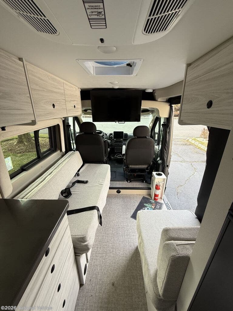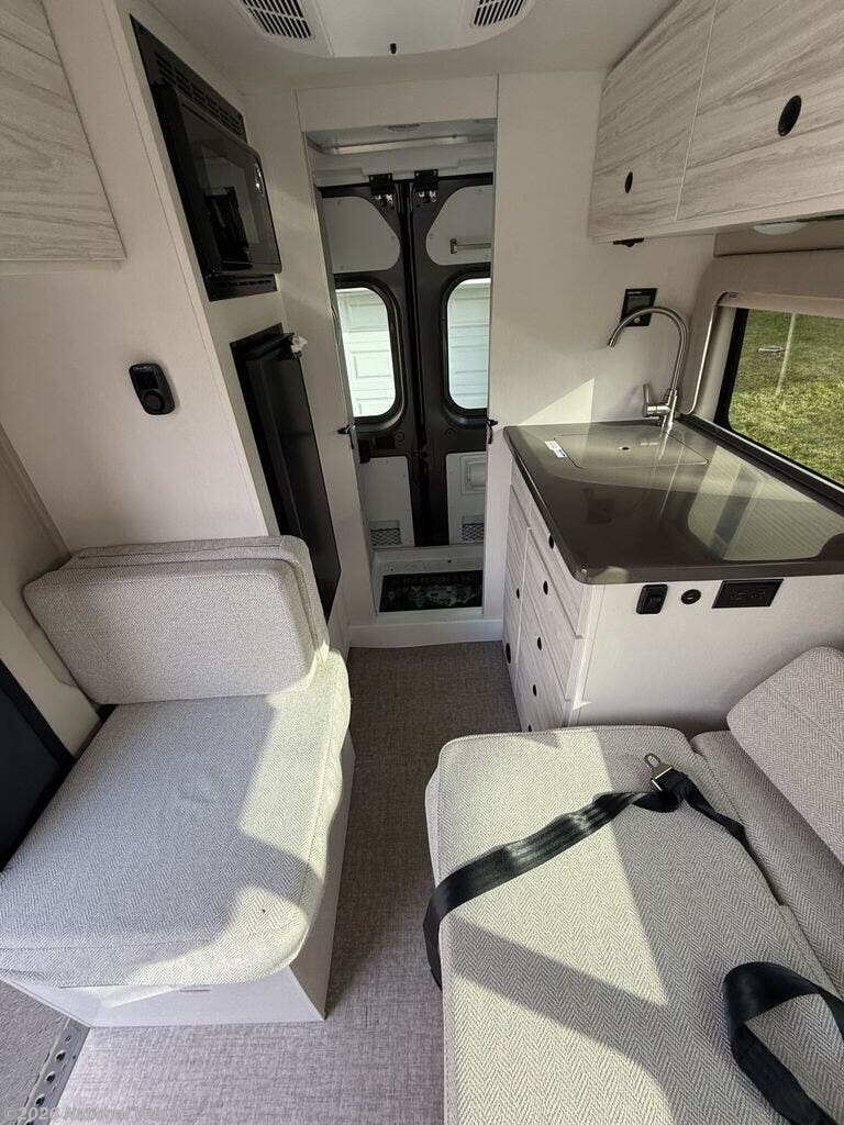 Any trip in this camper van will be spent in comfort thanks to the convenient wet bath and full kitchen amenities. You can whip up a hearty breakfast on the portable induction cooktop or use the microwave. There is a stainless steel sink with a cover for more prep space, and the pressed countertops will be easy to clean. After you've hiked for the day and gotten cleaned up in the rear wet bath, you can relax on the 54" sofa that will convert to a 54" x 72" bed. There is also a 27" bench seat for more seating space, overhead cabinets for storage, and an overhead TV to keep you entertained.