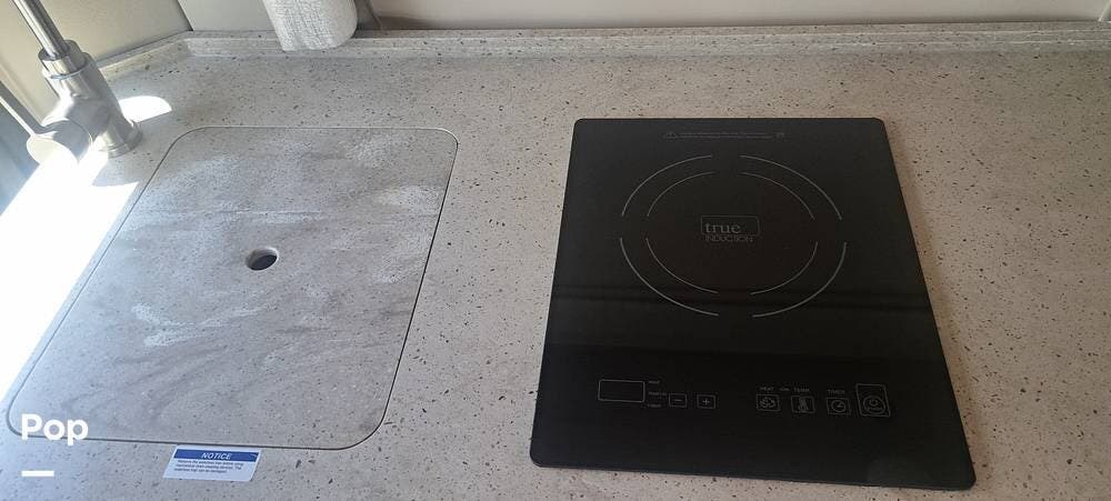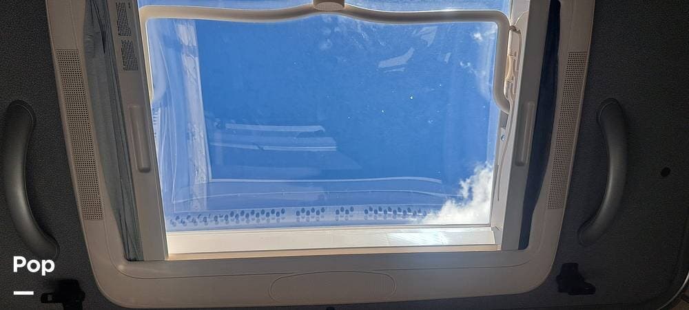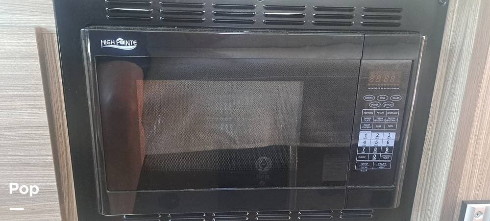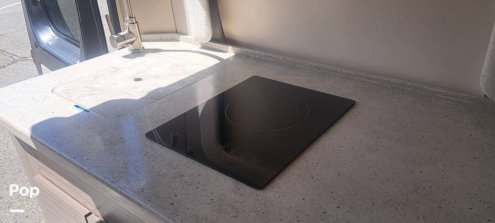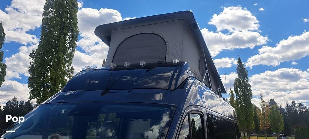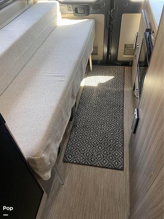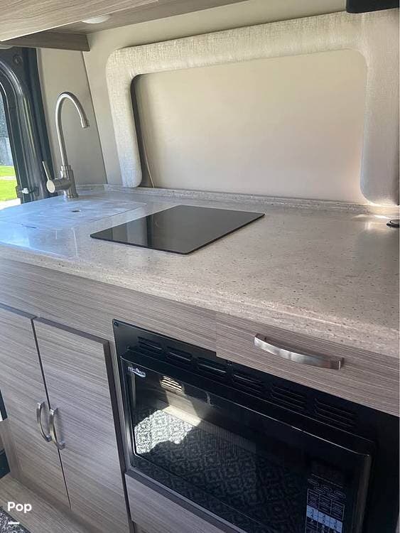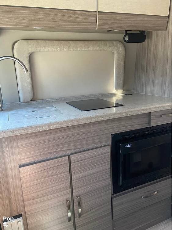 This model sleeps four people, thanks to a convertible rear sofa bed and an additional sleeping area in the pop-top roof. The kitchen is located at the rear and is equipped with a convection microwave, a stainless steel sink, and a 5.3 cubic foot refrigerator, allowing for convenient meal preparation. The wet bath includes a shower with a magnetic curtain, combining functionality and space efficiency.