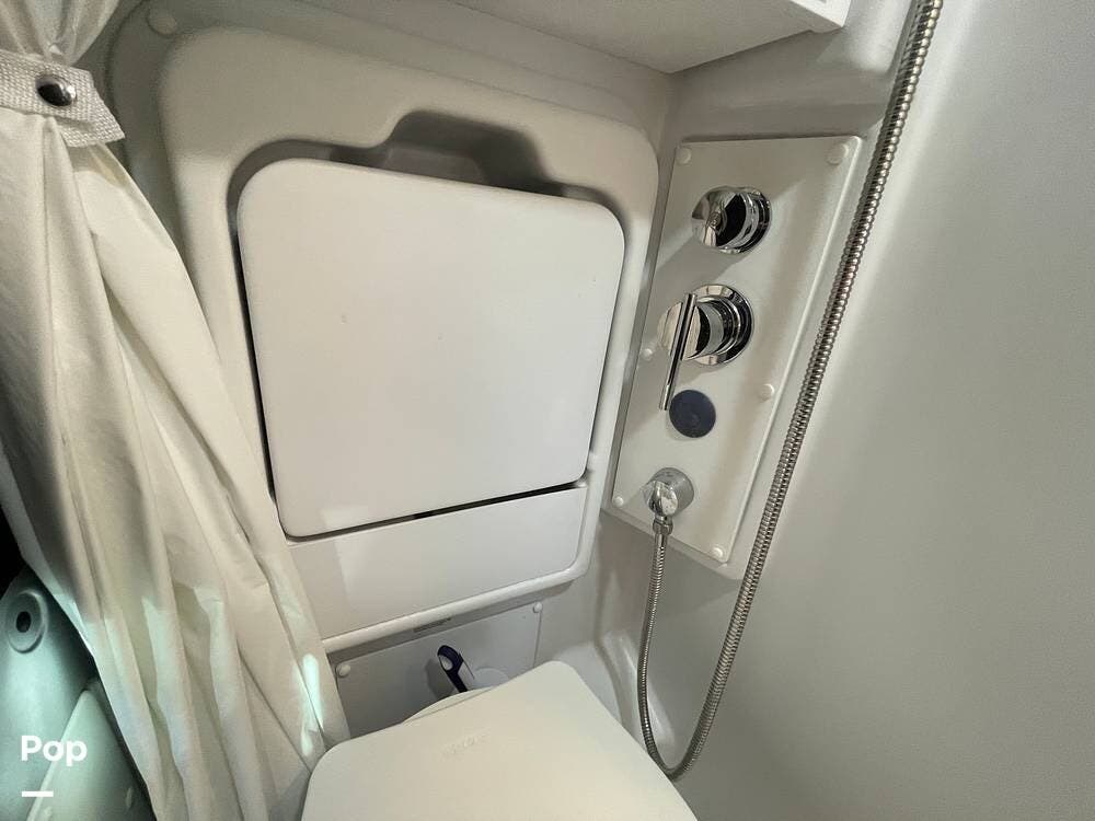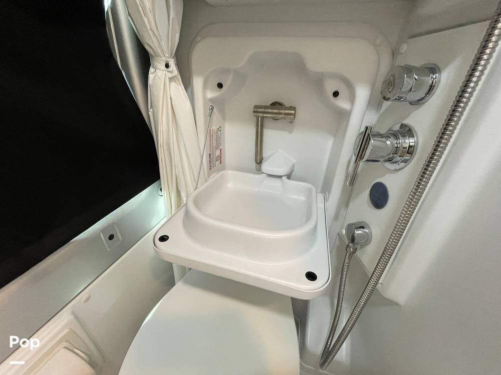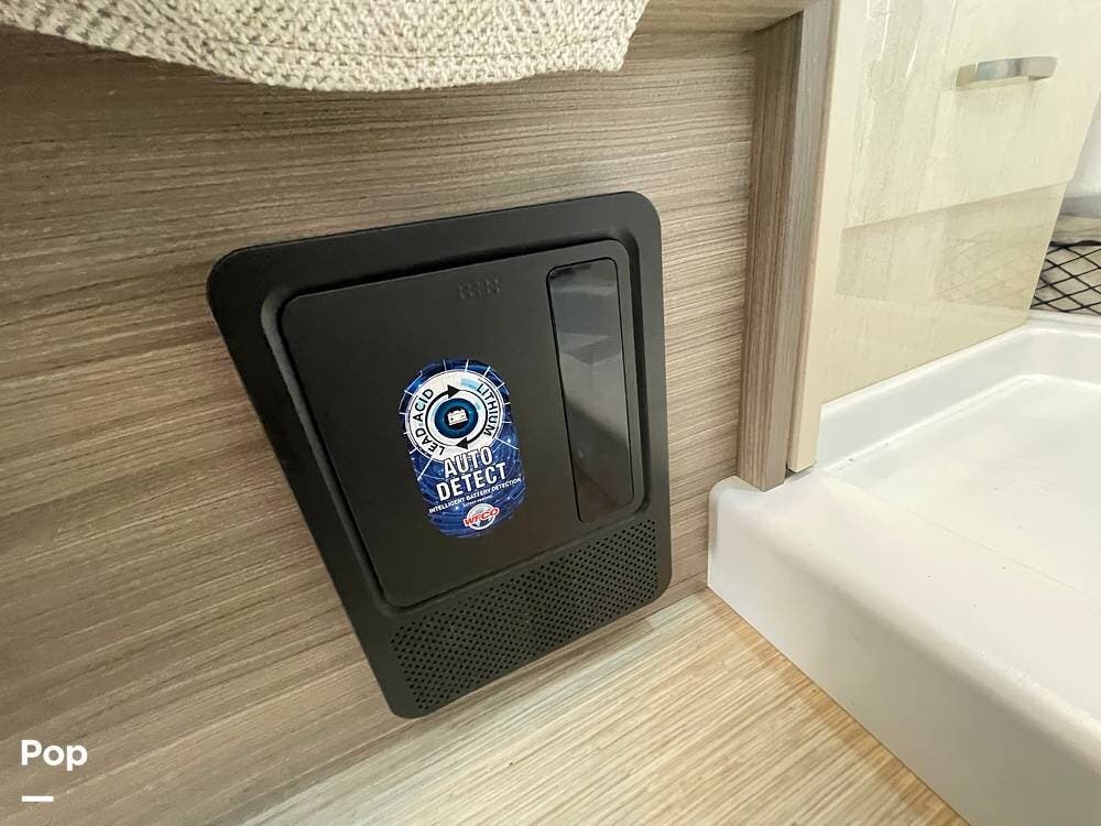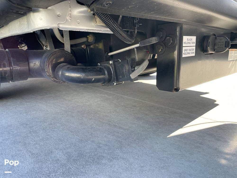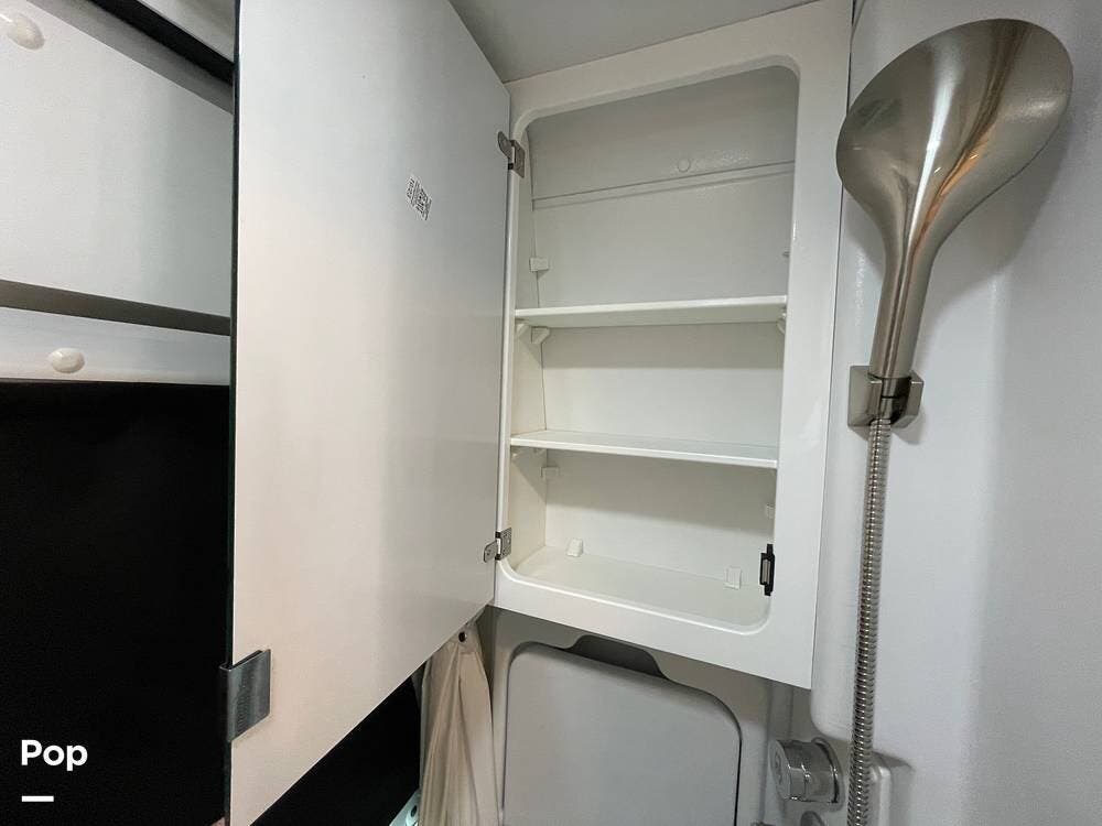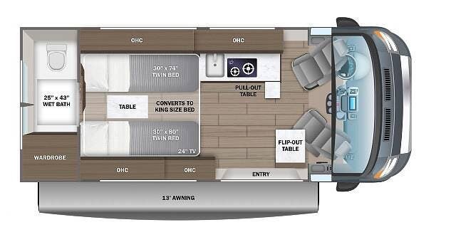 It has two twin-size beds that convert to a king-size bed, under-bed storage, a shower, an Aqua View ShowerMiser water management system, a toilet, and a powered roof vent!