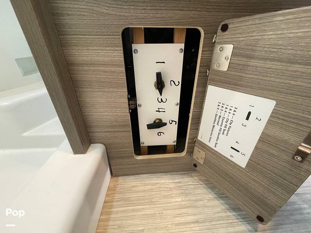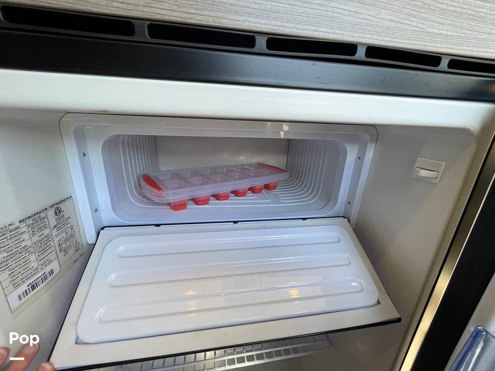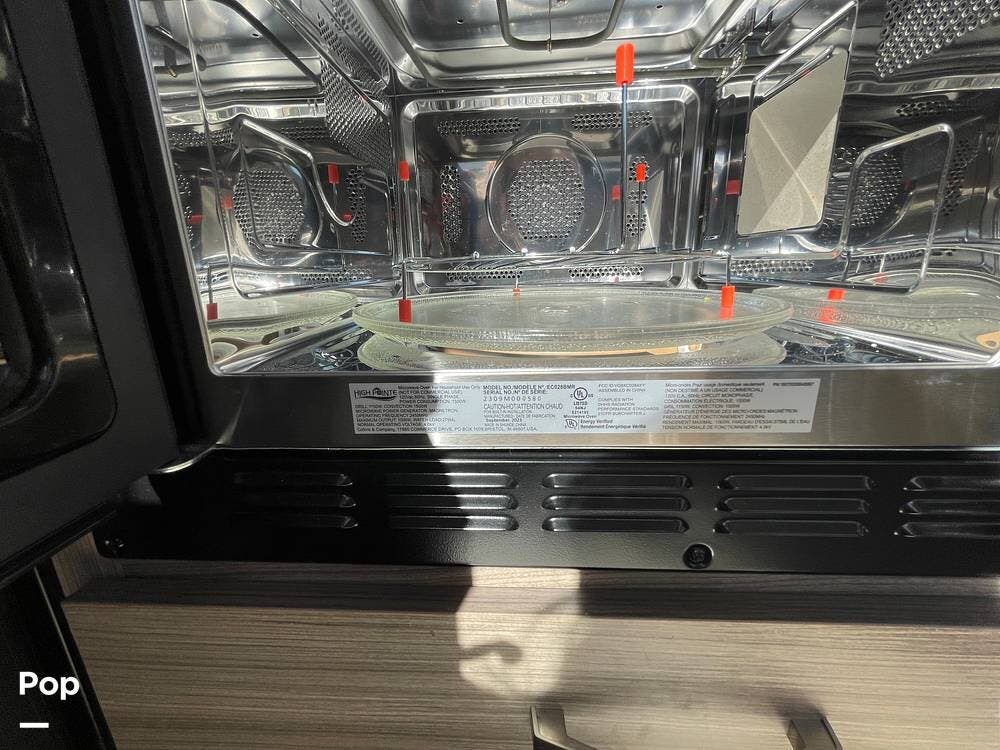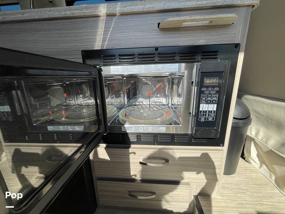 The kitchen has an AC/DC refrigerator, a convection microwave, a 2-burner gas cooktop, a stainless steel sink, and pop-up USB outlets!