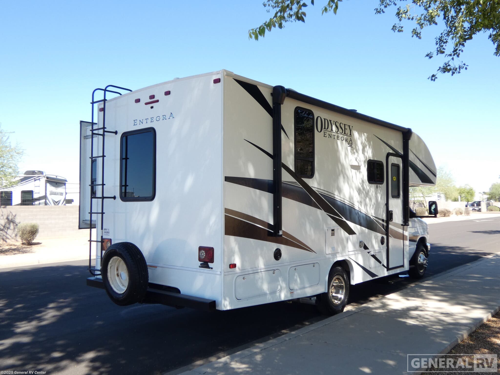 ## Entegra Coach Odyssey SE Class C gas motorhome 22CF Ford highlights - Full Bath - Booth Dinette - Convection Microwave - LED HD Smart TV - Large Wardrobe - 7,500 Lb. Hitch Make your trips complete in this coach that can sleep four to five each night. There is a cab-over bunk with a 750 lb. capacity for guests and an RVqueen bed slide out in the rear corner bedroom. The booth dinette can be used to dine at, play games, and even sleep an additional guest or two little ones. A two burner cooktop comes standard in the kitchen, along with a convection microwave, a stainless steel sink, and a 10 cu. ft. refrigerator. You will also appreciate having a full bath on board, and the 13' electric awning outside will provide a place to relax with a cold drink! The Odyssey SE Class C gas motorhome by Entegra Coach is constructed with TuffShell vacuum-bond laminated sidewalls, a one-piece, seamless fiberglass front cap, and bead-foam insulation for added durability and strength.The driver will also love the power steering, tilt steering wheel, and auxiliary start switch, and there are privacy curtains for the cab area to close at night. The7' interior ceiling height will provide plenty of space to stretch out and the high-intensity, recessed LED lights will make your space feel more like home. All of your power needs will be met with a 4,000-watt generator and 12V house battery, plus there is a 13.5K BTU A/C and 30K BTU furnace to keep you comfortable all year long.