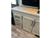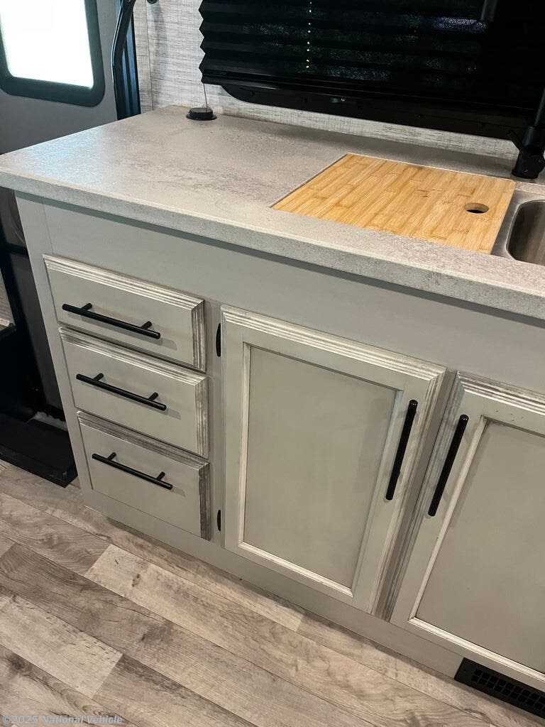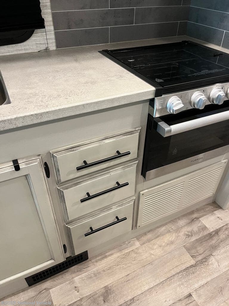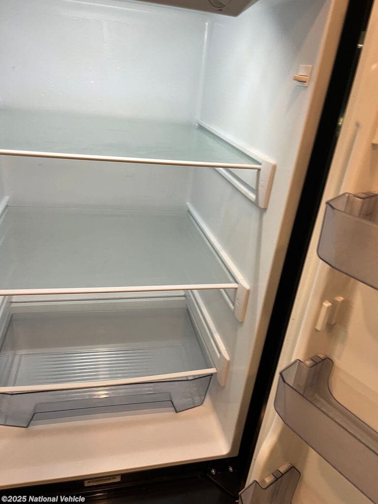 The modern kitchen is fully equipped with a recessed 3-burner range, convection microwave, 8 cu. ft. gas/electric refrigerator, and a large double sink with solid-surface countertops. A pantry and multiple overhead cabinets ensure you?ve got all the storage you need for extended trips.