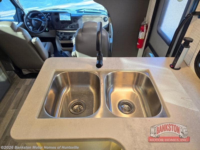 With any Odyssey Class C gas motorhome by Entegra Coach, the driver will appreciate the power from the 325 HP engine, the towing capacity from the 7,500 lb. hitch, the tire pressure monitoring system, the navigation from the Sony infotainment center with Apple CarPlay and Android Auto, plus the backup and side-view cameras when parking and driving down the highway. The kitchen offers full amenities including a recessed stainless steel sink with a cutting board sink cover, LED-lit pressed countertops, a decorative backsplash, and a pop-up charging station with 110 outlet and USB plugs to keep your smart phones charged. Get ready for luxury in a Class C, choose your favorite today!