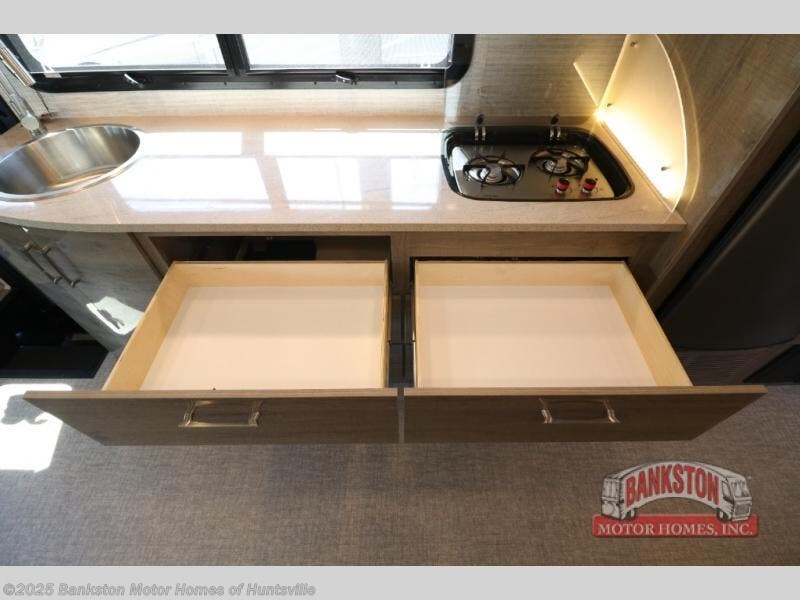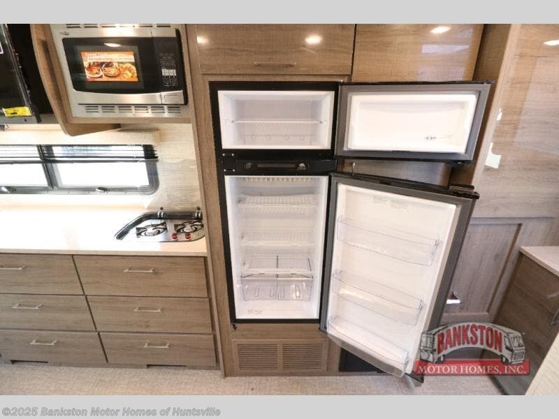 A full rear bath and a full-wall slide make this coach both spacious and convenient! You can prepare all your meals on the two burner cooktop, and dine together at the booth dinette. And you can choose the optional theater seating in place of the dinette for a more at-home feel. There is an LED TV in the living area to watch your favorite shows, and you'll find plenty of overhead compartments for your valuables. This model also features a cab-over bunk for the little ones, or you can choose the optional B+ front cap for extra storage space!