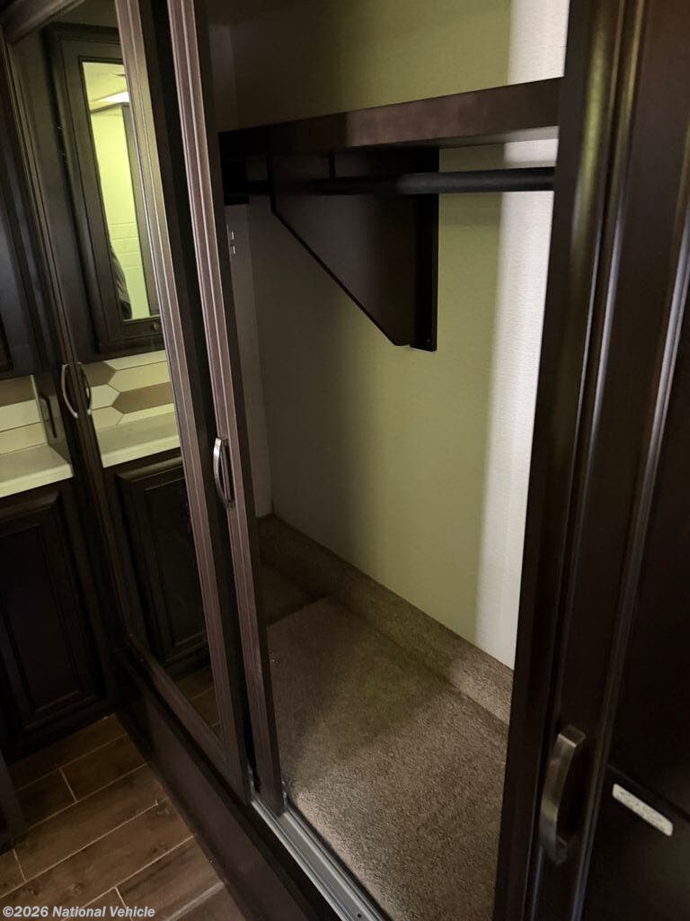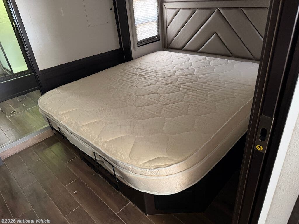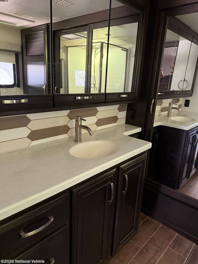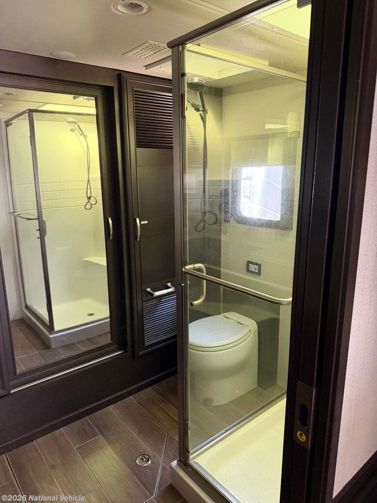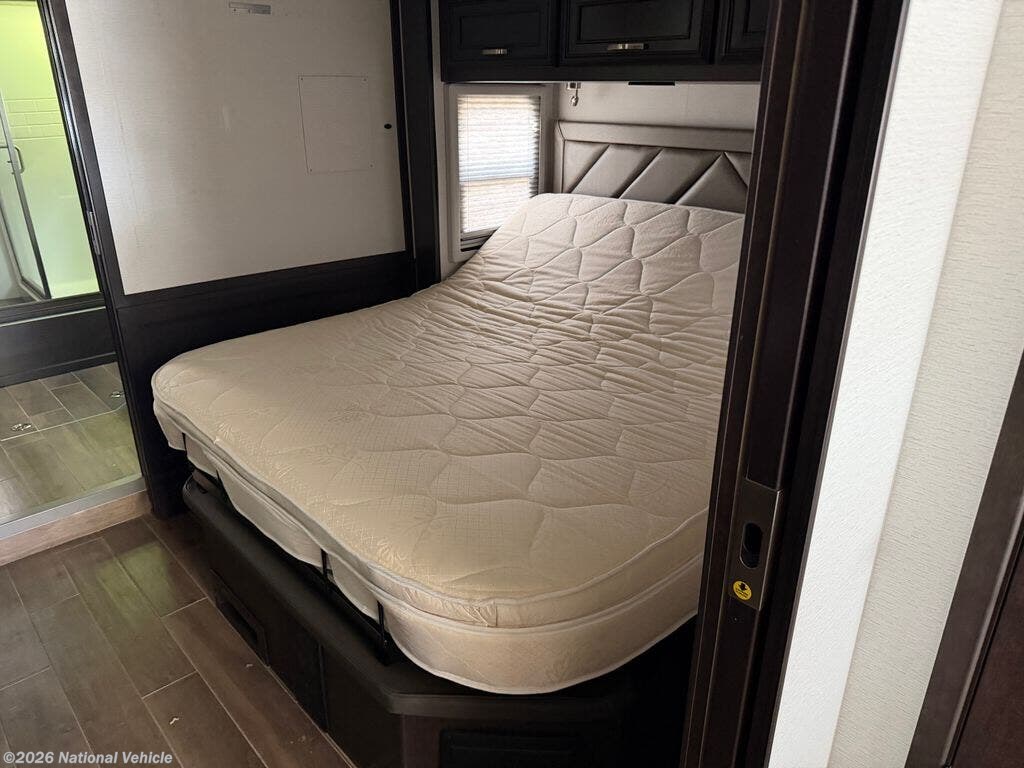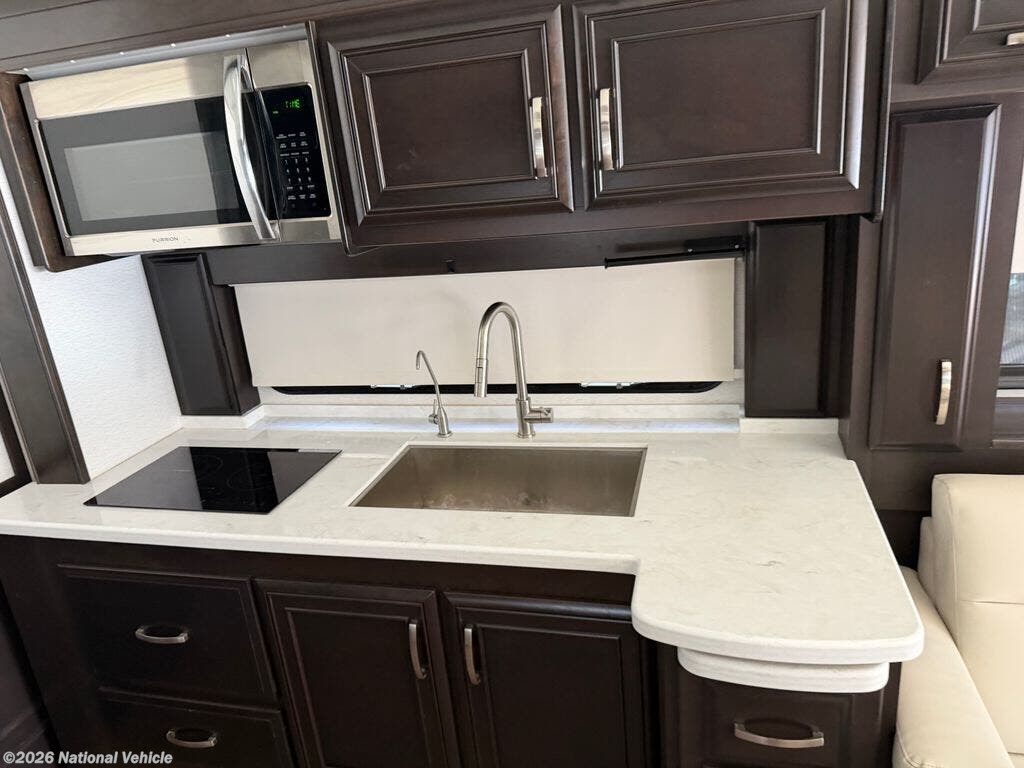 The gourmet kitchen is designed for both convenience and style, offering solid-surface countertops, a residential stainless steel refrigerator, induction cooktop, convection microwave, and abundant cabinetry. Whether you're preparing a quick breakfast or entertaining guests at the campground, this kitchen provides everything needed for cooking on the road.