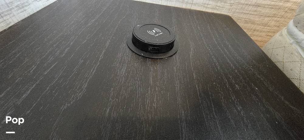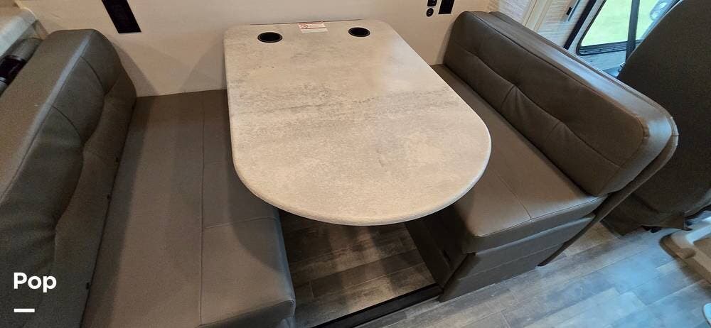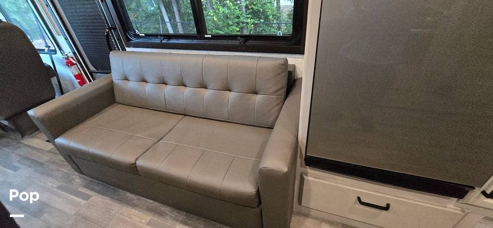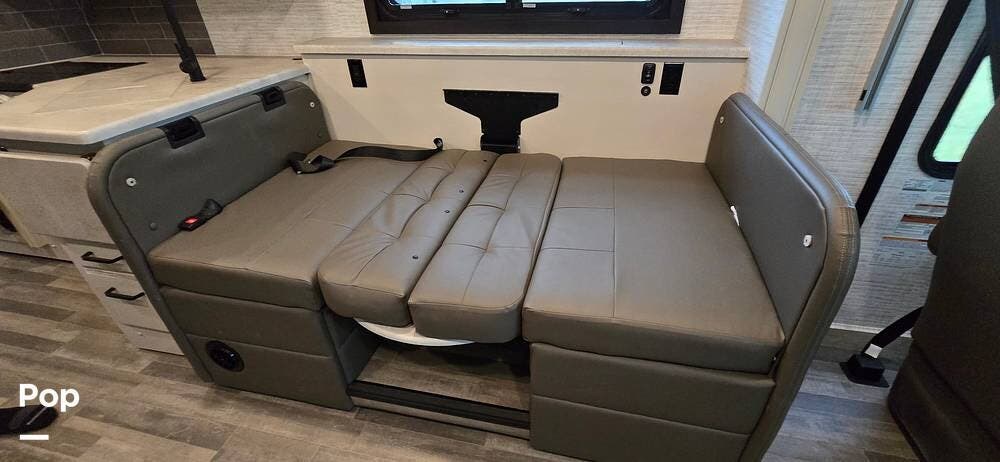 Opposite the booth dinette is a jackknife sofa, which provides a cozy spot to enjoy a movie or your favorite event.