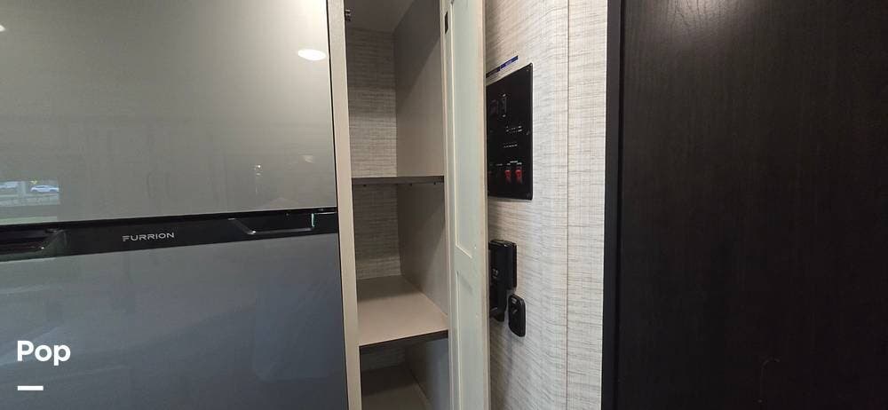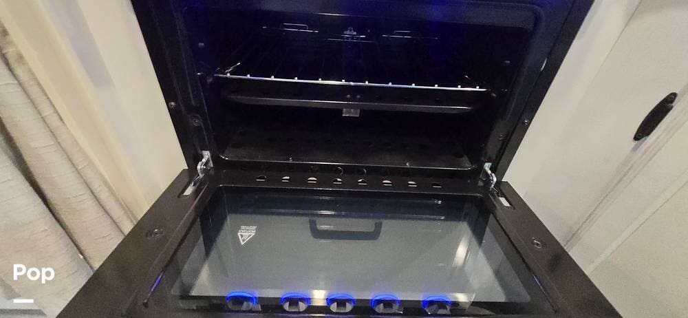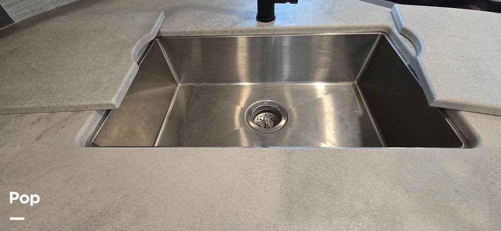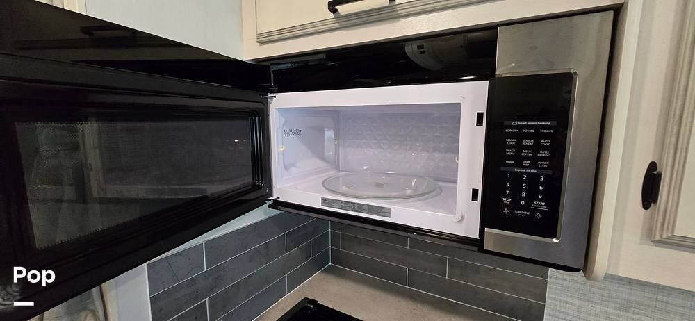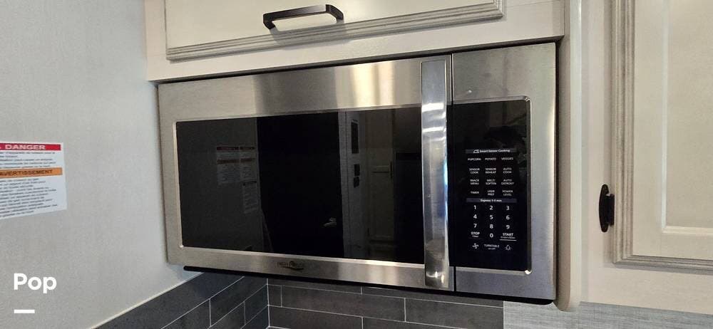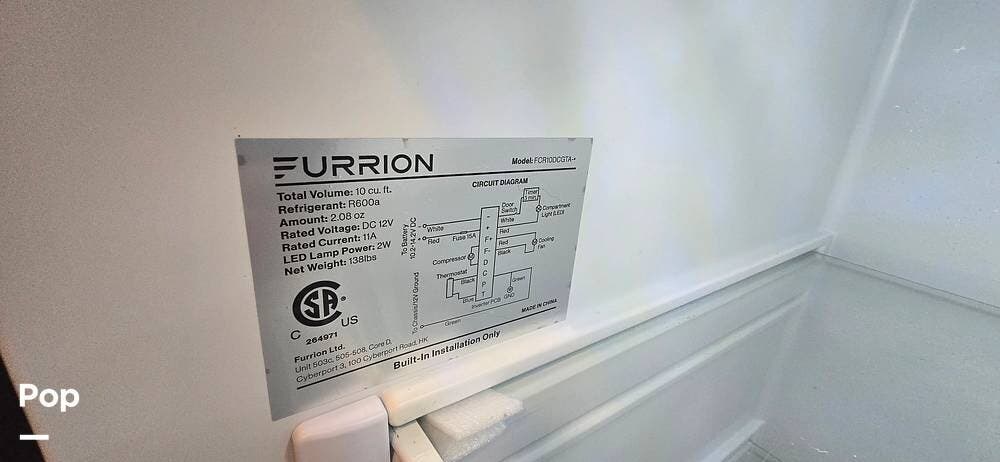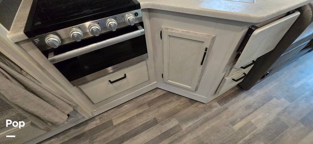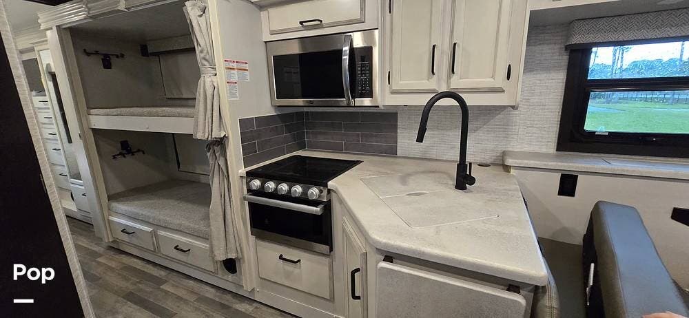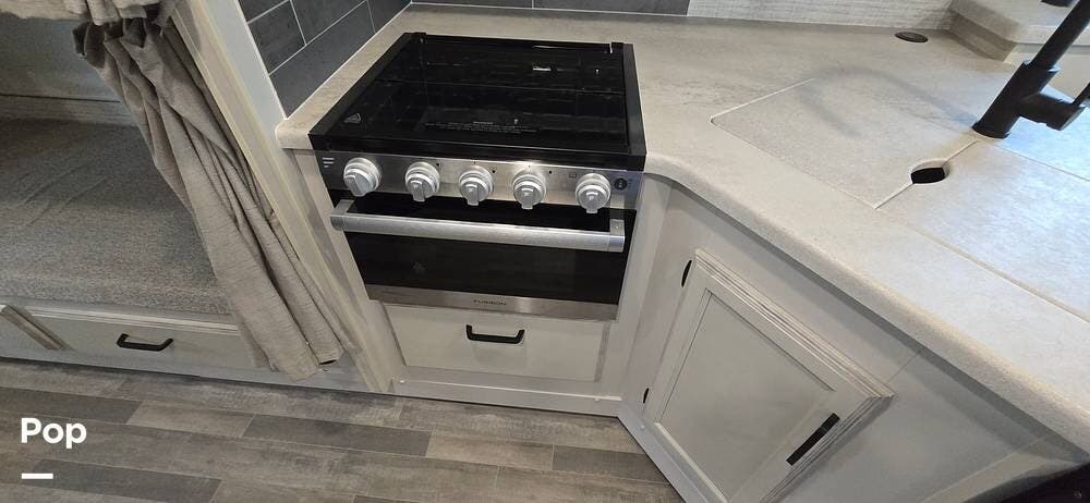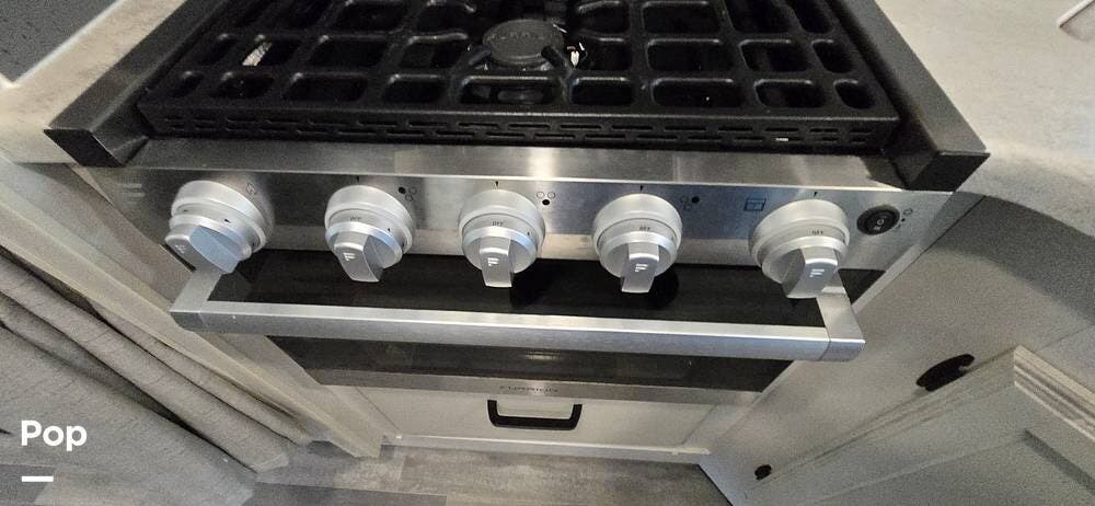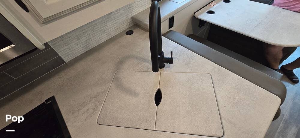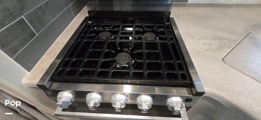 The kitchen is thoughtfully arranged to maximize functionality, featuring solid-surface countertops, ample cabinet storage, and residential-style appliances, including a large, recessed, stainless steel kitchen sink with cover, a Furrion all-in-one cooktop and oven, a High-Point Microwave, and a Furrion 10 cu. ft. 12V refrigerator that makes meal preparation easy and enjoyable.