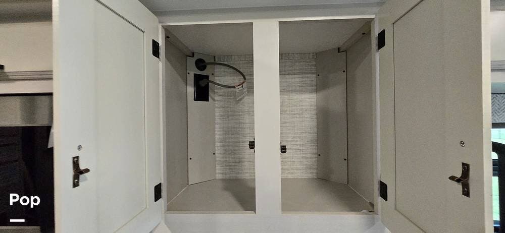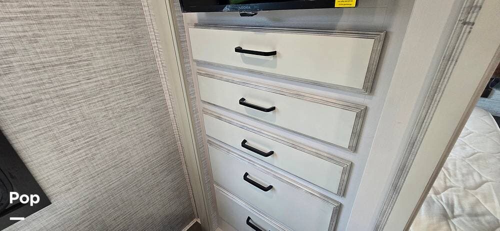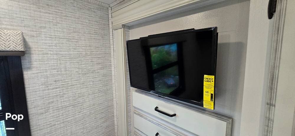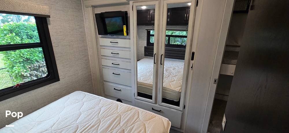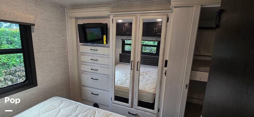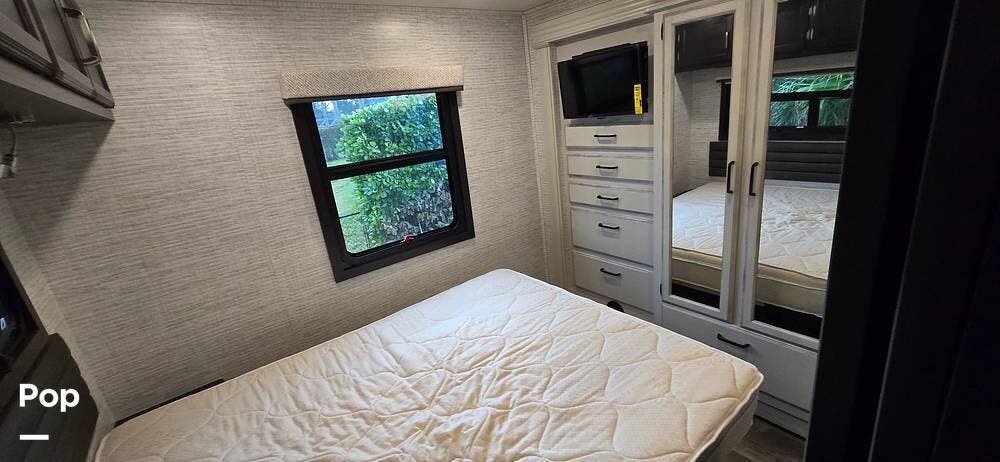 The rear bedroom provides a peaceful retreat, featuring a comfortable queen bed with storage underneath, wardrobe storage, overhead cabinetry, and an additional HDTV. Designed for relaxation after a day of travel, this space offers the privacy and comfort expected from a Class A motorhome.