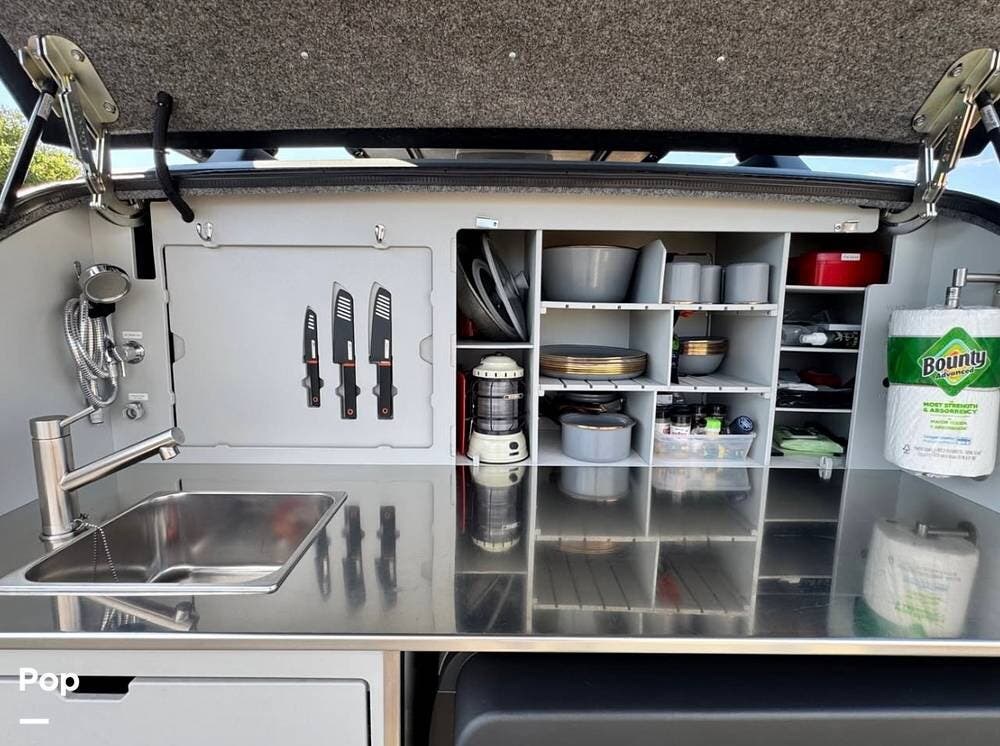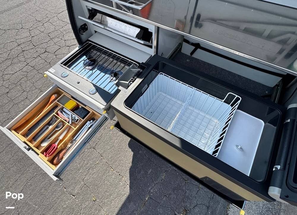 The rear galley is equipped with an ENO 8000 BTU two-burner stove, stainless steel sink, 11 lb propane tank, and an ARB 63-quart fridge/freezer. Other features, such as modular shelving, a knife block, a stowable table, and 120V power outlets, make meal prep.