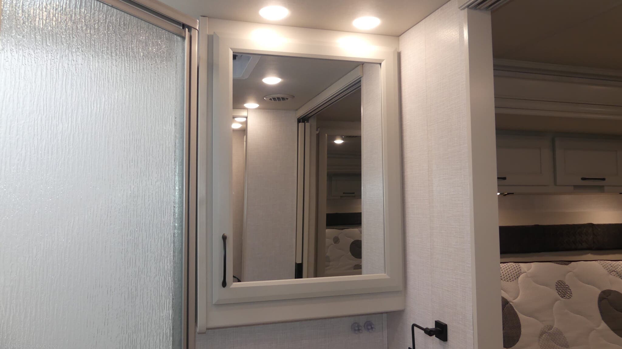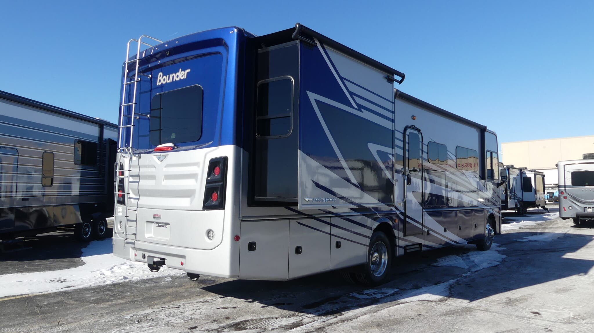 ## Fleetwood Bounder Class A gas motorhome 35GL highlights - Mid-Coach Entry - Adapt-Table Dinette - Theater Sofa - Split Bath - King Memory Foam Mattress - Exterior LED TV Looking for a spacious RV with a mid-coach entry, four distinct areas, and offers a way to work while on the road plus be able to host a dinner party for friends and family? This Bounder gives you all that and so much more like a stainless steel farmhouse sink, a solid surface top in the galley, and full extension drawer guides with latches, plus full amenities to make any meals including a convection microwave and residential refrigerator. The split bathroom is super convenient when trying to get ready in the mornings. One person can be washing their hands in the private sink and toilet room while another person can be using the second sink beside the neo-angled shower. Yet you can also close two sliding doors to make this one big bathroom for yourself. And the multi-purpose Adapt-table dinette allows you to work or eat breakfast for two, and you can easily swing the table out vertically to host four. The rear bedroom offers a slide out king bed, plus plenty of storage and an LED TV to watch before falling asleep. With any Bounder Class A gas motorhome by Fleetwood, you can travel in luxury and style with the power you desire to enjoy the ride as much as the destination. Beginning with the Power Platform Ford chassis construction, the enhanced safety features such as remote, power-heated mirrors with turn indicators and side cameras, the color monitor for side and rear cameras, and the automotive one-piece windshield to the 100W solar panel and WiFi Ranger Sky4 that come standard, traveling is made perfect. Inside you will love the look of the durable, vinyl tile flooring, the energy efficient LED flush mount ceiling lighting, and the fiberglass shower surround with glass door, plus much more! Take the next step to choosing the greatest selling RV, choose a Bounder!
