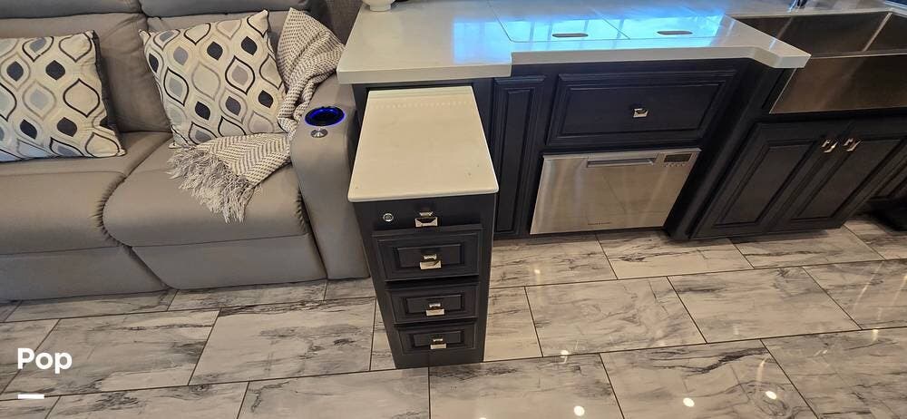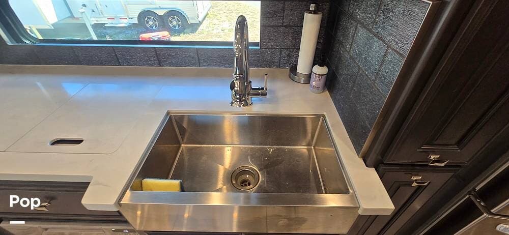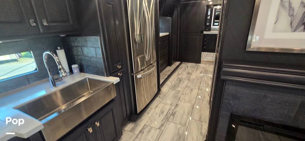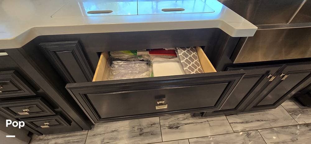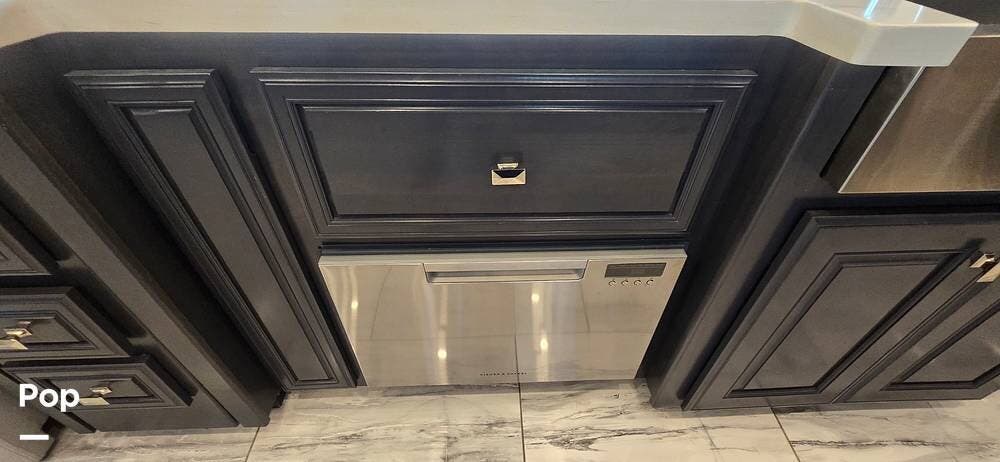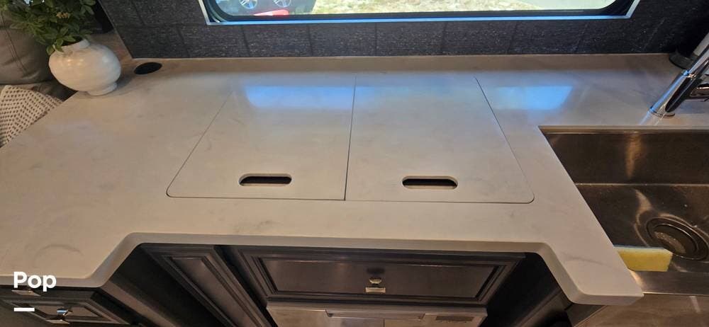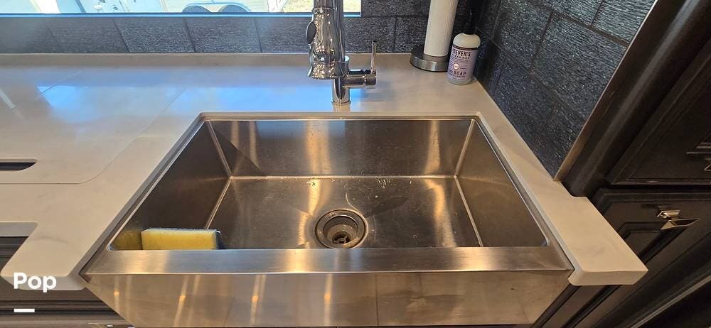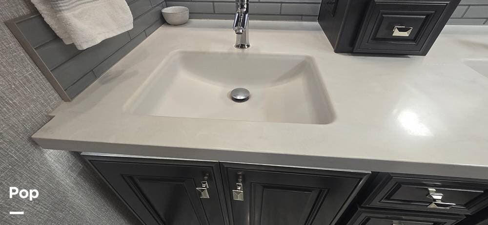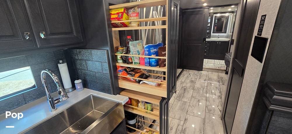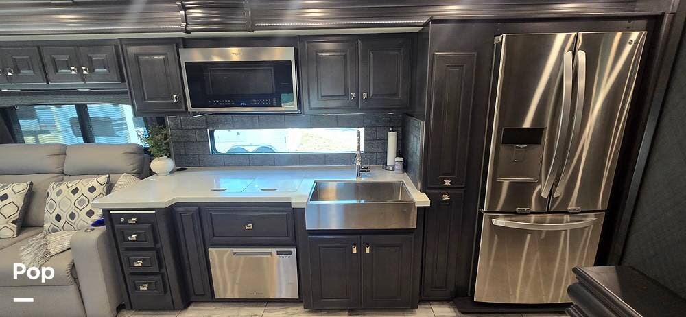 The kitchen is thoughtfully designed for both functionality and elegance. Generous solid surface countertop space provides ample room for meal preparation, complemented by abundant Sedona cabinetry for storage. The deep stainless-steel farm sink and residential-style appliances, including a Whirlpool Convection/ Microwave oven, Dometic True Induction 2-burner stove, Fisher and Paykel dishwasher, and a 3-door Residential LG refrigerator, make cooking on the road convenient and enjoyable.