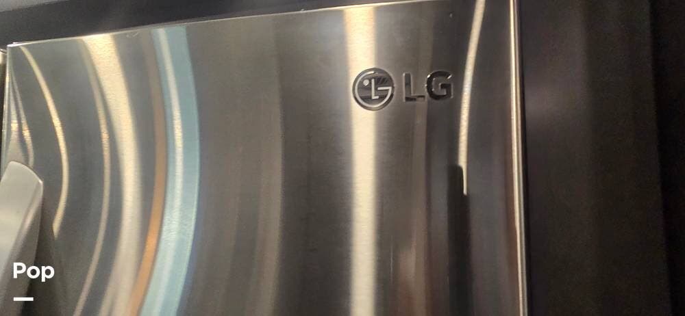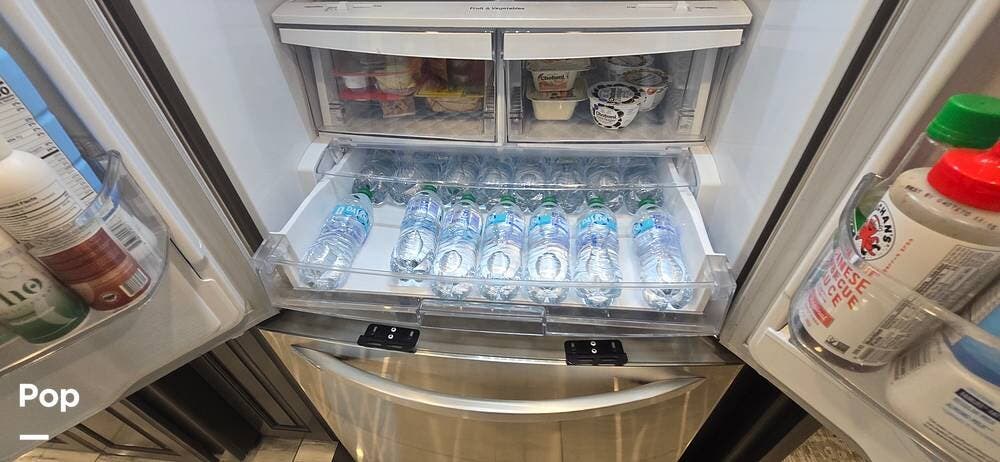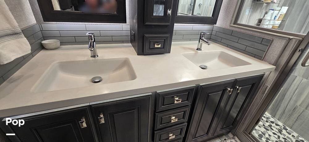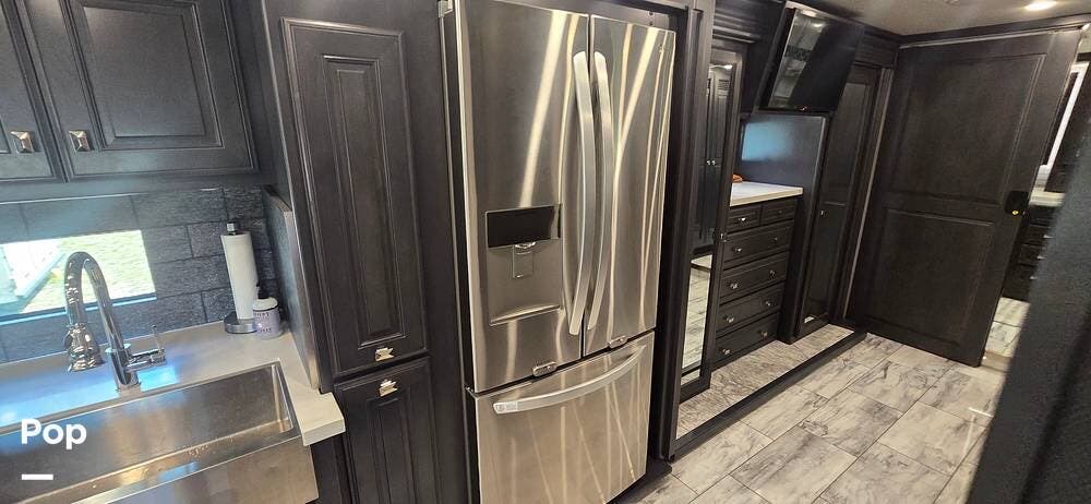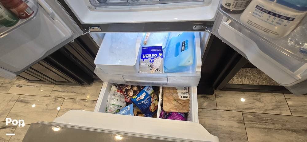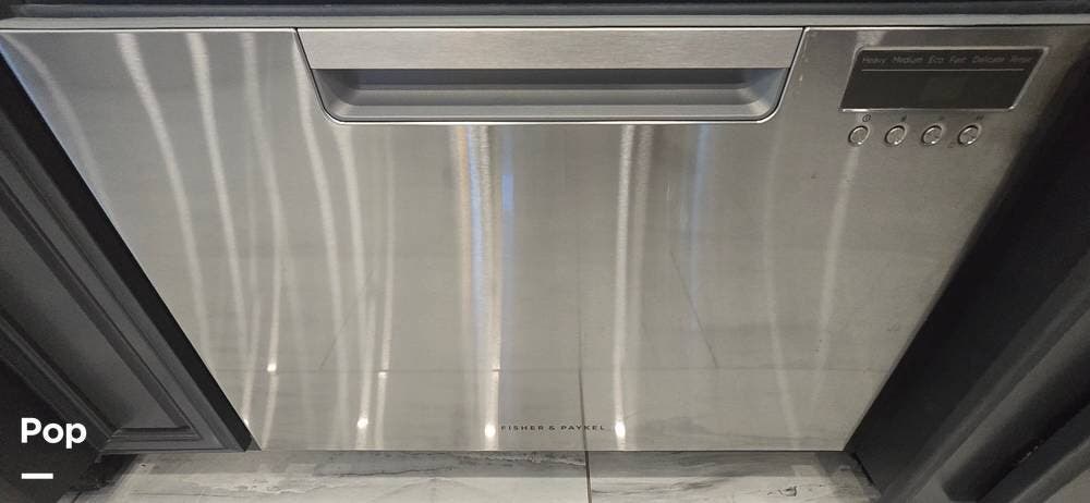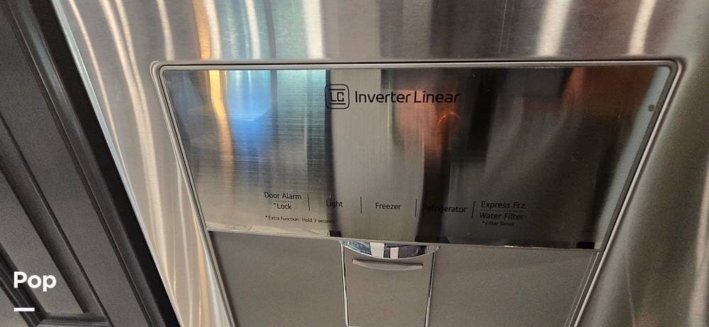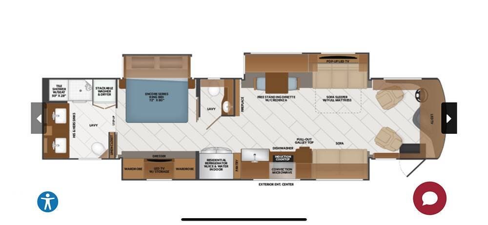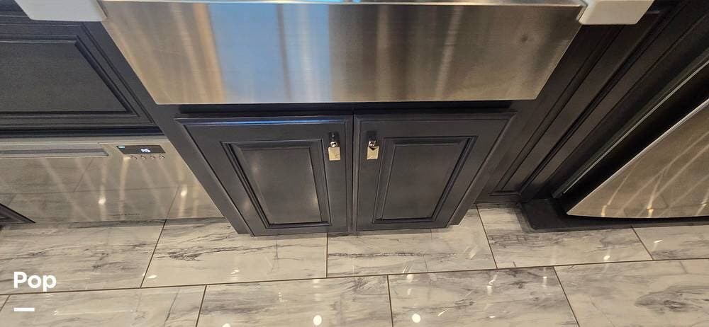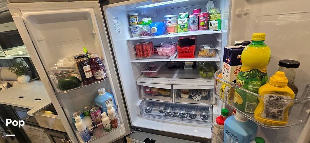 The kitchen is thoughtfully designed for both functionality and elegance. Generous solid surface countertop space provides ample room for meal preparation, complemented by abundant Sedona cabinetry for storage. The deep stainless-steel farm sink and residential-style appliances, including a Whirlpool Convection/ Microwave oven, Dometic True Induction 2-burner stove, Fisher and Paykel dishwasher, and a 3-door Residential LG refrigerator, make cooking on the road convenient and enjoyable.