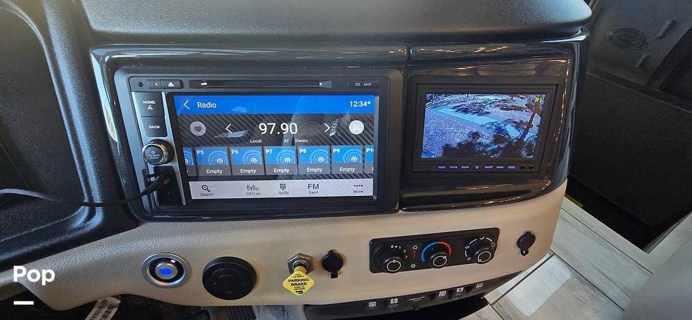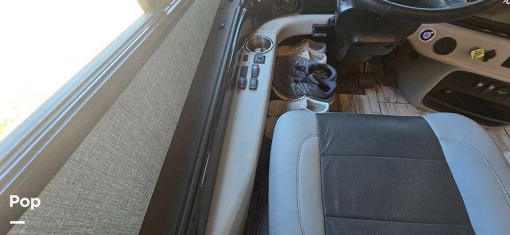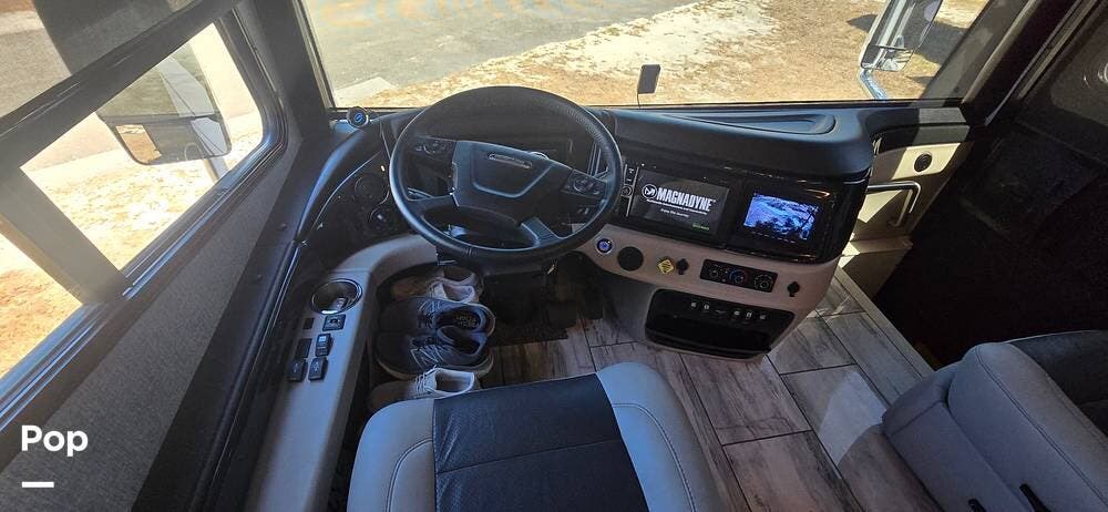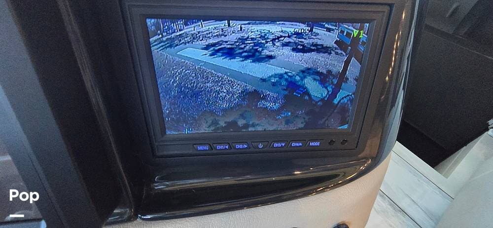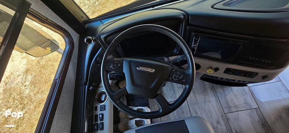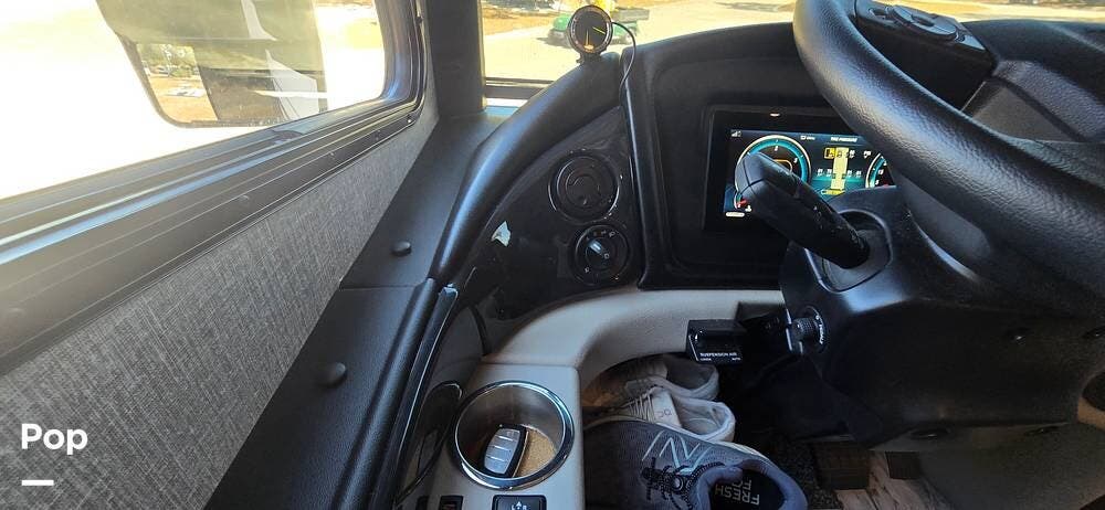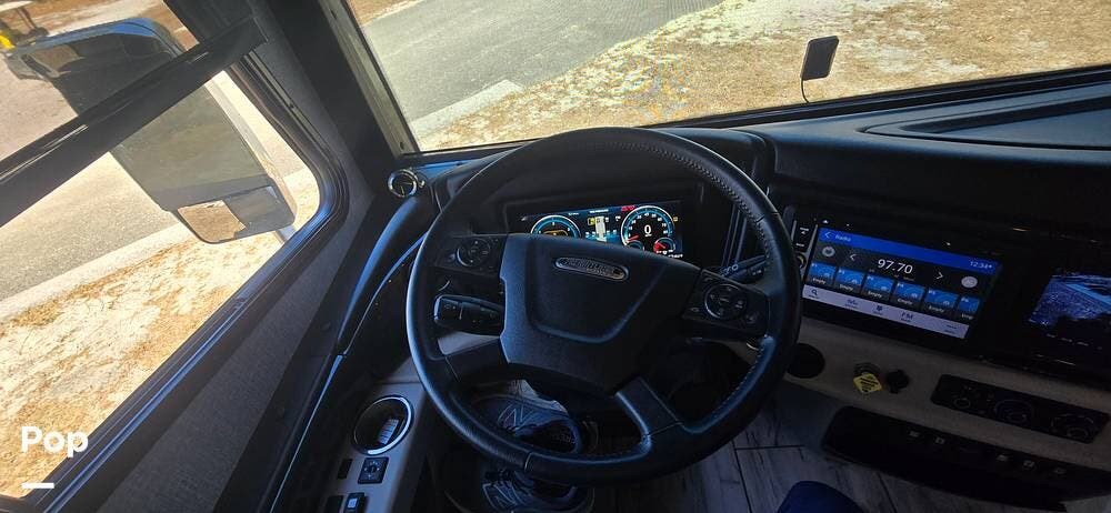 A modern dash layout places instrumentation, controls, and multimedia systems within easy reach, while the expansive panoramic windshield offers outstanding road visibility. Integrated rear and side-view camera systems enhance maneuvering confidence, and the overall design reflects Fleetwood's commitment to driver comfort, technology, and safety.