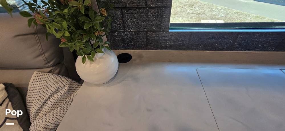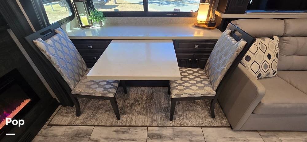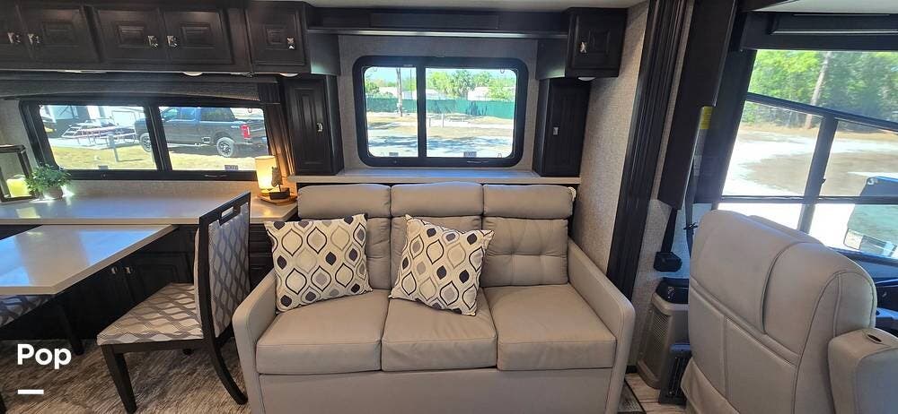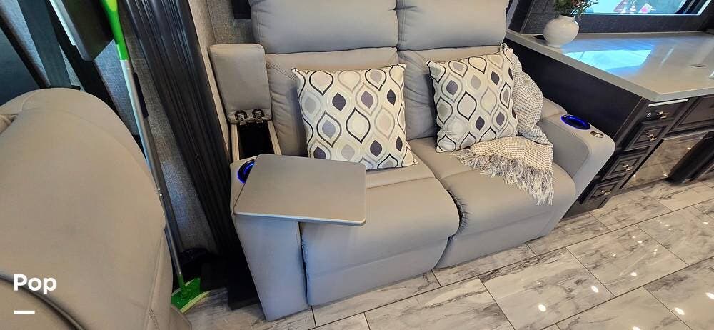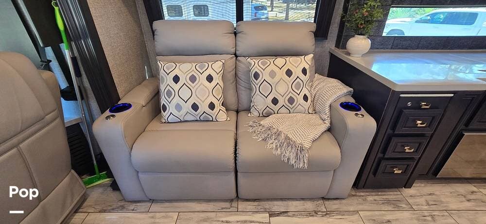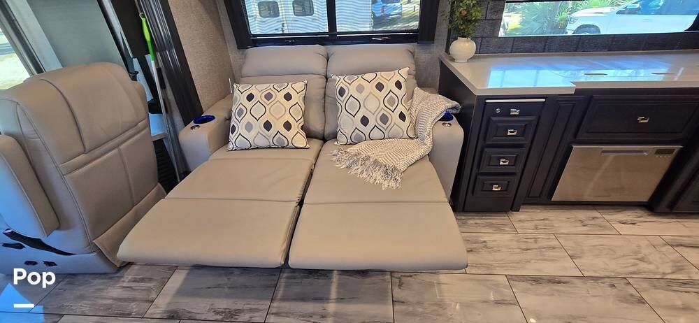 The expansive living area, enhanced by multiple slide-outs, offers an open-concept design ideal for entertaining or relaxing. Plush seating includes dual LED lid power recliners with table inserts, a sleeper sofa with a full mattress, and an entertainment center on a televator, while large panoramic windows fill the space with natural light, creating a bright and inviting setting.