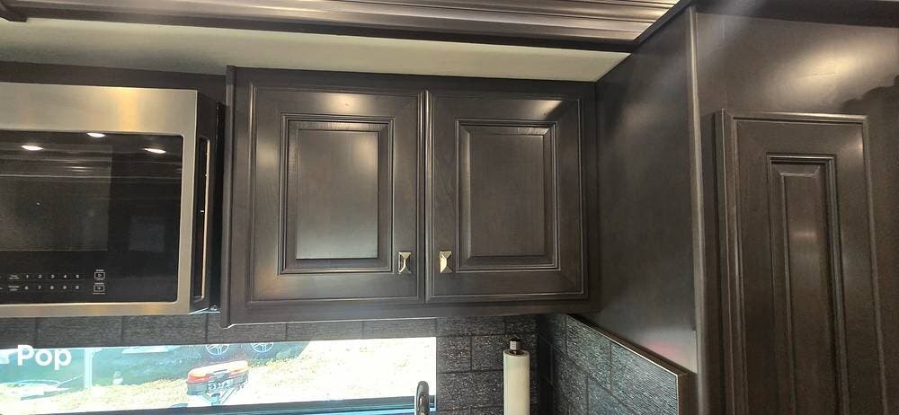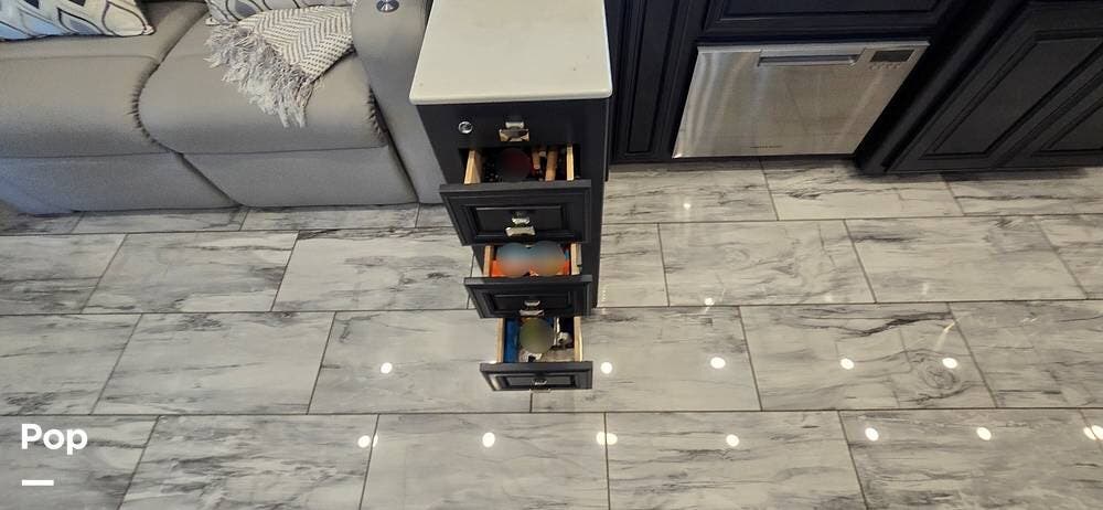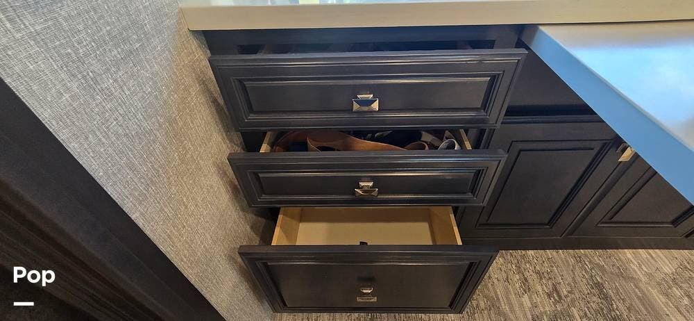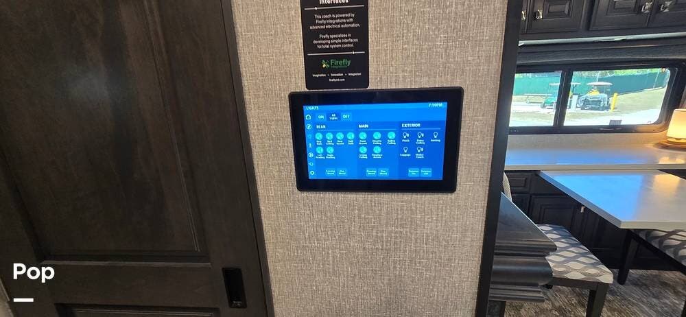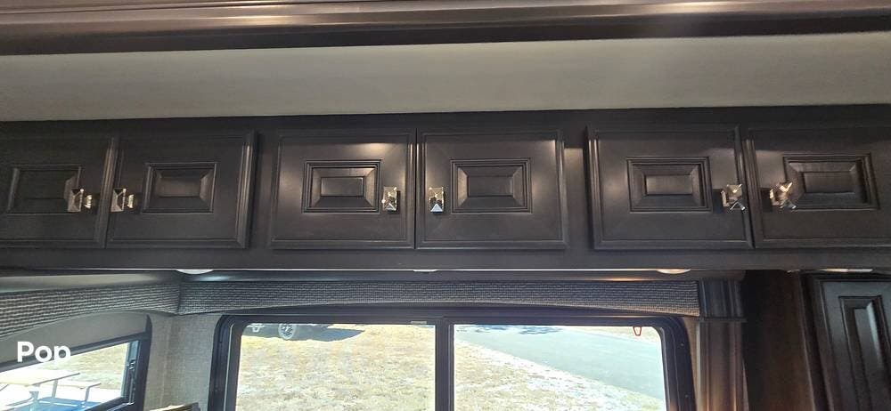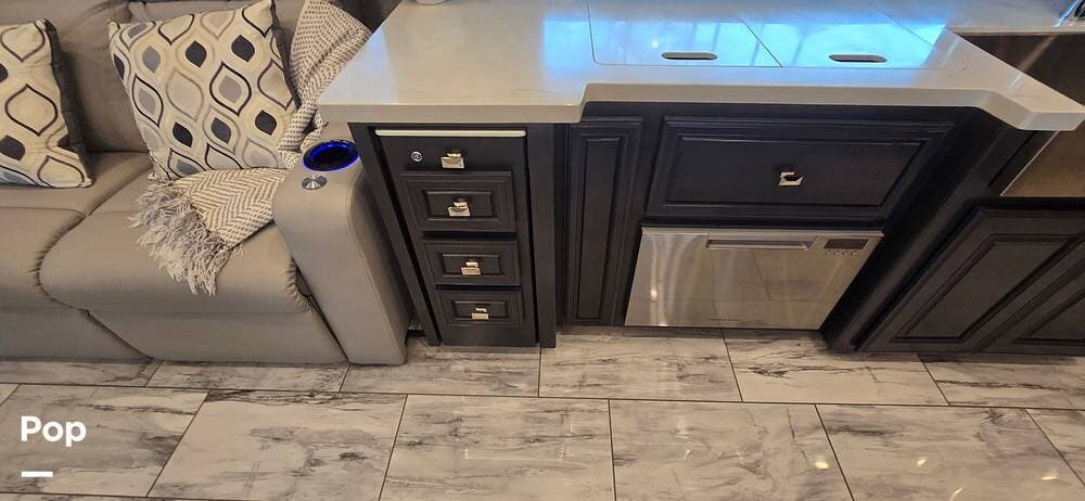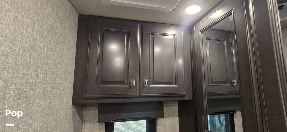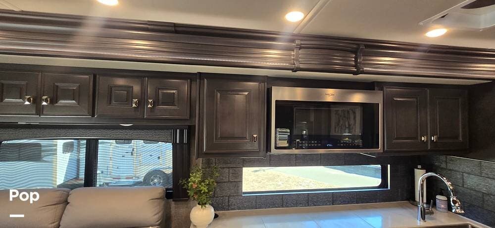 Step inside and you are welcomed by the elegant Signature interior color scheme, beautifully complemented by rich Sedona wood cabinetry. The warm tones and detailed craftsmanship create a sophisticated residential atmosphere throughout the coach. Solid surface countertops, designer lighting, and premium flooring further enhance the upscale feel.