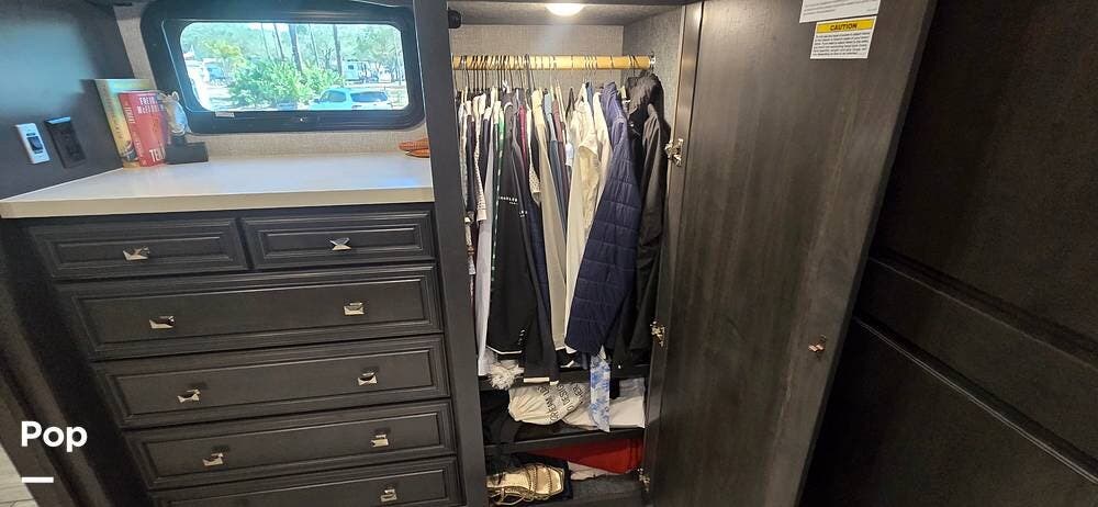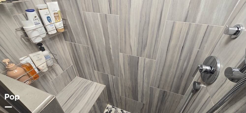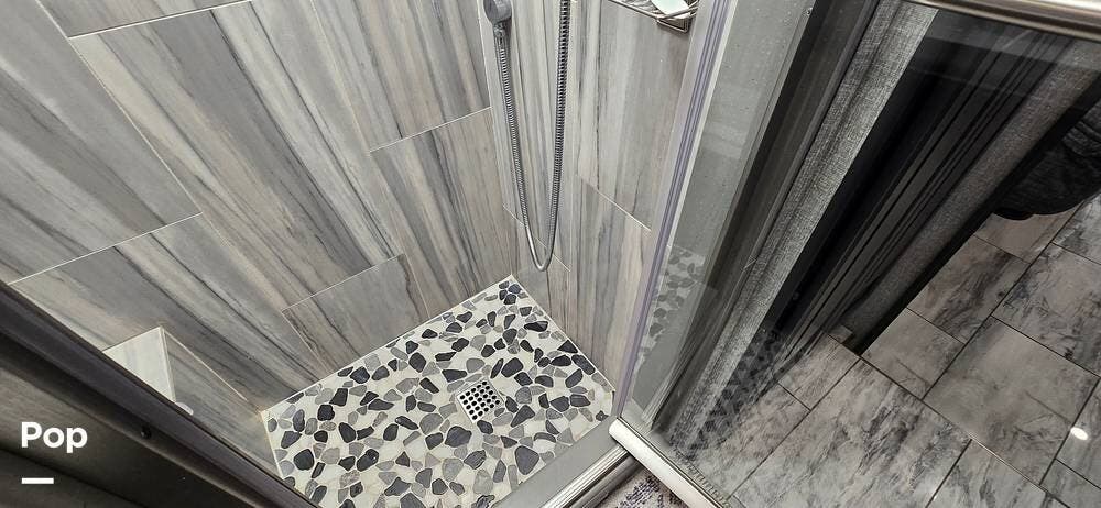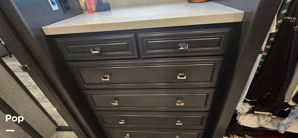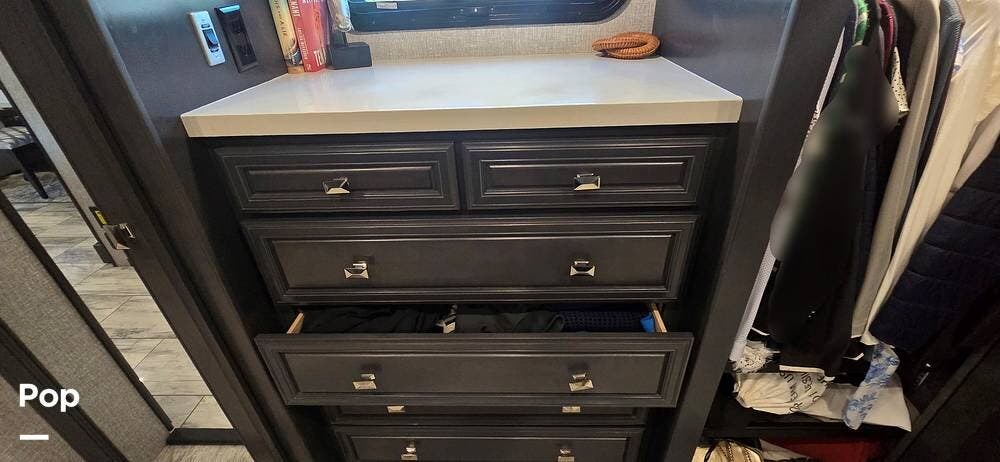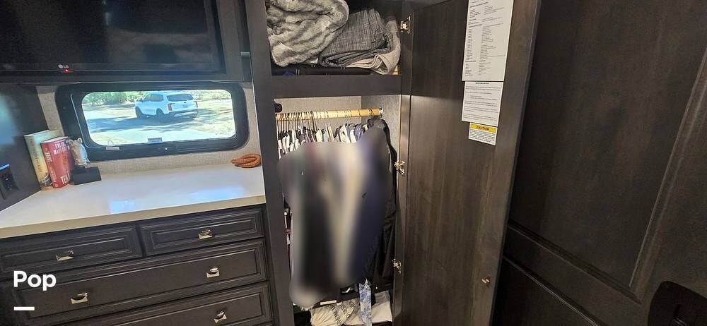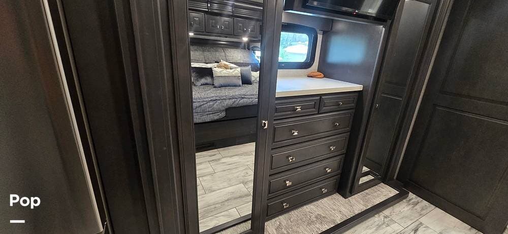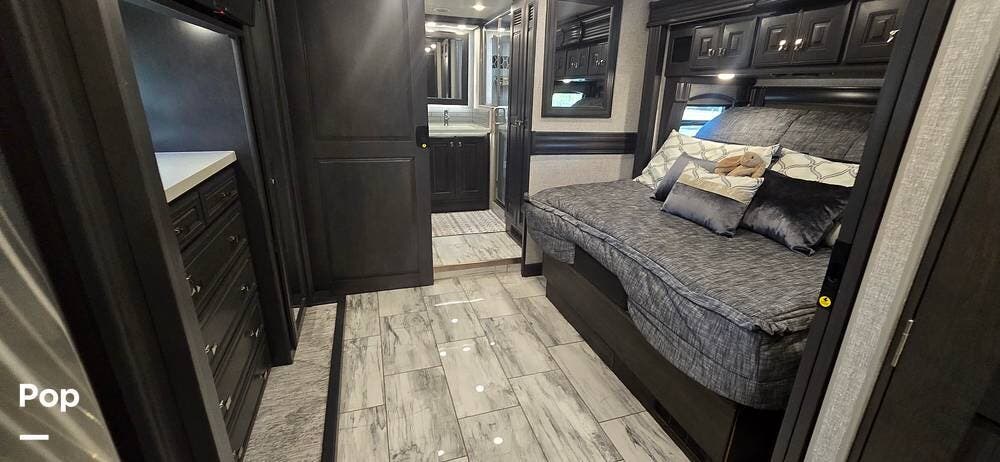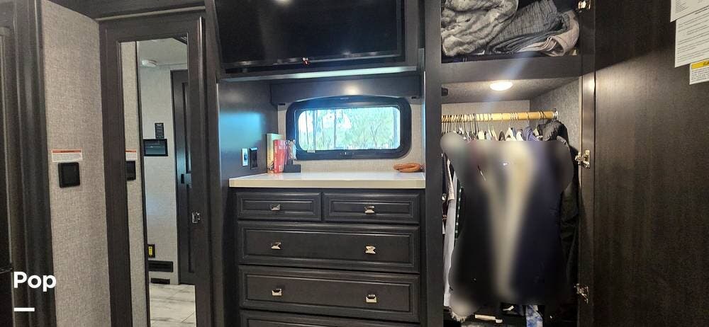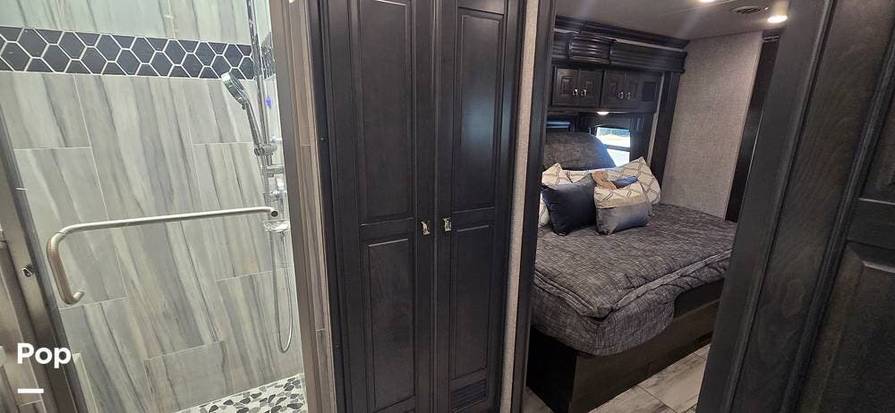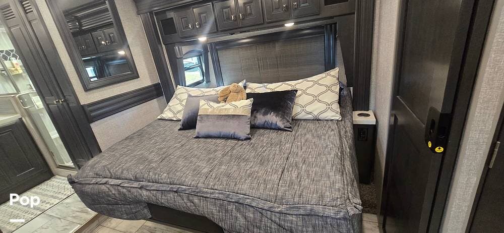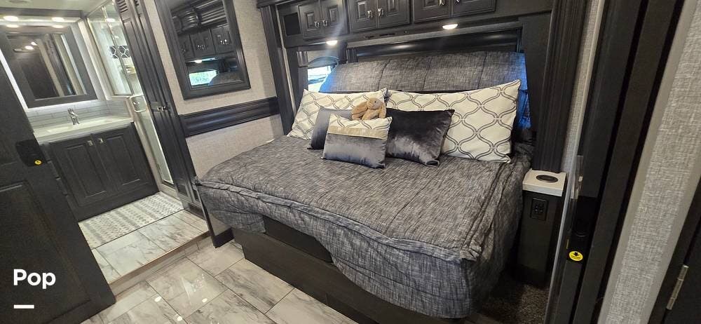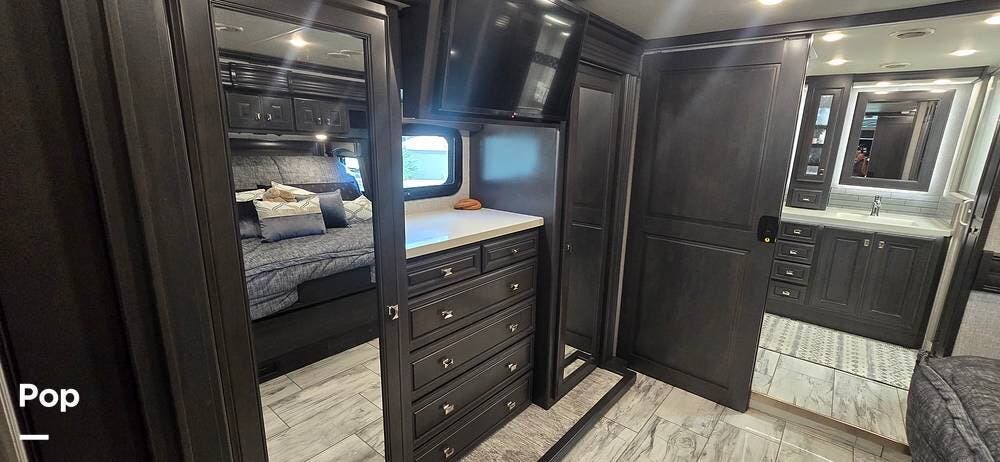 The master suite provides a private retreat with a walk-around king bed that can be used as a recliner with onboard power, substantial wardrobe storage, a dresser, and a mounted television for evening relaxation. The spacious rear bathroom features a large shower, a solid-surface vanity, a porcelain toilet, and generous linen storage, delivering true residential comfort wherever your travels take you.