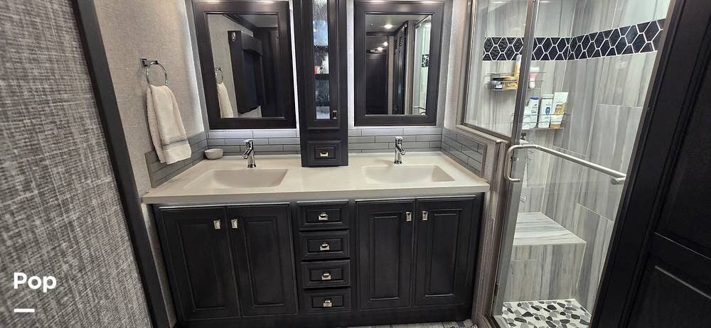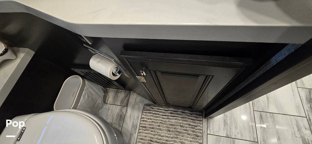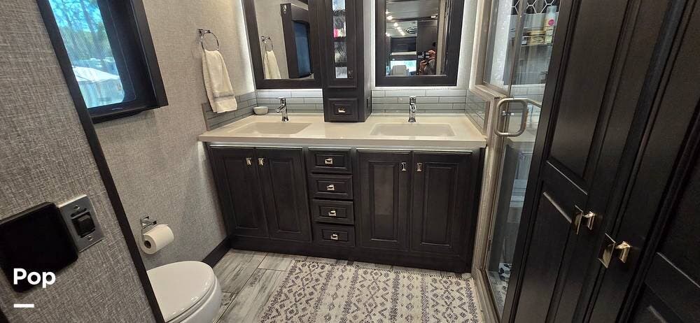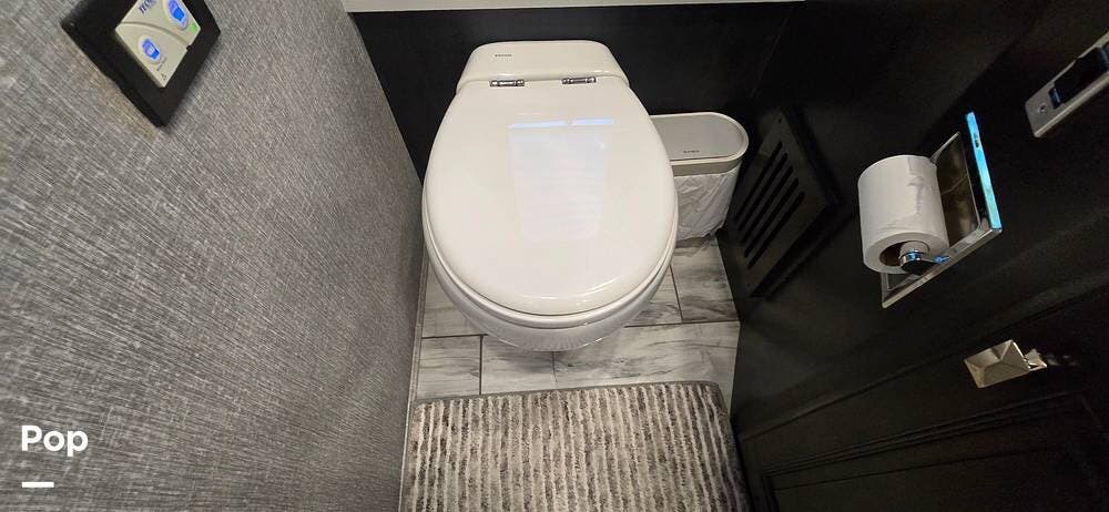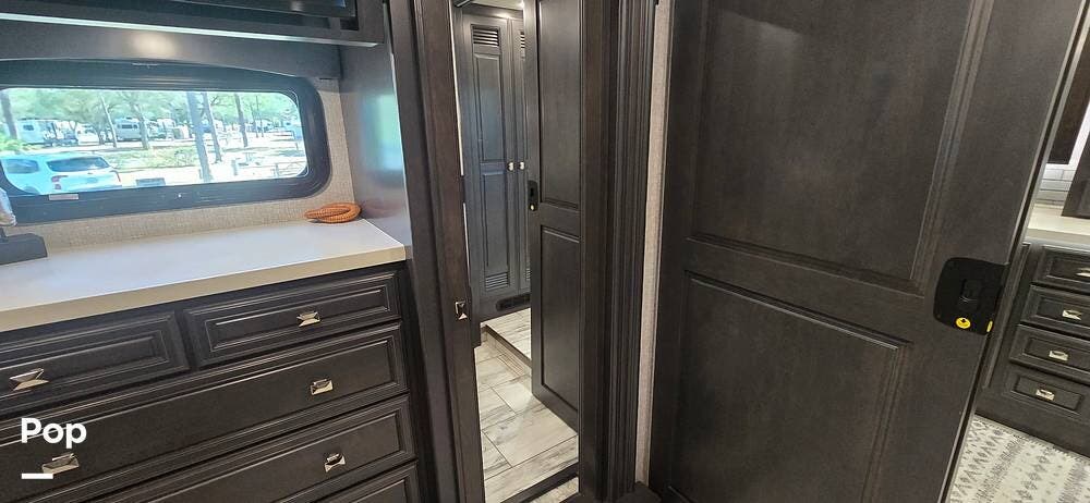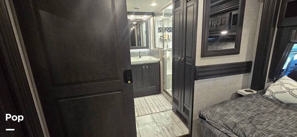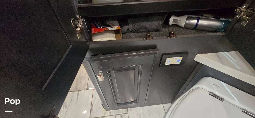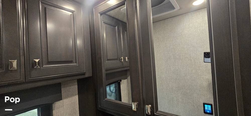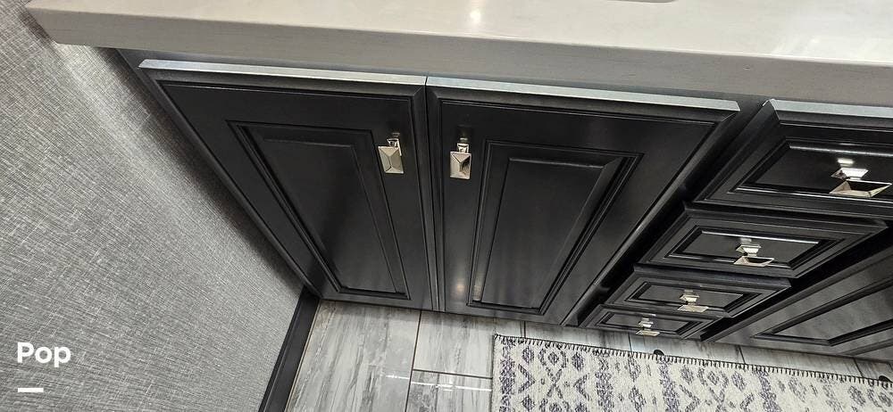 A highly desirable feature of the 40M floorplan is the mid-coach half bath, offering added convenience and privacy for guests. This secondary bath allows visitors to access restroom facilities without entering the master suite, making the coach especially comfortable for entertaining or traveling with family and friends.