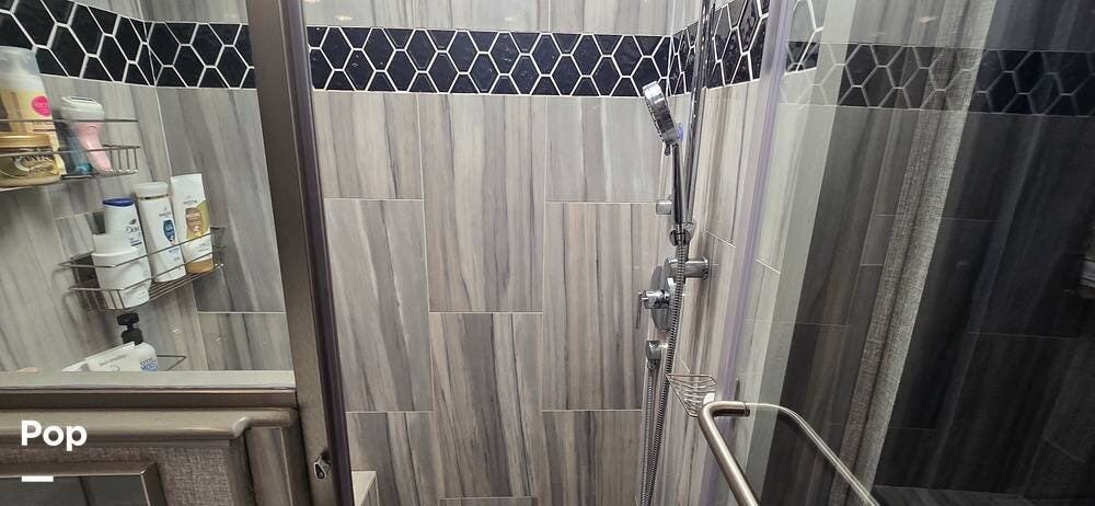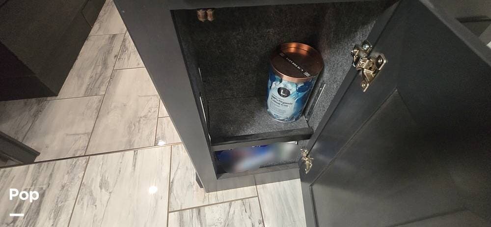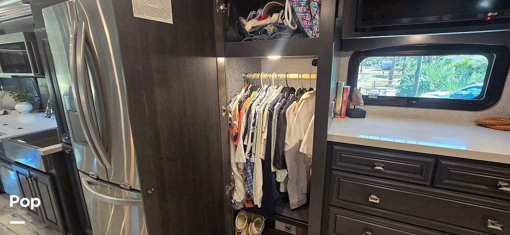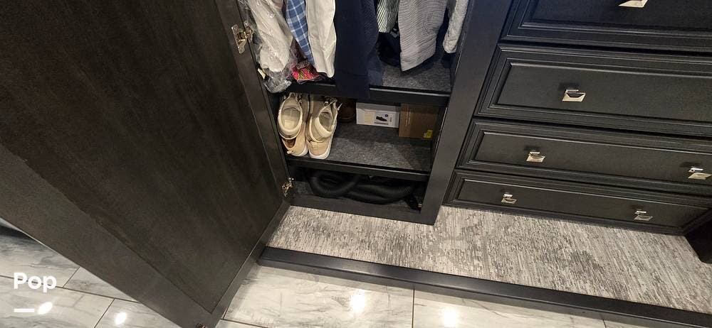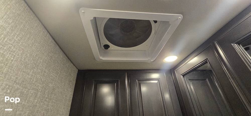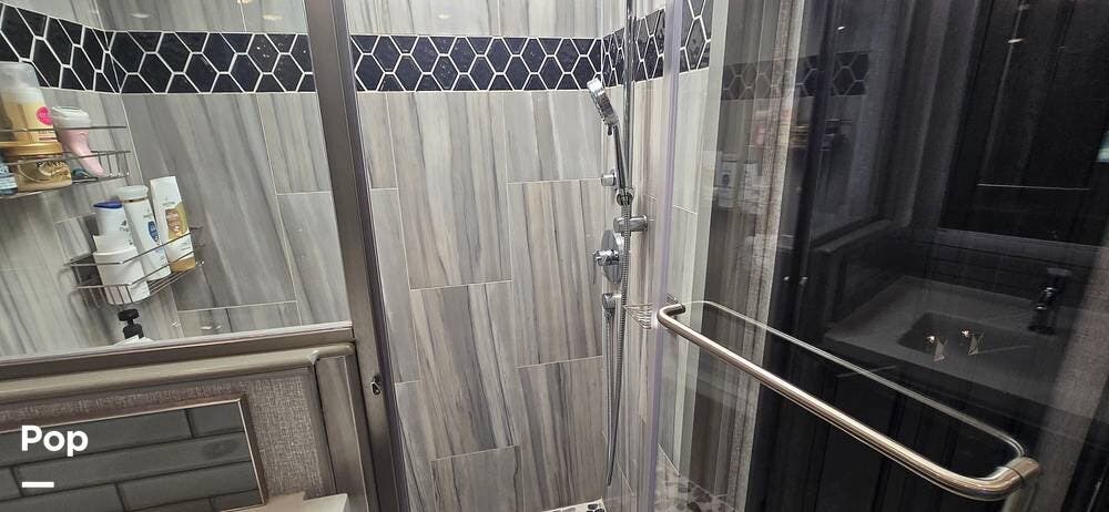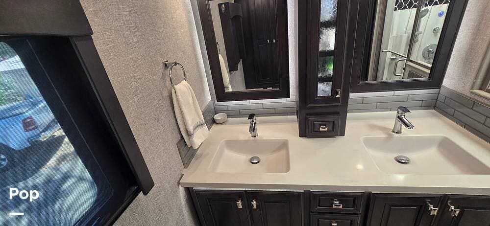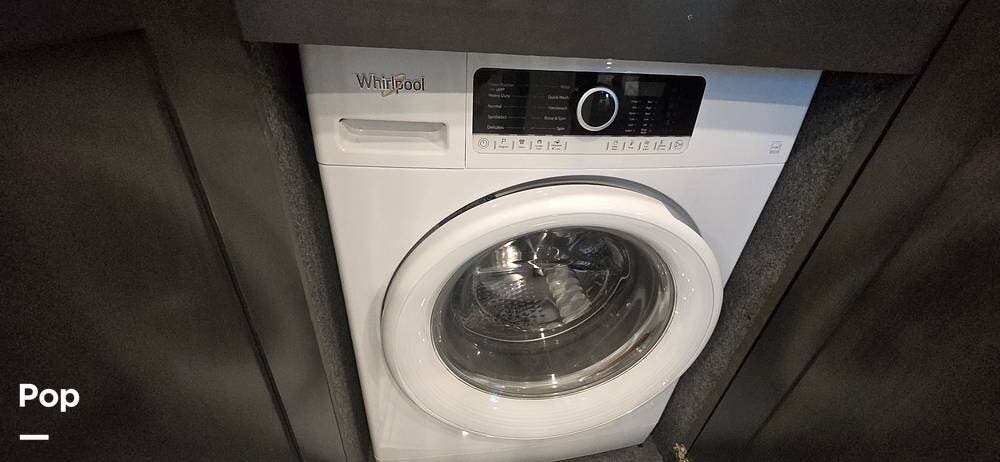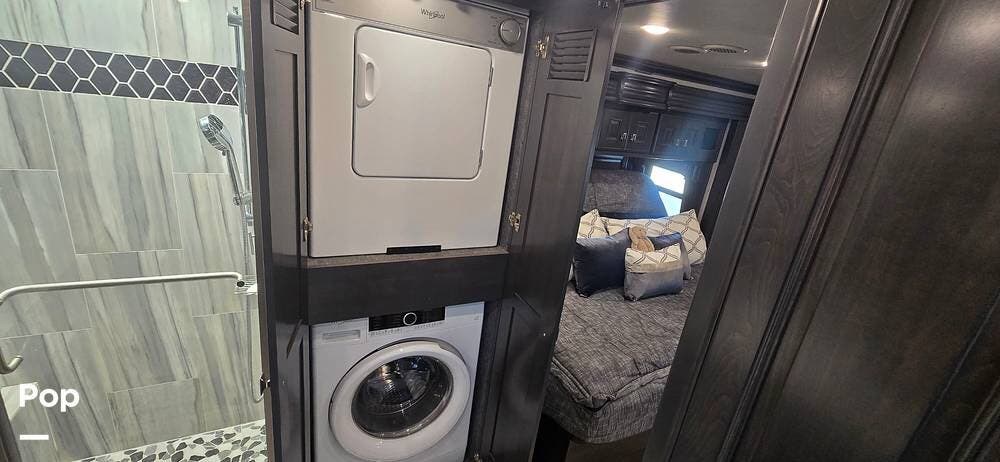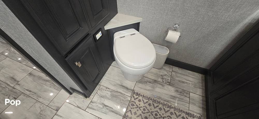 A highly desirable feature of the 40M floorplan is the mid-coach half bath, offering added convenience and privacy for guests. This secondary bath allows visitors to access restroom facilities without entering the master suite, making the coach especially comfortable for entertaining or traveling with family and friends.