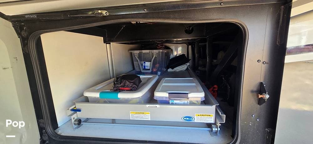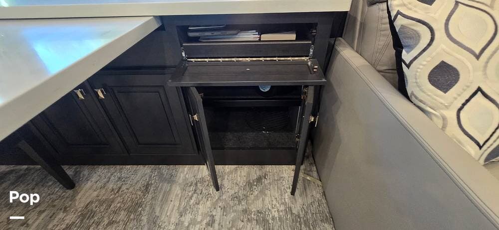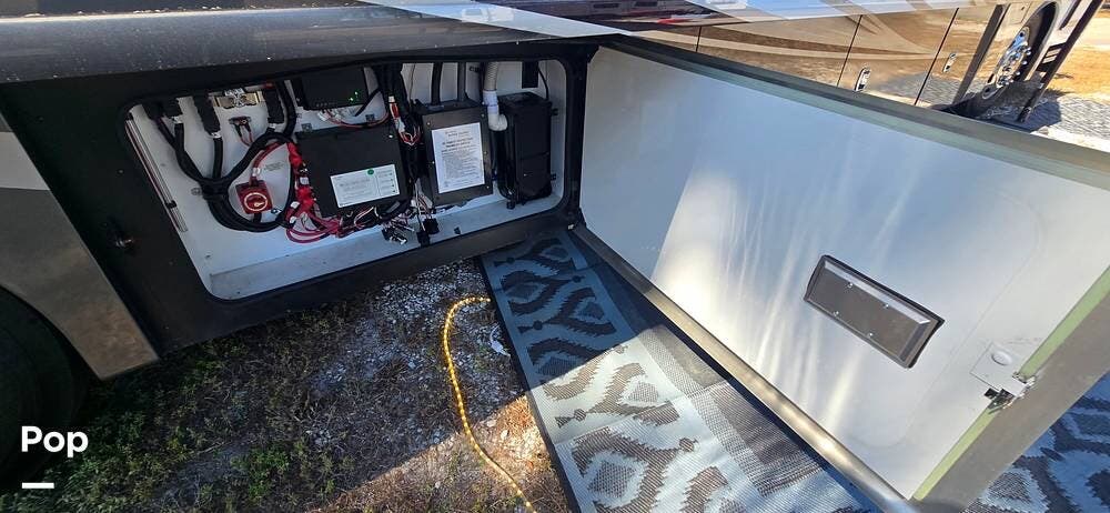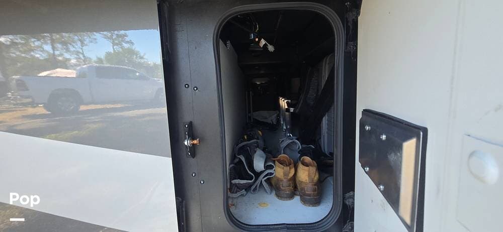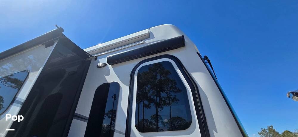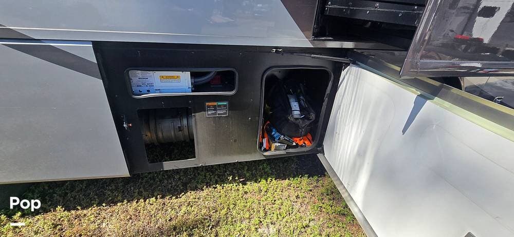 Large Girard power awnings create an inviting outdoor living space, especially with the outdoor Samsung TV and Soundbar, while expansive basement storage compartments provide ample cargo capacity, along with a portable, electric-powered exterior freezer/refrigerator for extended trips and full-time travel.