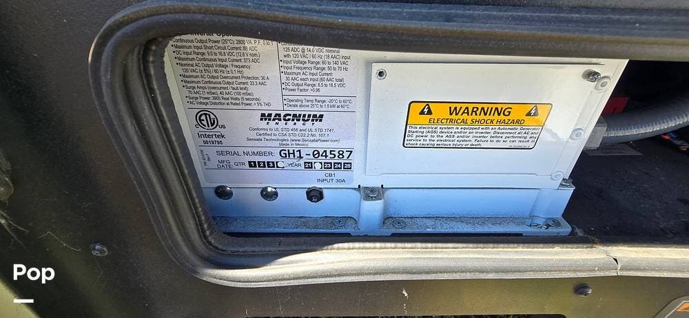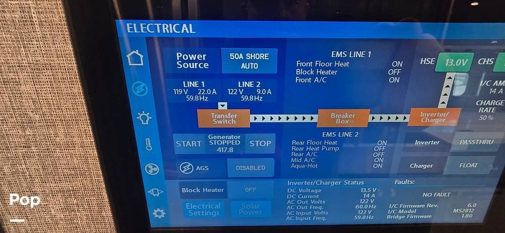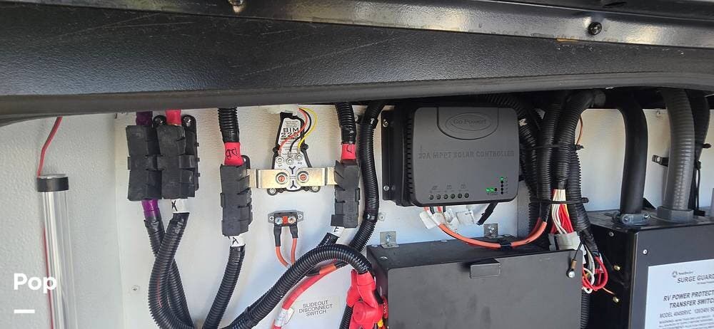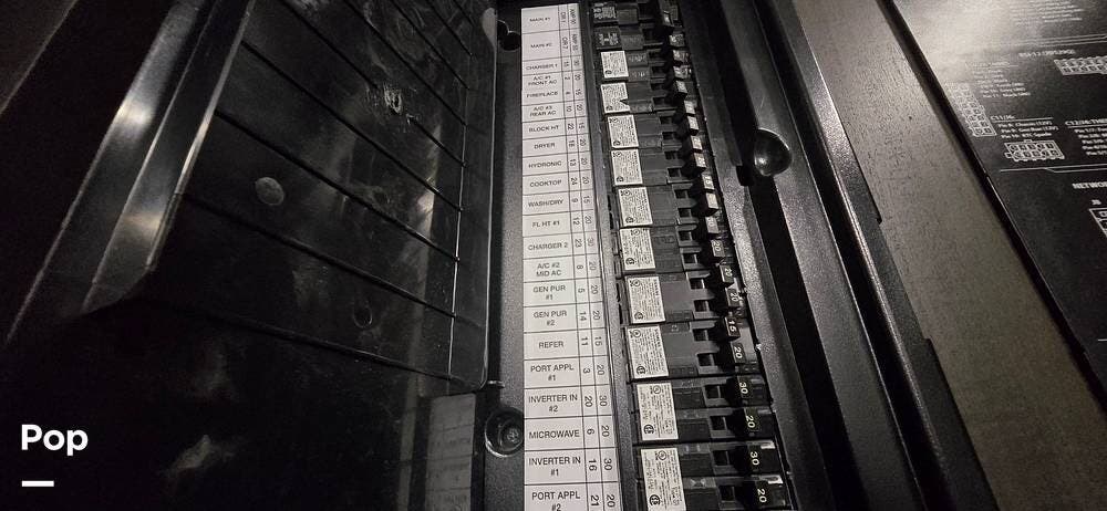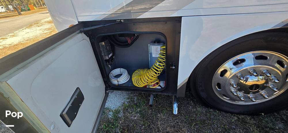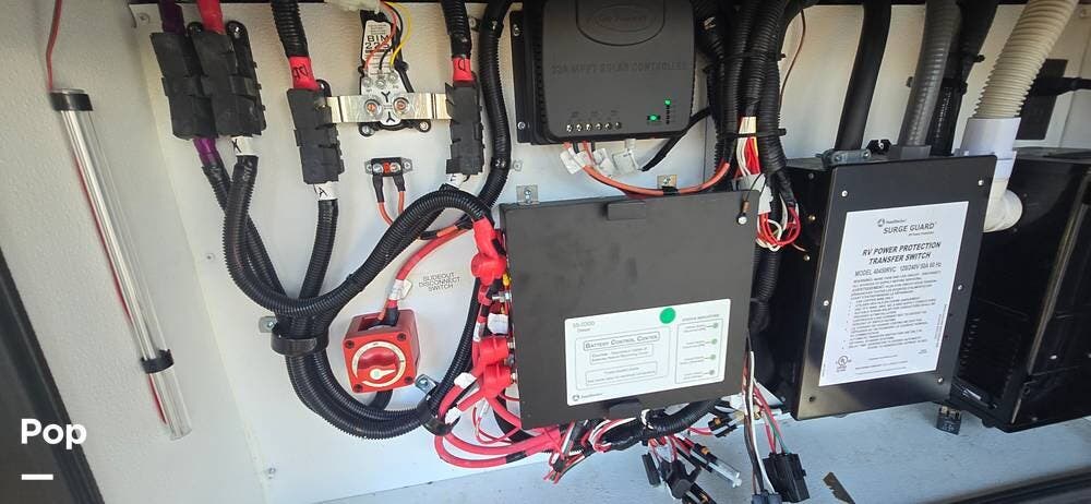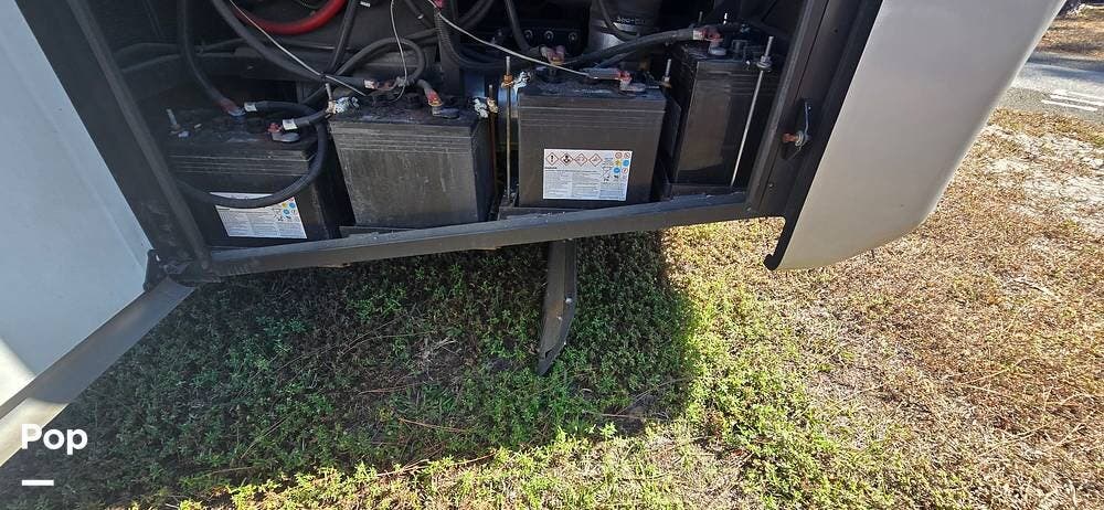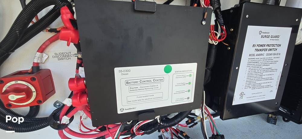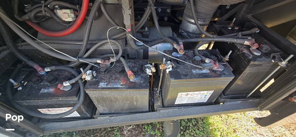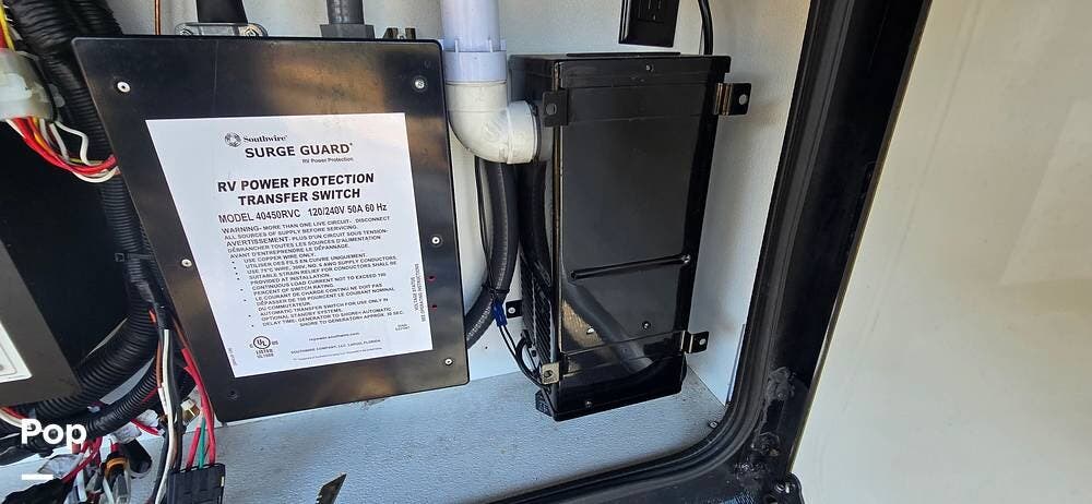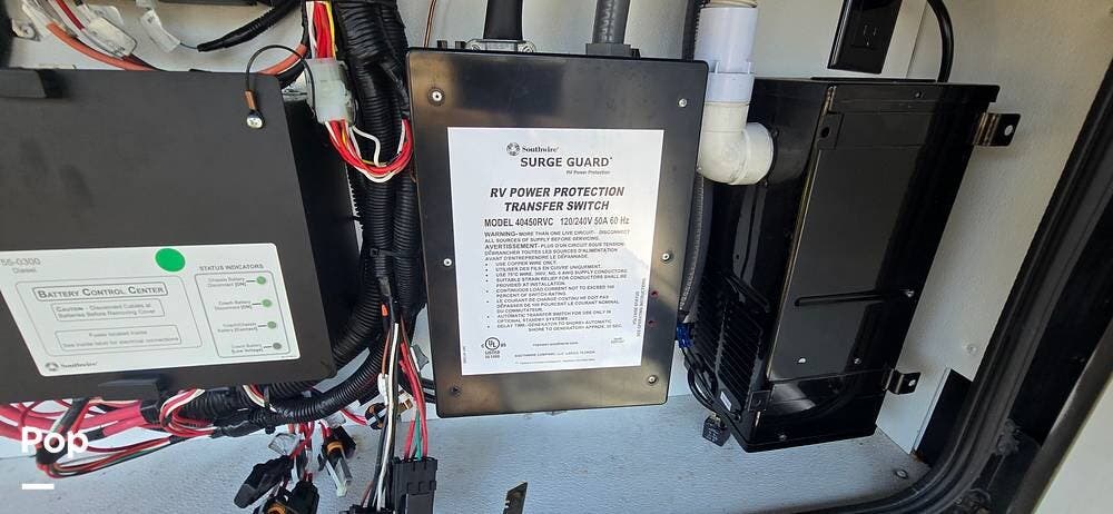 Powering the coach off-grid is an 8,000-watt Onan Quiet Diesel generator, designed for reliable and quiet performance. This unit features an automatic generator start system, offering peace of mind by activating when needed to maintain interior systems. The generator is mounted on a slide-out tray for easy access and serviceability, simplifying routine maintenance. With ample output, it confidently powers the coach's three 15,000 BTU roof-mounted air conditioners, ensuring cool, consistent comfort even in demanding climates.